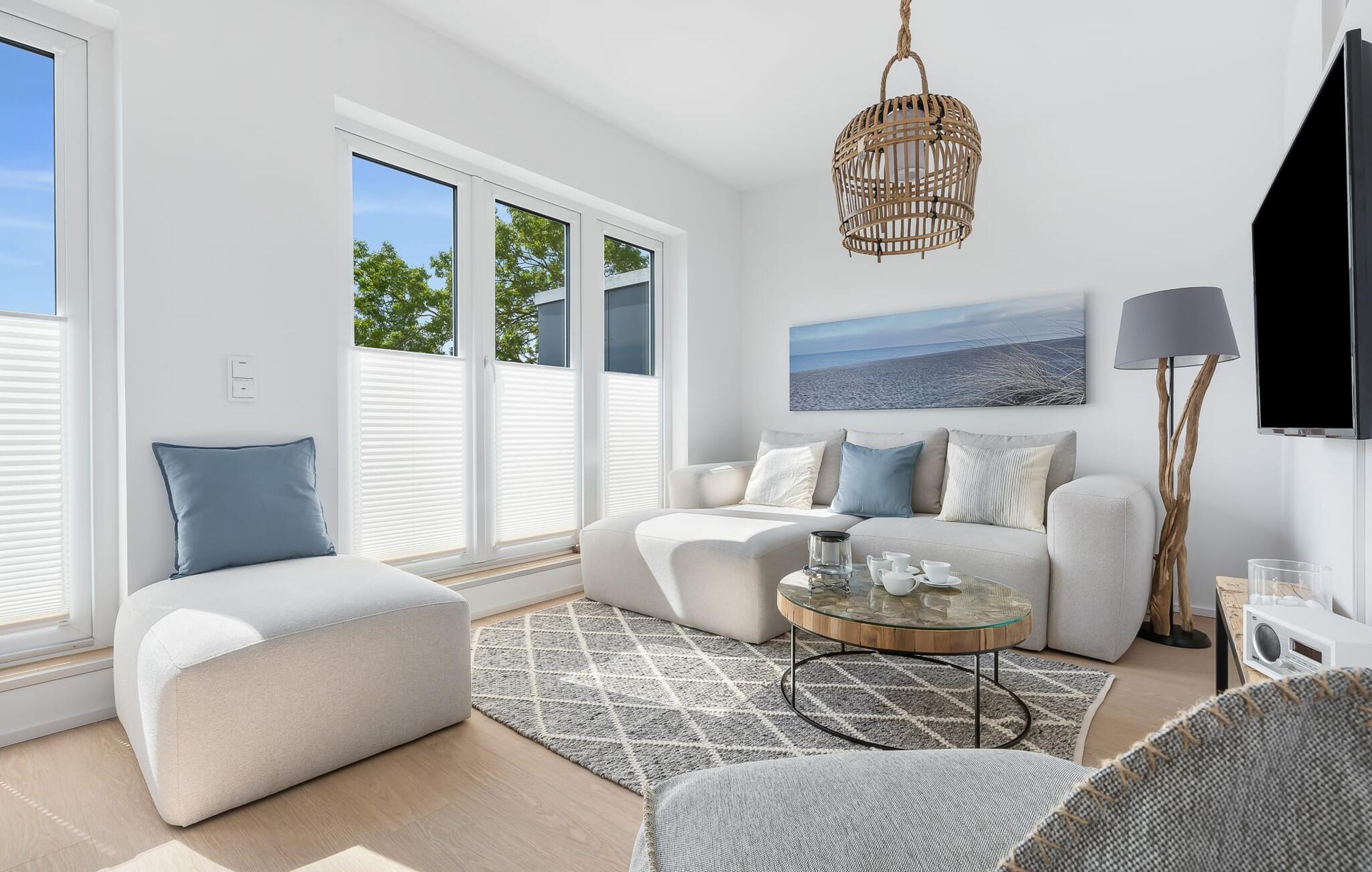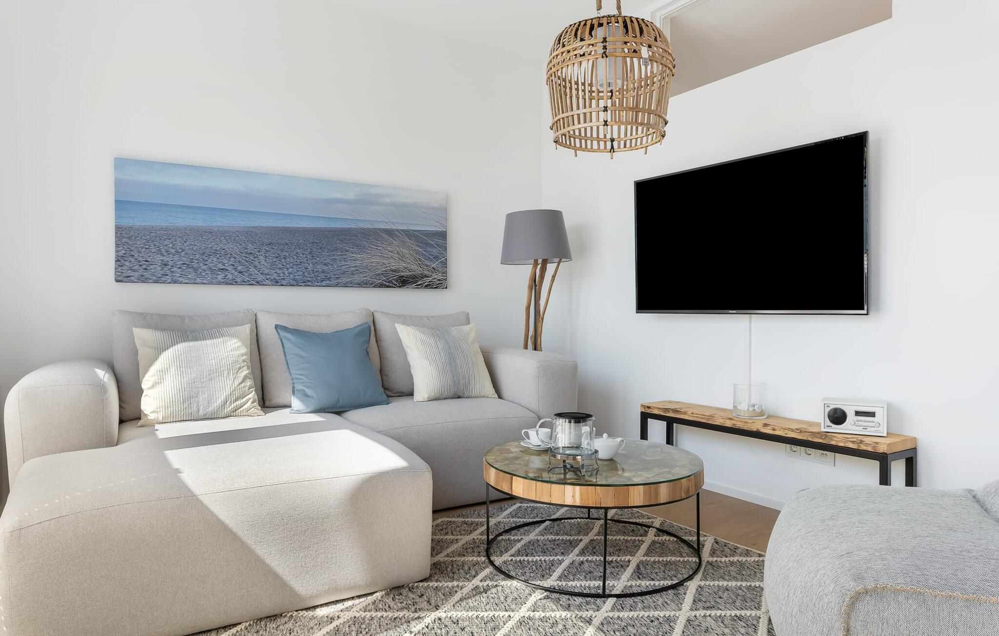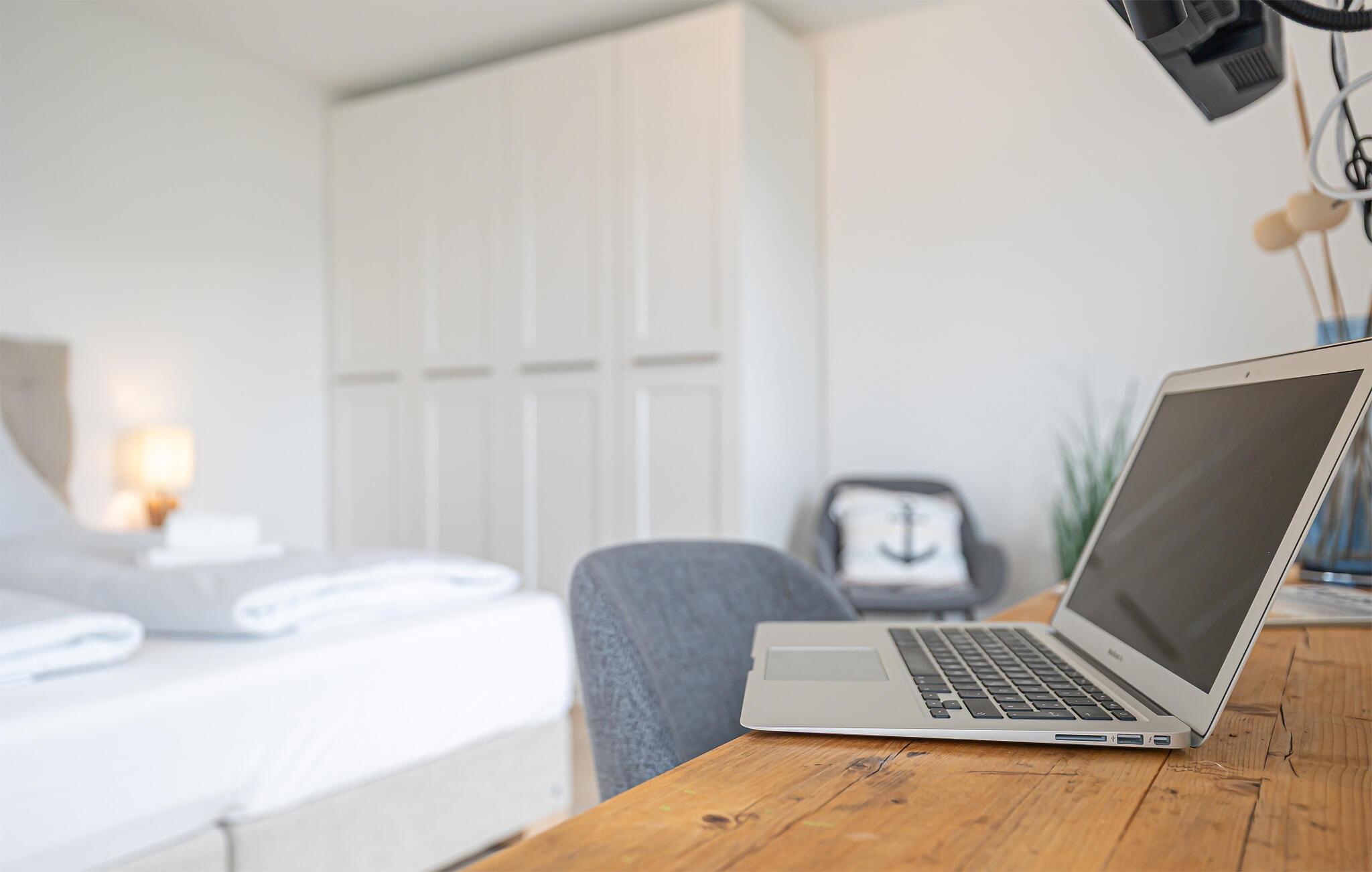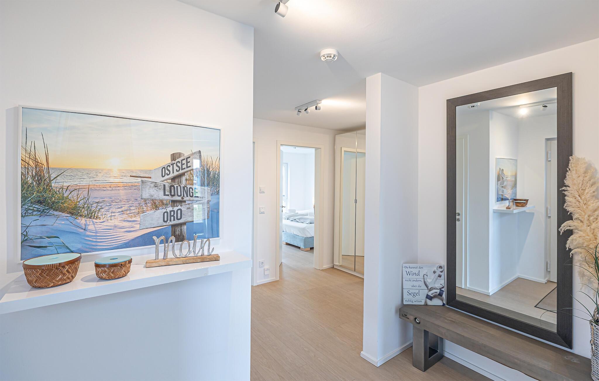 Beim Betreten der Ferienwohnung im ersten Obergeschoss, beginnt vom ersten Moment an die Entschleunigung. Es eröffnet sich direkt im Ruhebereich der Wohnung. In dieser Etage befinden sich die drei Schlafzimmer, egal für welches ihr euch entscheidet, erholsamer Schlaf ist euch sicher. Zwei Schlafzimmer sind mit Boxspring-Doppelbetten und einem Fernseher ausgestattet. Das dritte Schlafzimmer bietet mit zwei einzelnen Boxspringbetten weitere Schlafmöglichkeiten. Die OSTSEELOUNGE ORO ermöglicht nicht nur entspannte Urlaubstage, sondern auch die Möglichkeit des Homeoffices. Ohne Verzicht auf Komfort wurden 2 Arbeitsplätze in das Gesamtkonzept der Ferienwohnung eingebettet.