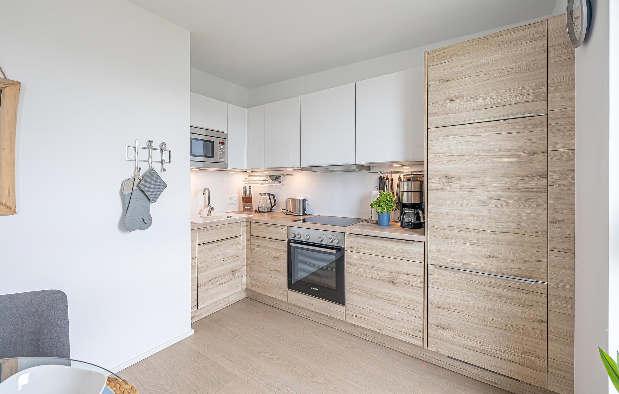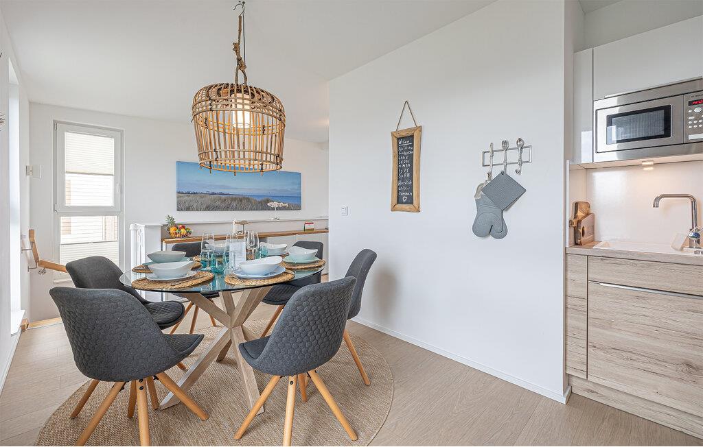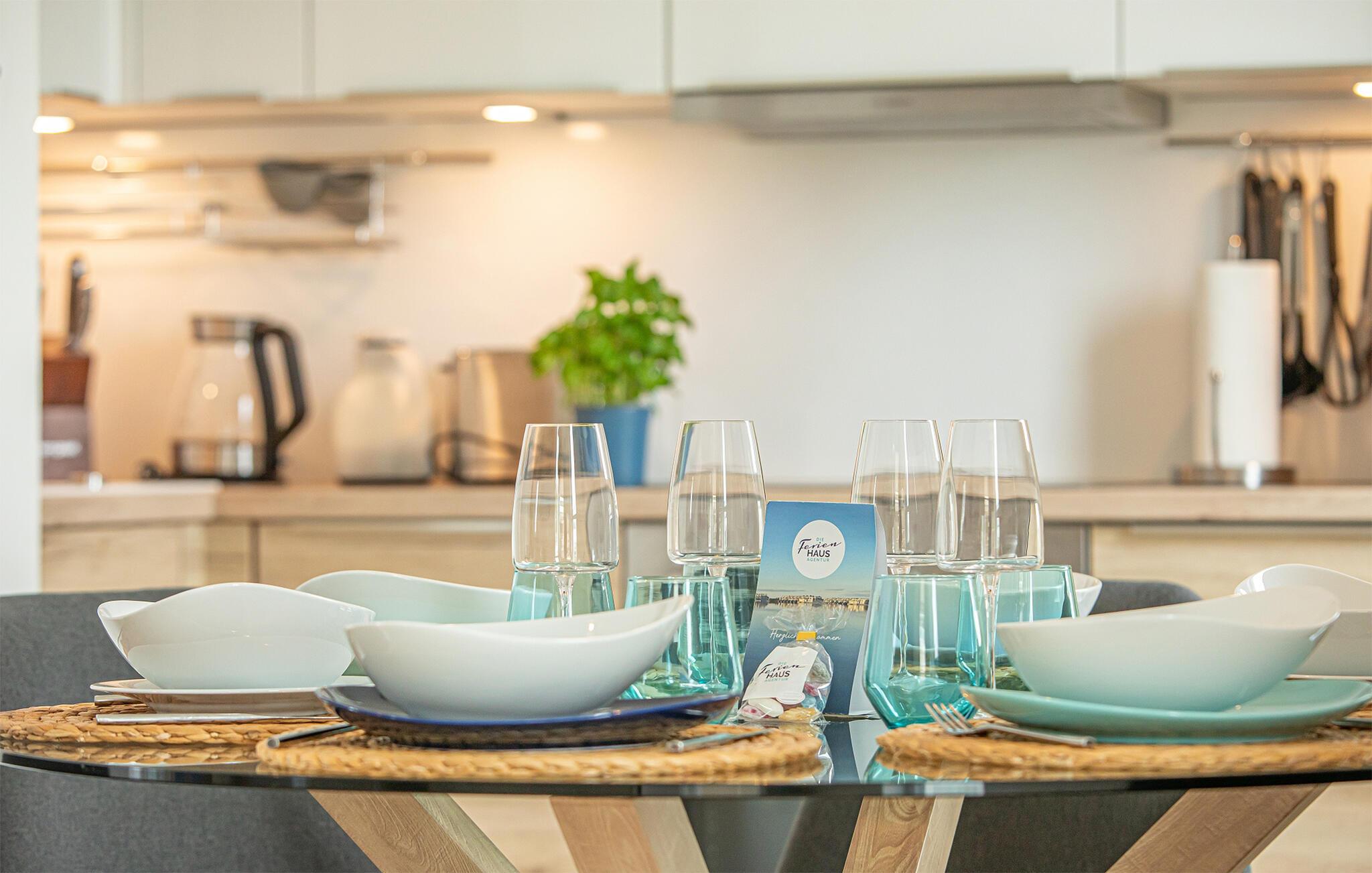 Die integrierte Küche, mit einem Essplatz für 6 Personen, ist perfekt ausgestattet. Auf der großen Terrasse mit ihrer Süd-West-Ausrichtung und einem Traumblick könnt ihr gesellige Grillabende veranstalten, gemütlich im Strandkorb verweilen oder auf der Liege die Sonne genießen.