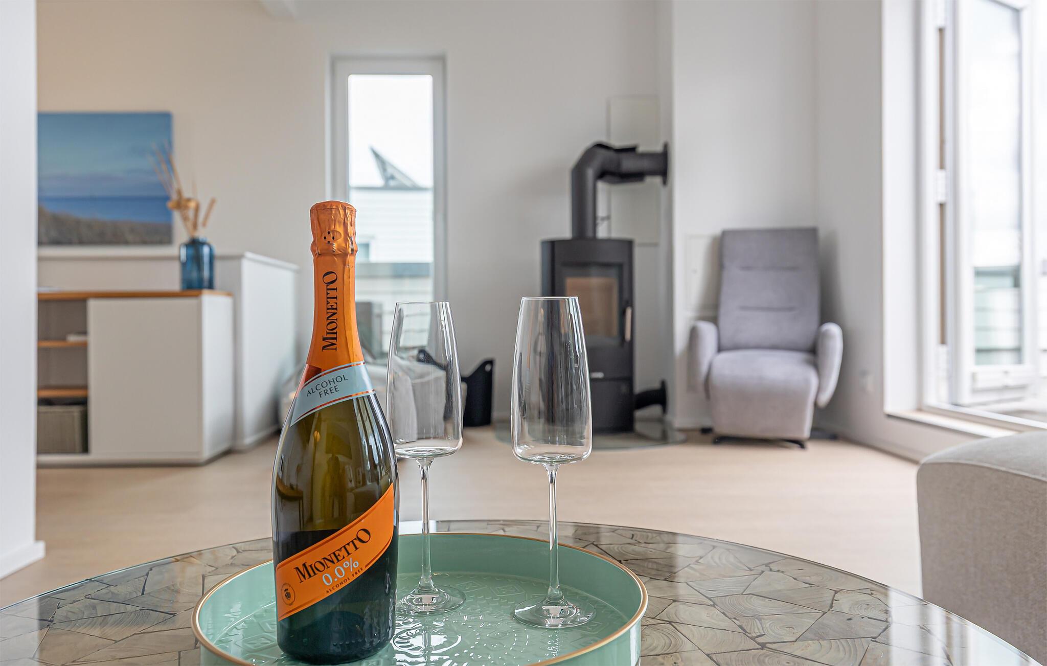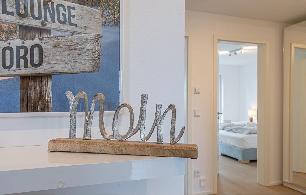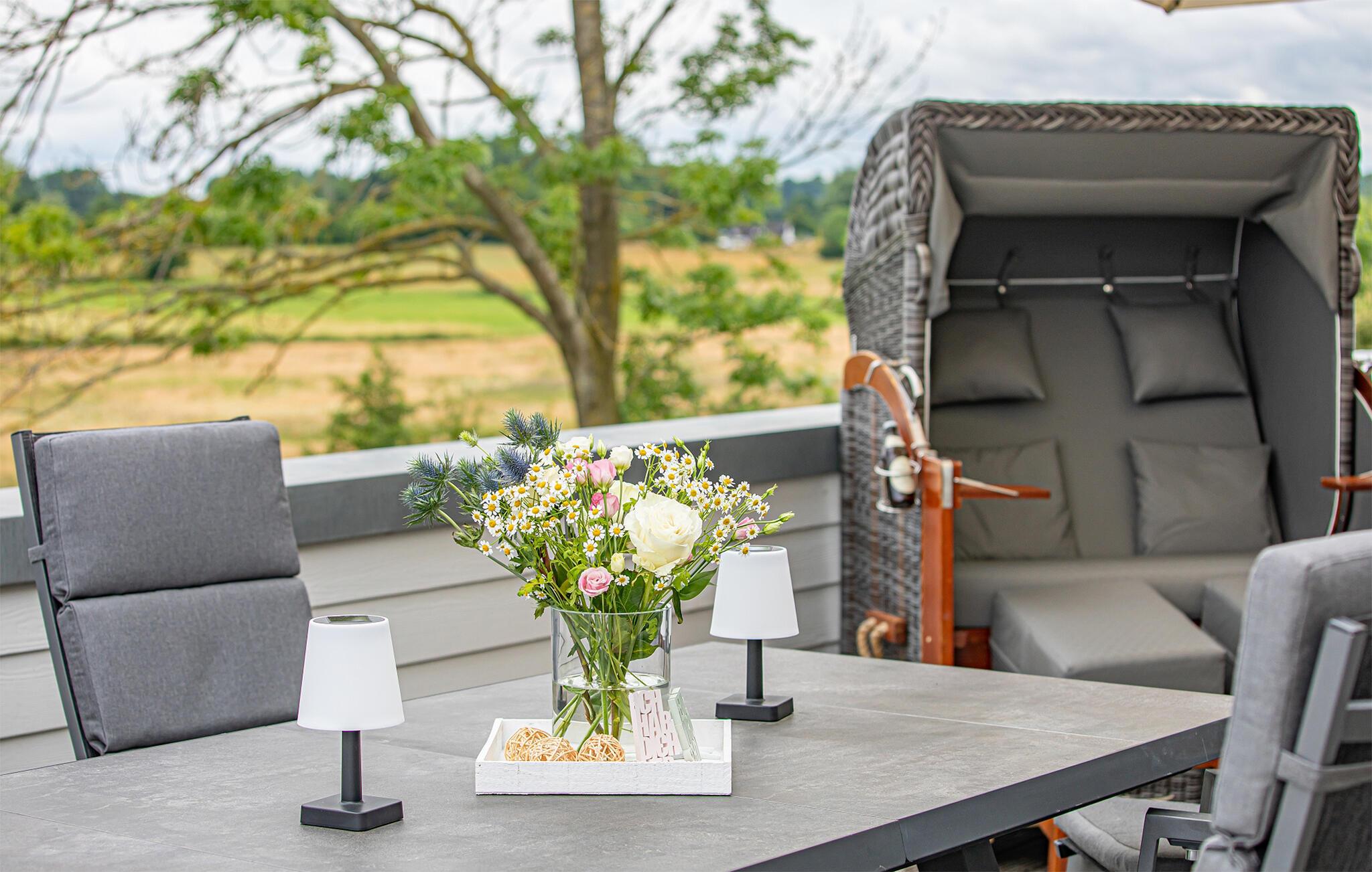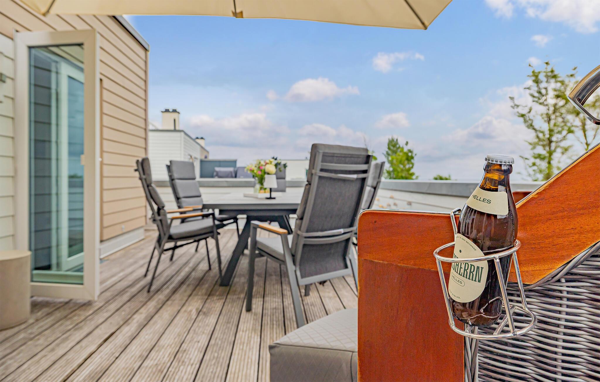 Die integrierte Küche, mit einem Essplatz für 6 Personen, ist perfekt ausgestattet. Auf der großen Terrasse mit ihrer Süd-West-Ausrichtung und einem Traumblick könnt ihr gesellige Grillabende veranstalten, gemütlich im Strandkorb verweilen oder auf der Liege die Sonne genießen.