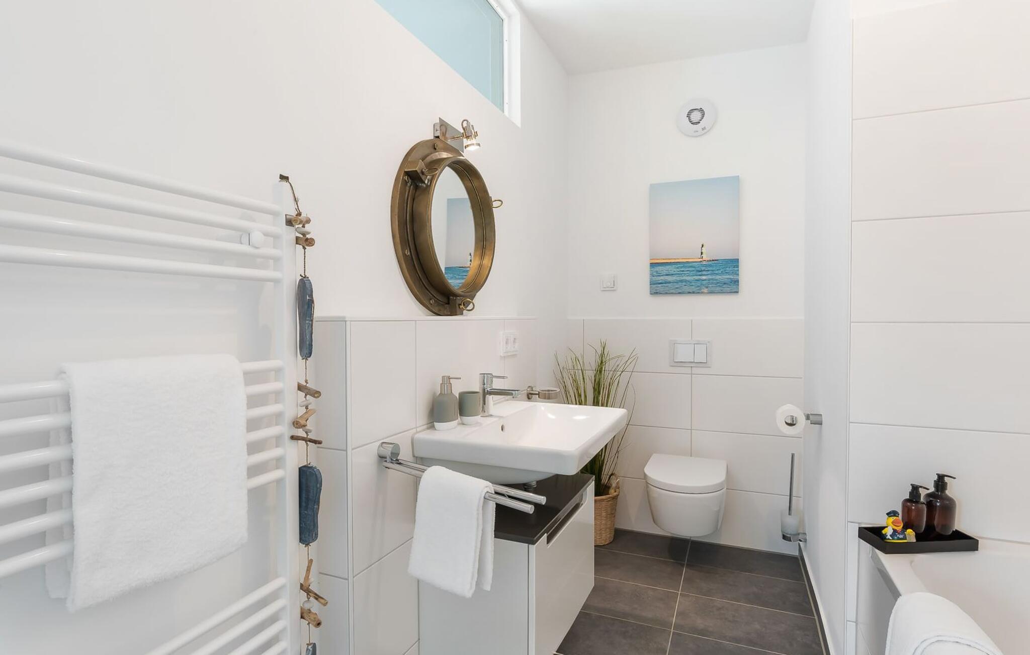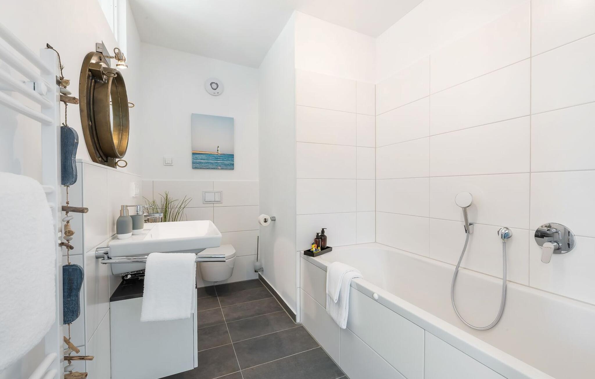 Ein zweites Badezimmer mit zusätzlichem WC, Waschbecken und einer Badewanne bietet genug Raum und Ausweichmöglichkeiten für mehrere Personen und rundet die Ausstattung dieser Wohlfühloase ab, die zu jeder Jahreszeit für Entspannung sorgt.