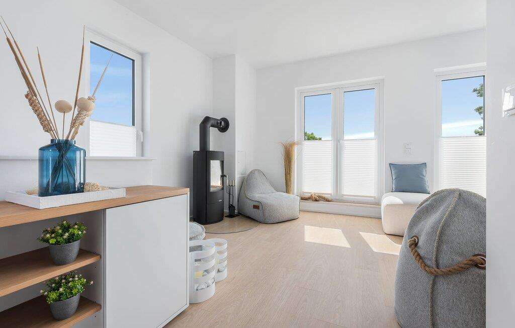Im zweiten Obergeschoss angekommen, macht die OSTSEELOUNGE ORO ihrem Namen alle Ehre. Hier werden durch eine bodentiefe Fensterfront mit der angrenzenden Terrasse und einem Blick über die Naturschutz-Salzwiesen auf die Ostsee verwöhnt. Wohlfühlfaktor pur! Auf der Wohnlandschaft mit Kuschelfaktor zu entspannen, aus dem Fenster die Ruhe der Natur genießen oder fernsehen ist Entspannung und Erholung. Der Alltag entrückt immer mehr und sollte das Wetter sich einmal von der nordischen Seite zeigen, sorgt der Kaminofen mit seinem prasselnden Feuer für weitere Behaglichkeit.