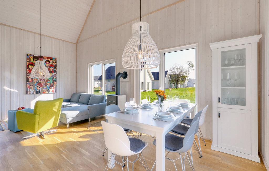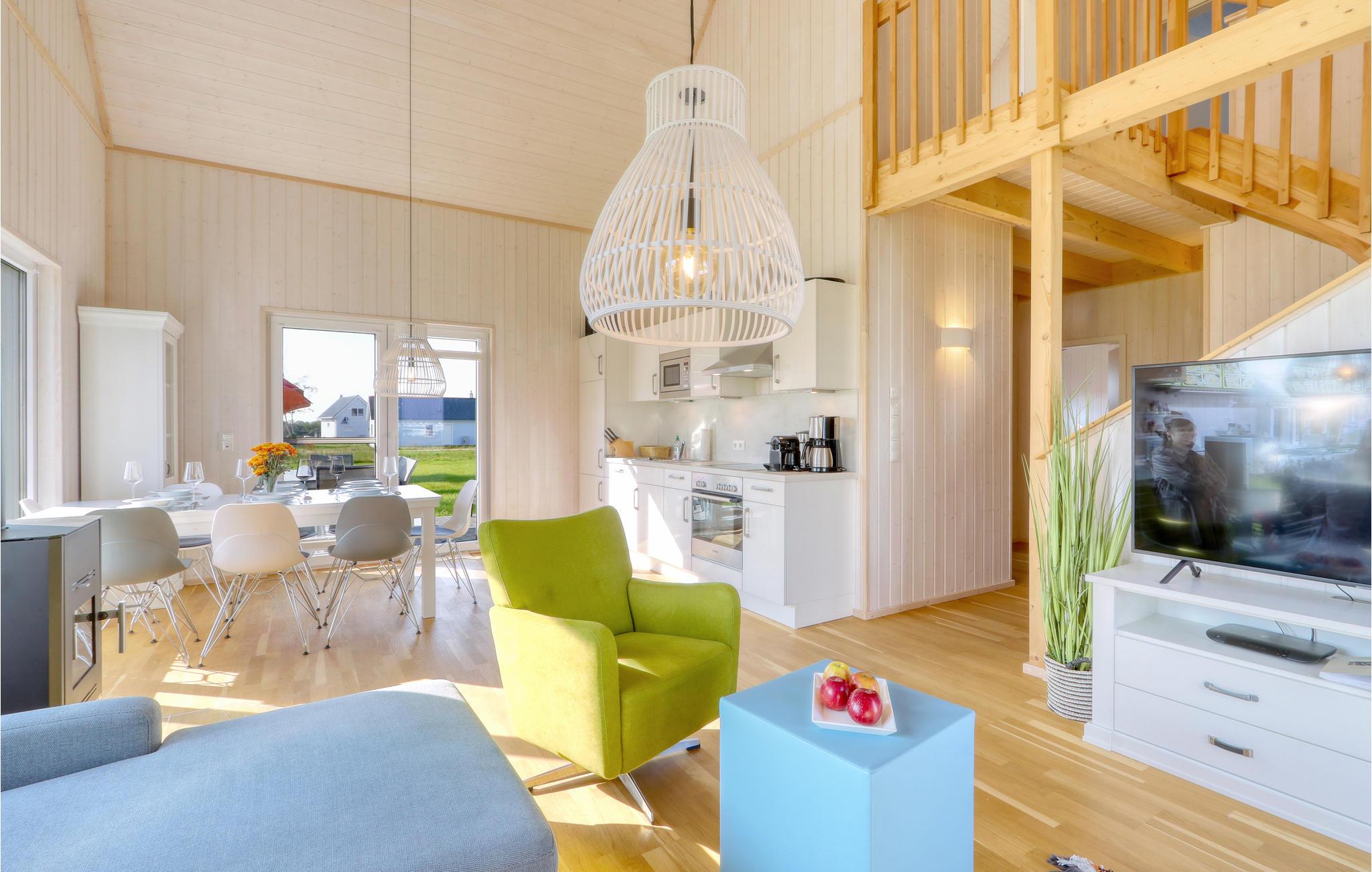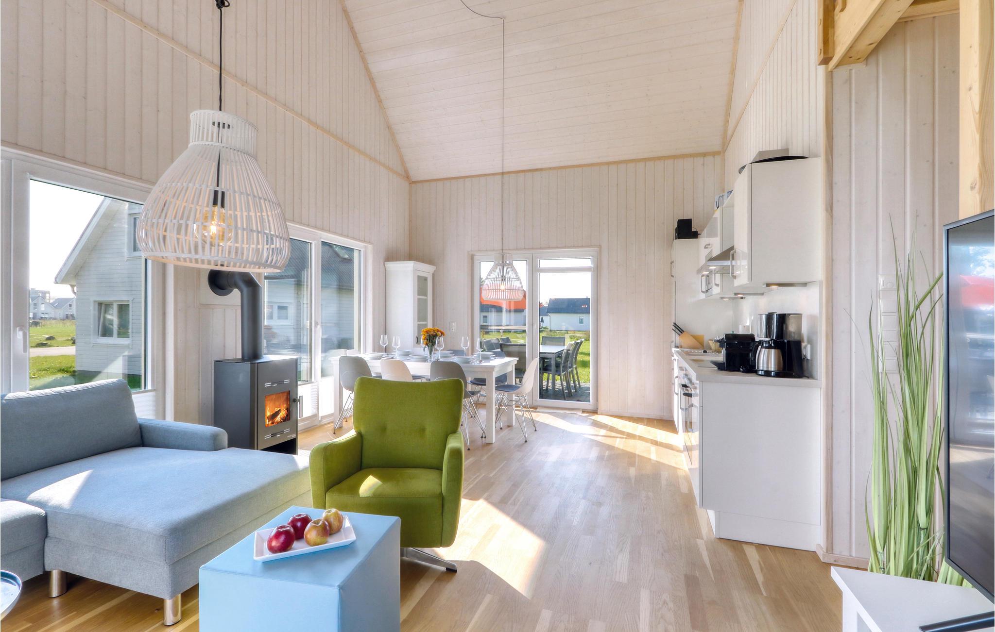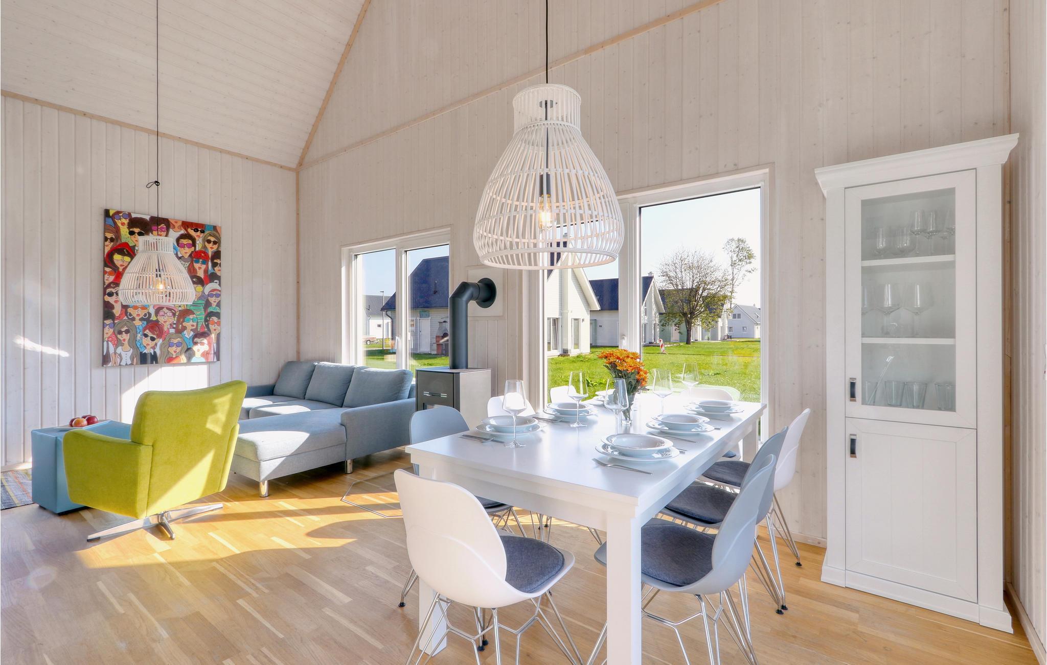Die hohen Decken und die großen Panoramafenster sorgen für besonders viel Lichteinfall und ein herrlich großzügiges Wohngefühl. Die Einrichtung ist modern und in maritimen Farben gehalten, sodass Sie sich für Ihren Urlaub ander Ostsee hier besonders wohlfühlen werden.