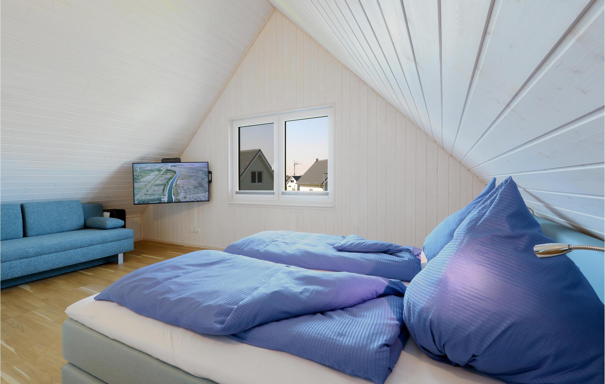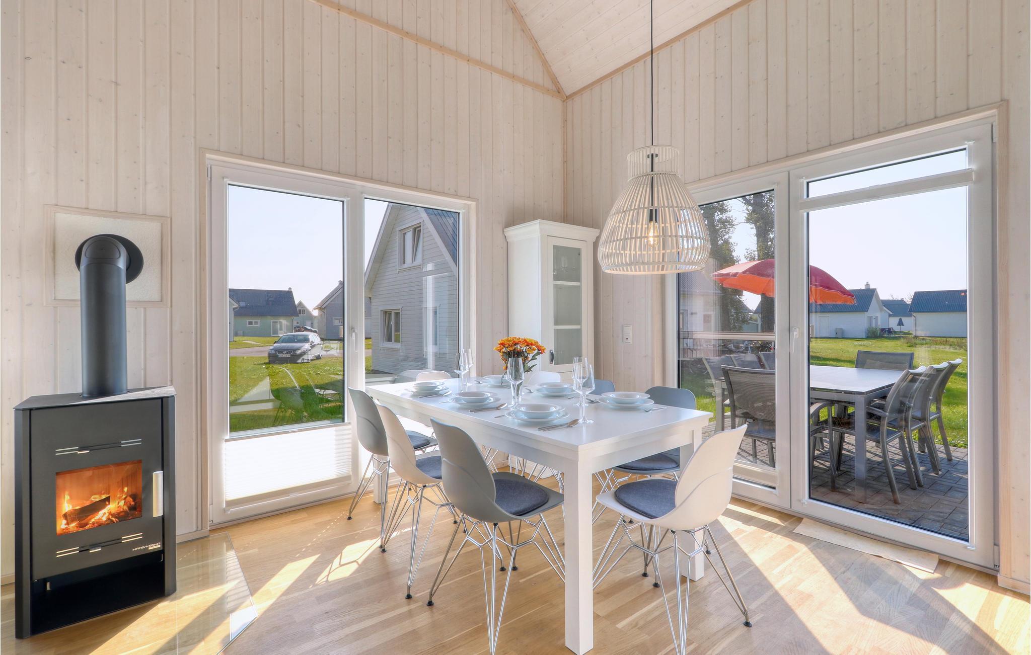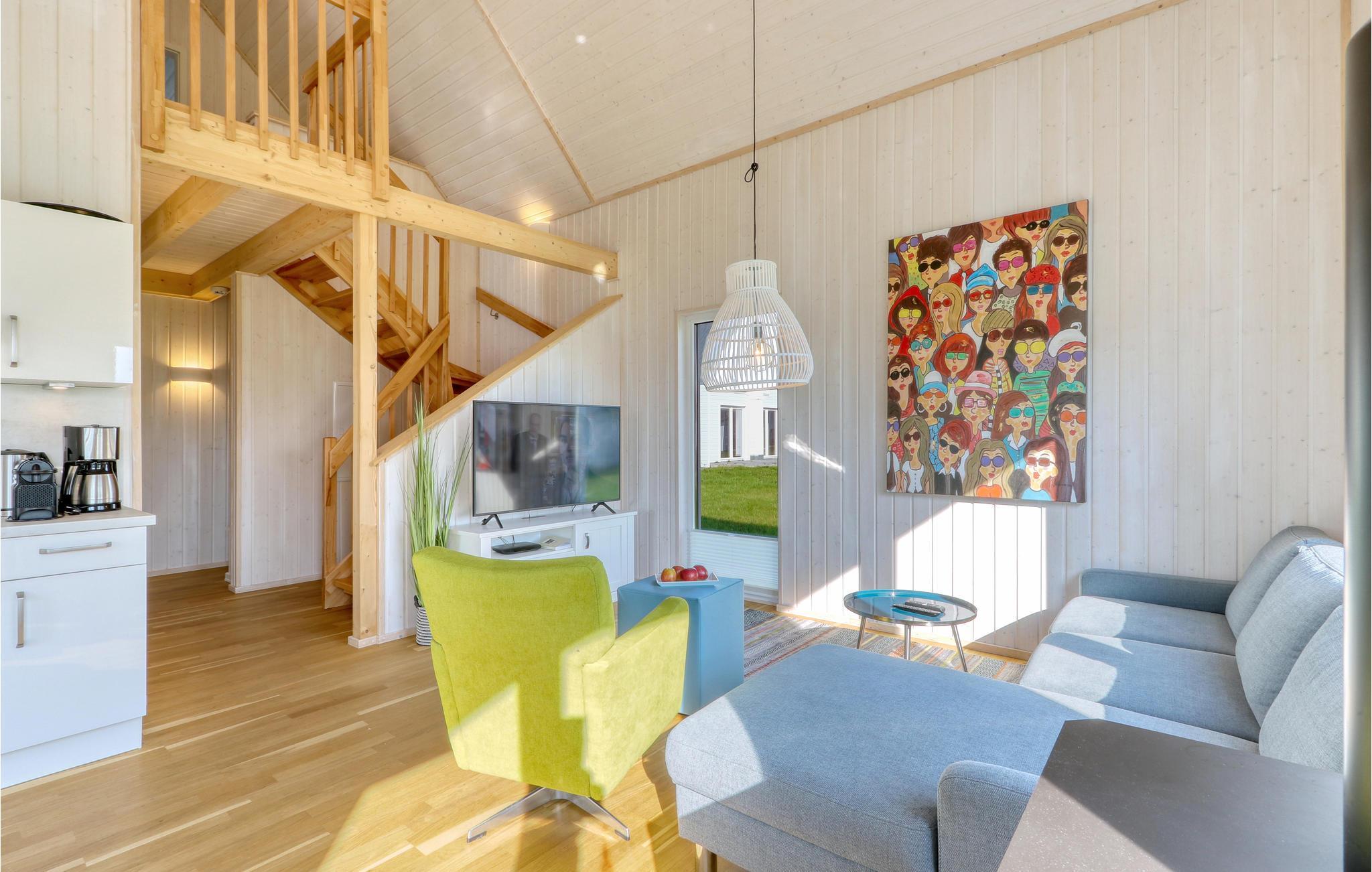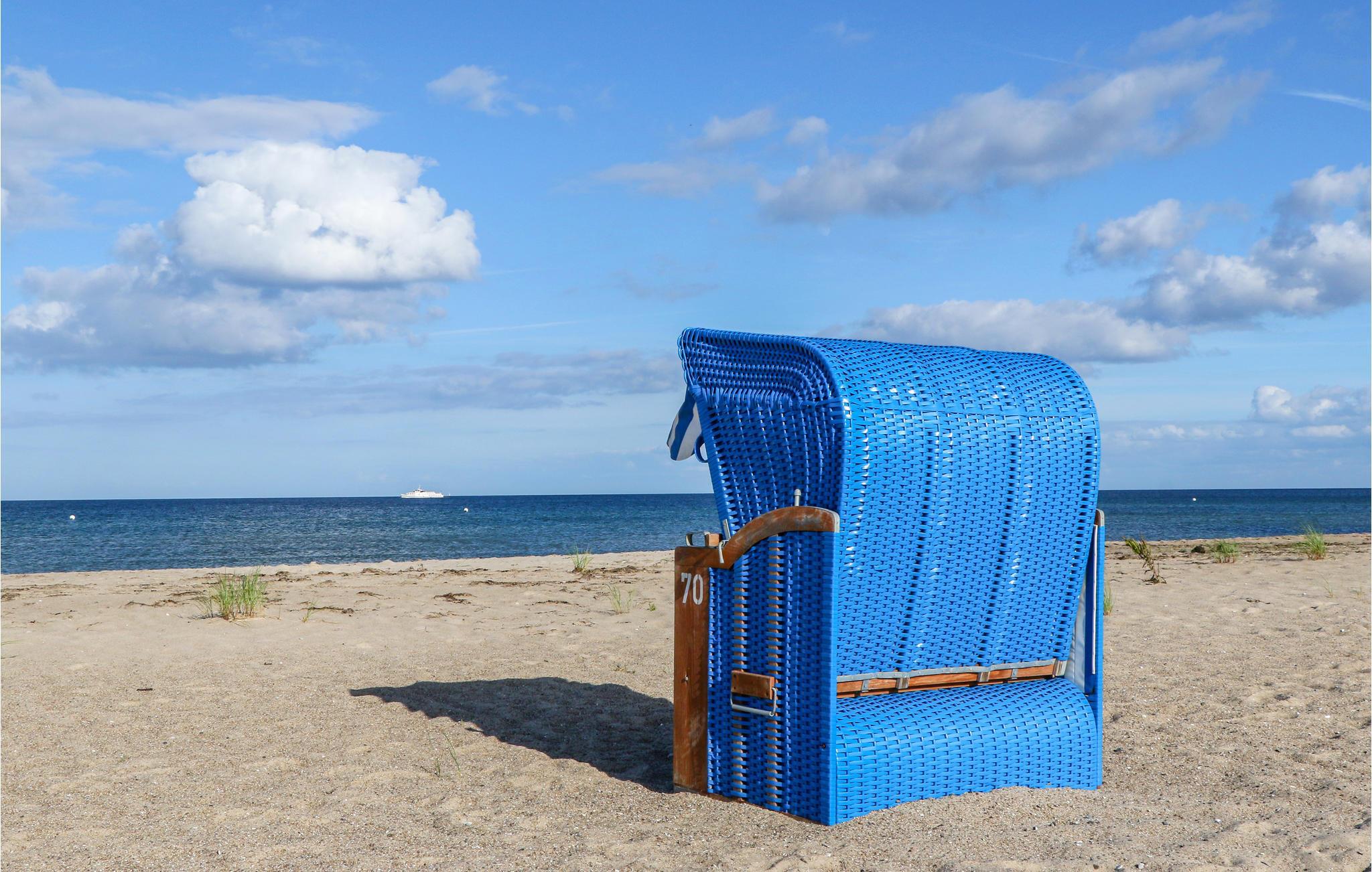 Die hohen Decken und die großen Panoramafenster sorgen für besonders viel Lichteinfall und ein herrlich großzügiges Wohngefühl. Die Einrichtung ist modern und in maritimen Farben gehalten, sodass Sie sich für Ihren Urlaub ander Ostsee hier besonders wohlfühlen werden.