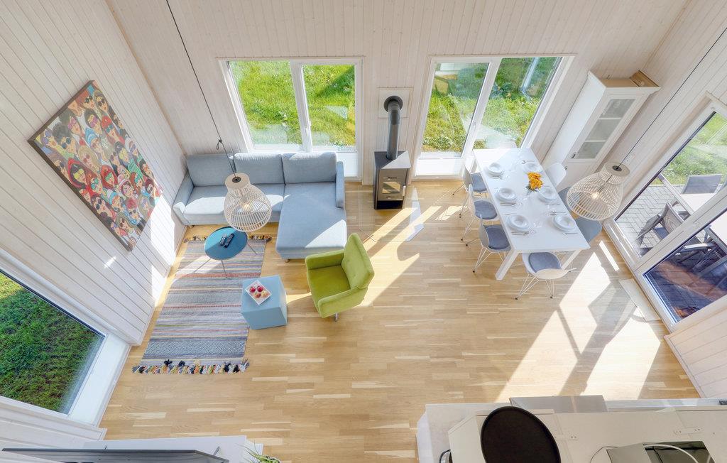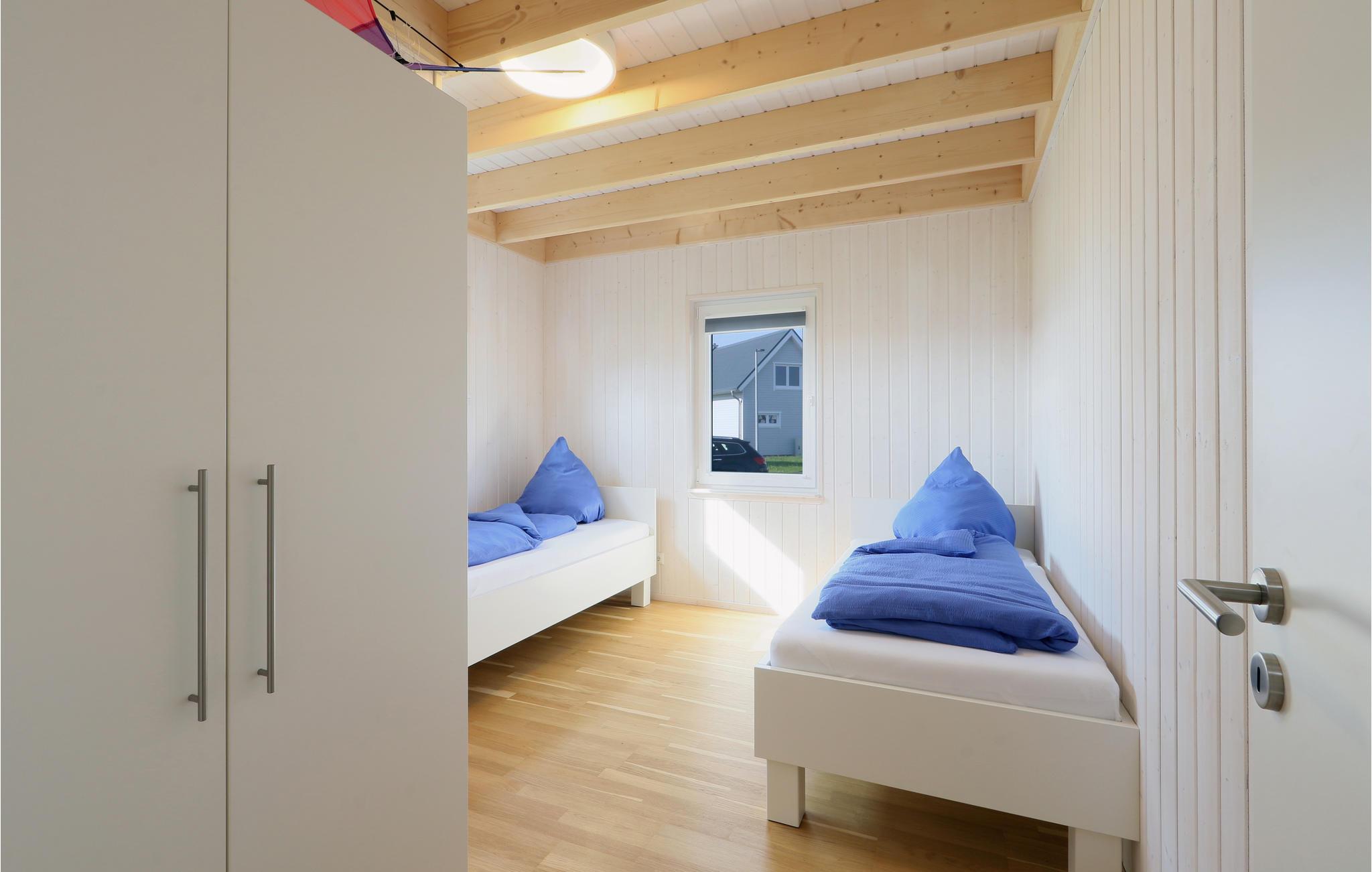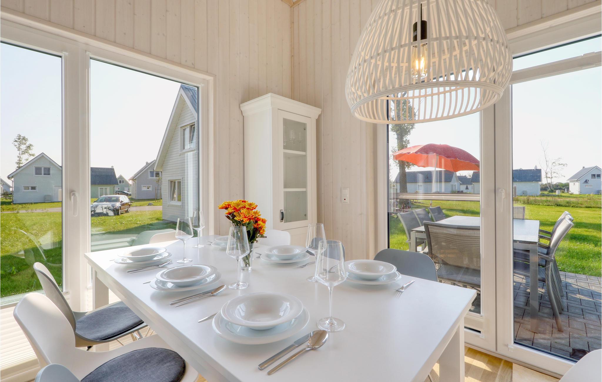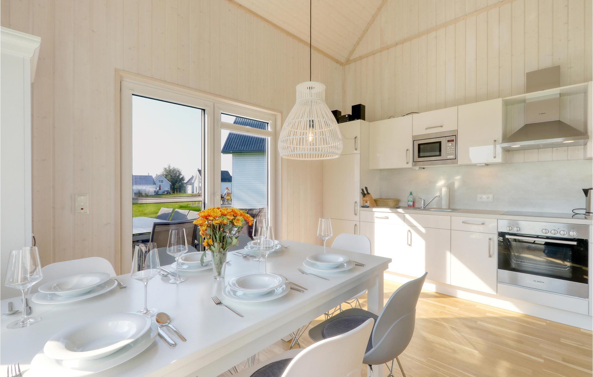 Die hohen Decken und die großen Panoramafenster sorgen für besonders viel Lichteinfall und ein herrlich großzügiges Wohngefühl. Die Einrichtung ist modern und in maritimen Farben gehalten, sodass Sie sich für Ihren Urlaub ander Ostsee hier besonders wohlfühlen werden.
