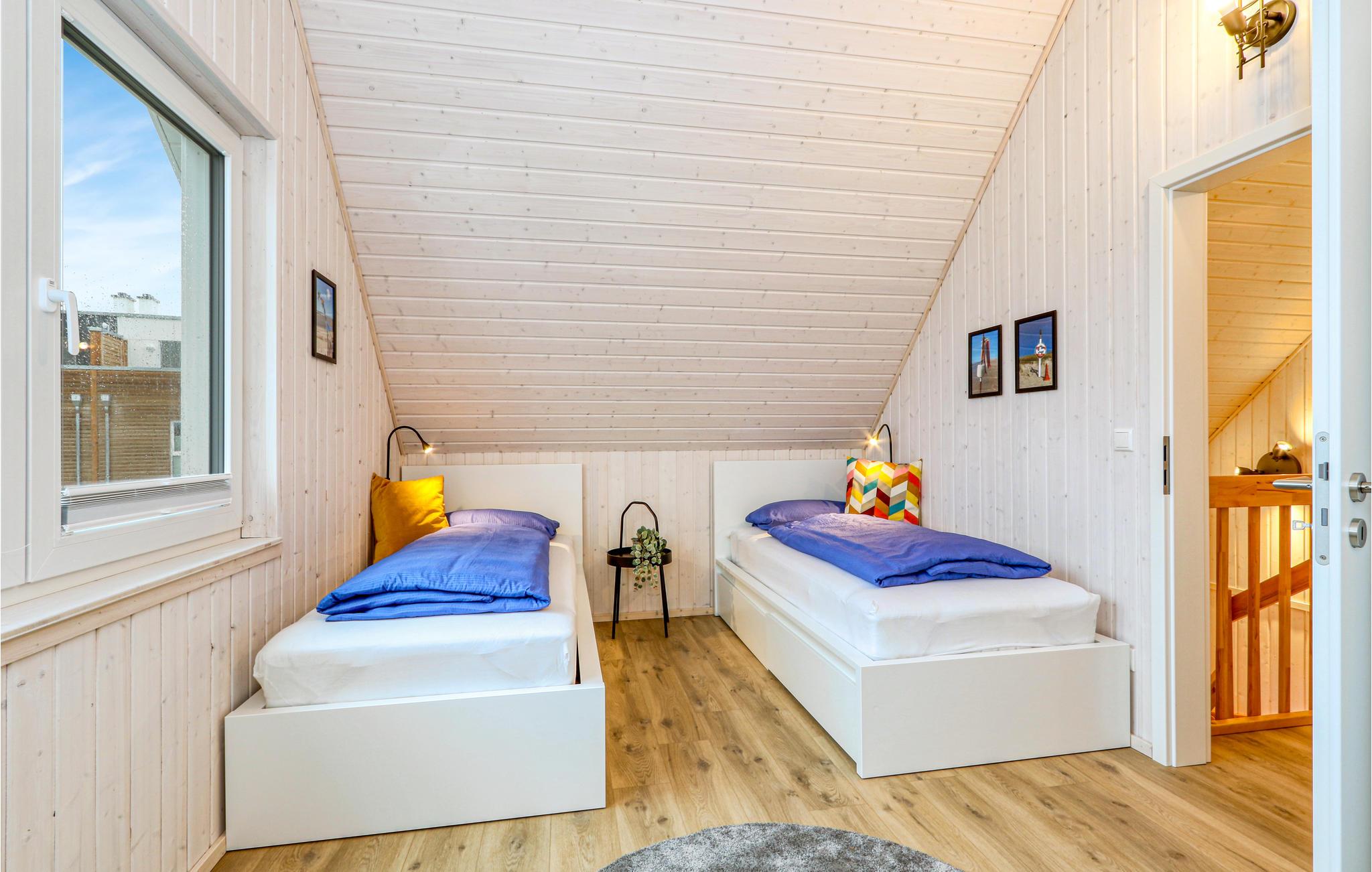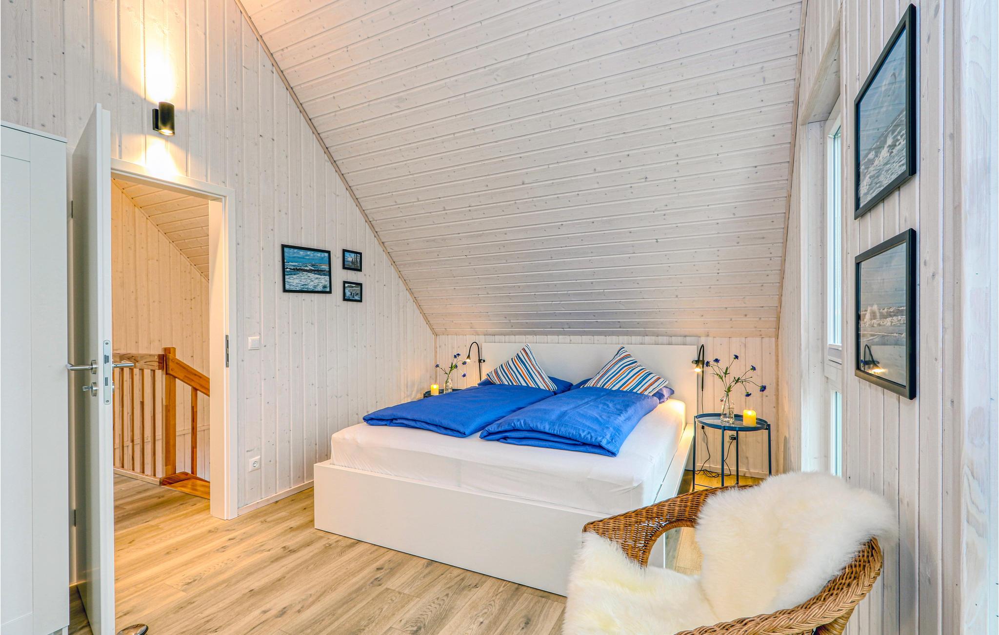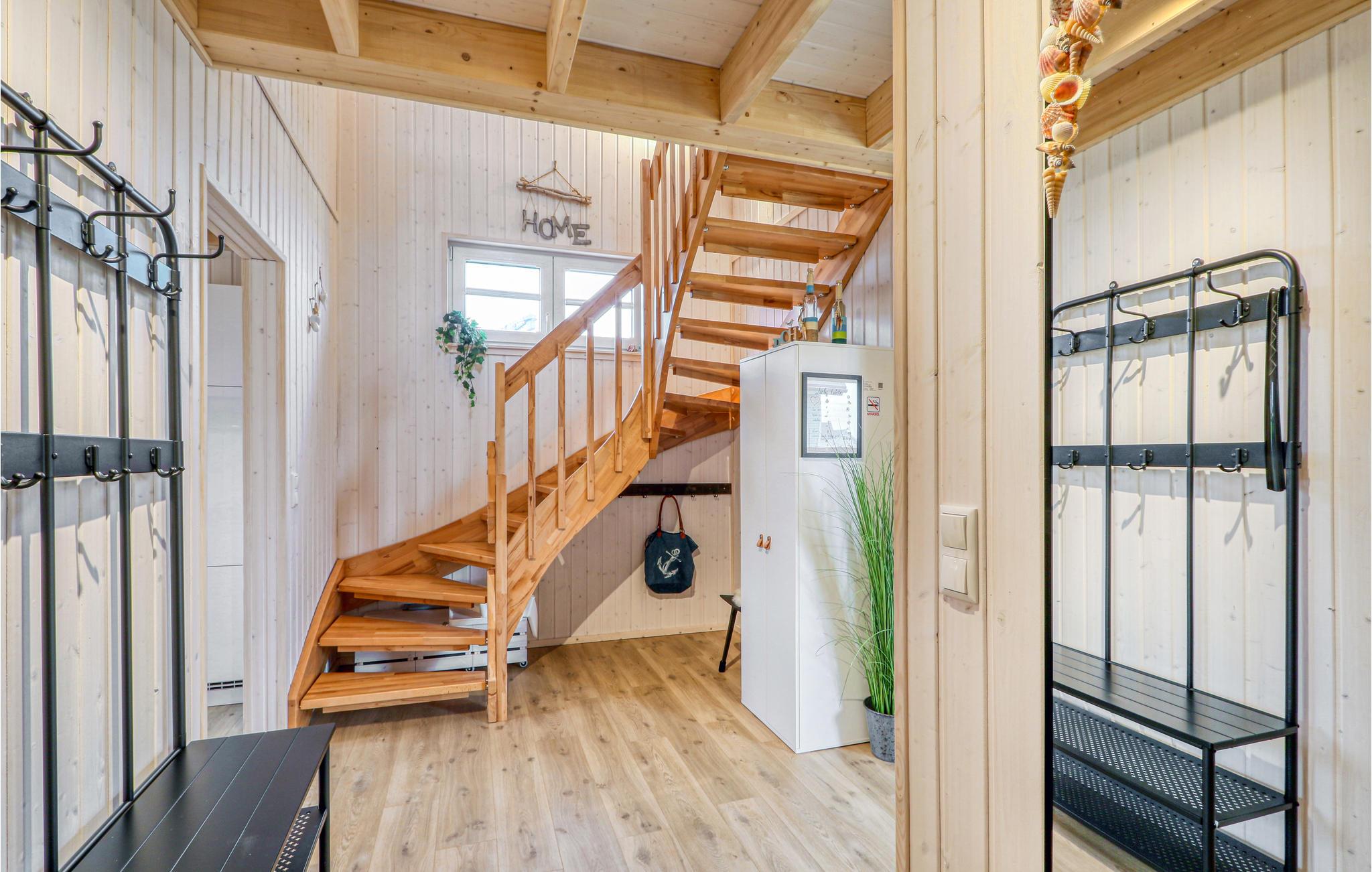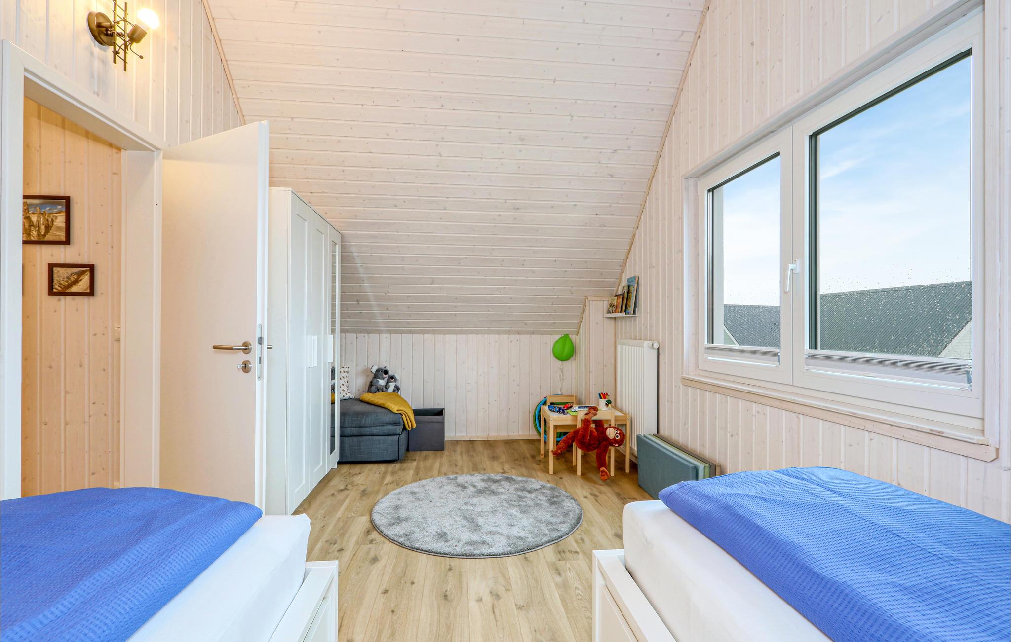 Die Zimmer erstrecken sich über zwei Etagen. Im Bad im Erdgeschoss befindet sich die private Sauna des Ferienhauses, in der Sie nach einem langen Tag an der Ostsee herrlich entspannen können. Anschließend können Sie es sich vor dem Kaminofen im Wohnzimmer gemütlich machen. Zwei Smart-TVs sowie ein DAB Kassettenradio sind ebenfalls vorhanden. Eines der Schlafzimmer verfügt über ein Doppelbett, das zweite Schlafzimmer hat zwei Einzelbetten und einen ausklappbaren Schlafsessel mit Lattenrost und Matratze. Hier befindet sich auch eine kleine Spielecke für Kinder, in der die Kleinen viel Spaß haben werden.