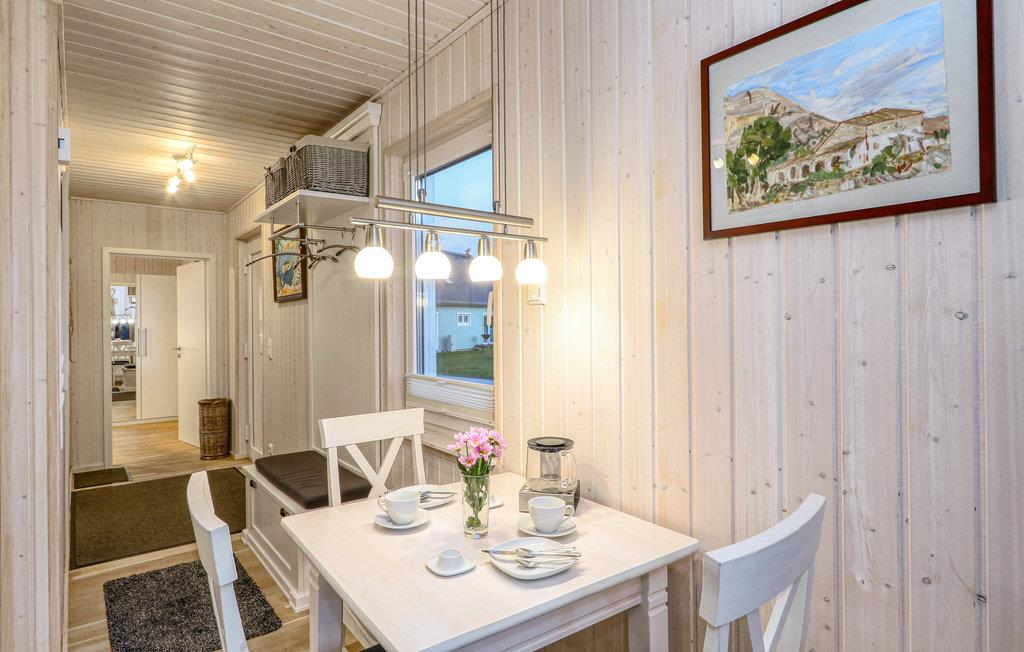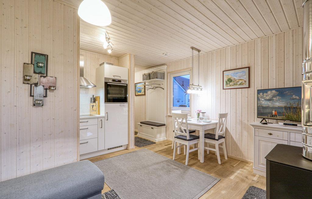 Das Ferienhaus verfügt ein separates Schlafzimmer mit Doppelbett, im Wohnbereich auf dem Schlafsofa befinden sich zwei weitere Schlafplätze. Hier im kombinierten Wohn/Essbereich wurde an alles gedacht - eine voll ausgestattete Küchenecke und eine gemütliche Sofaecke samt Kaminofen.