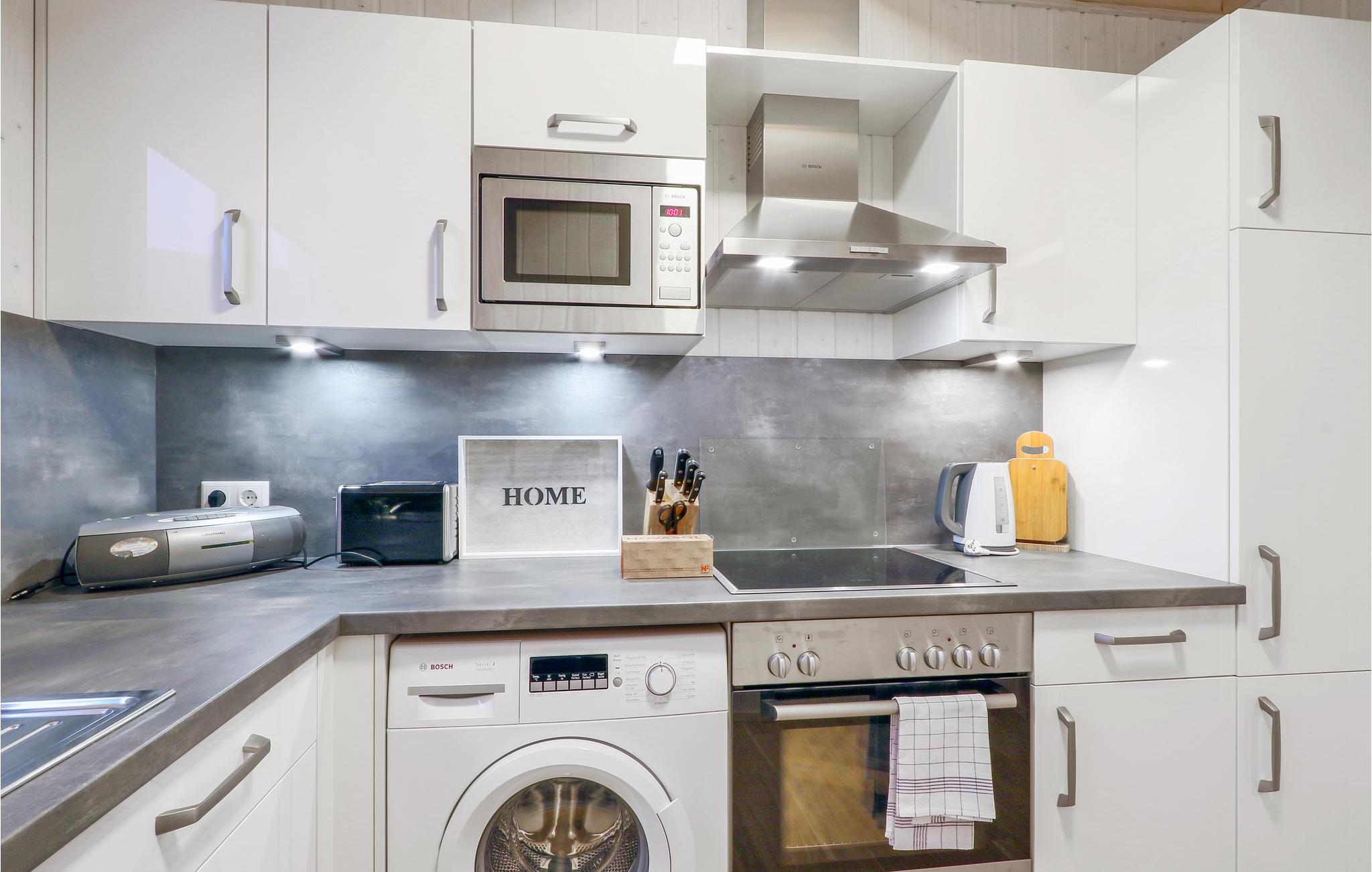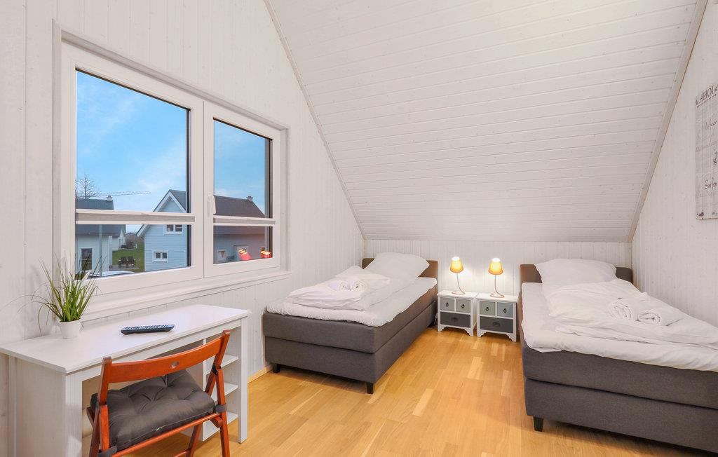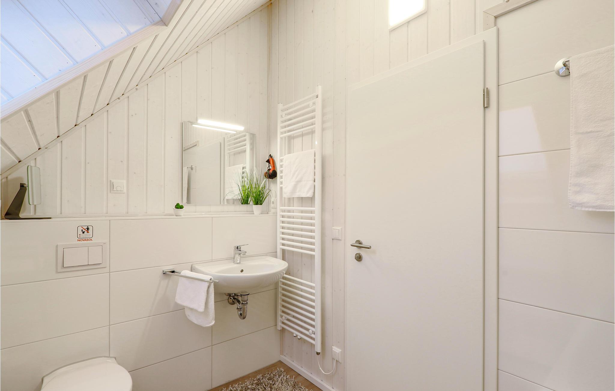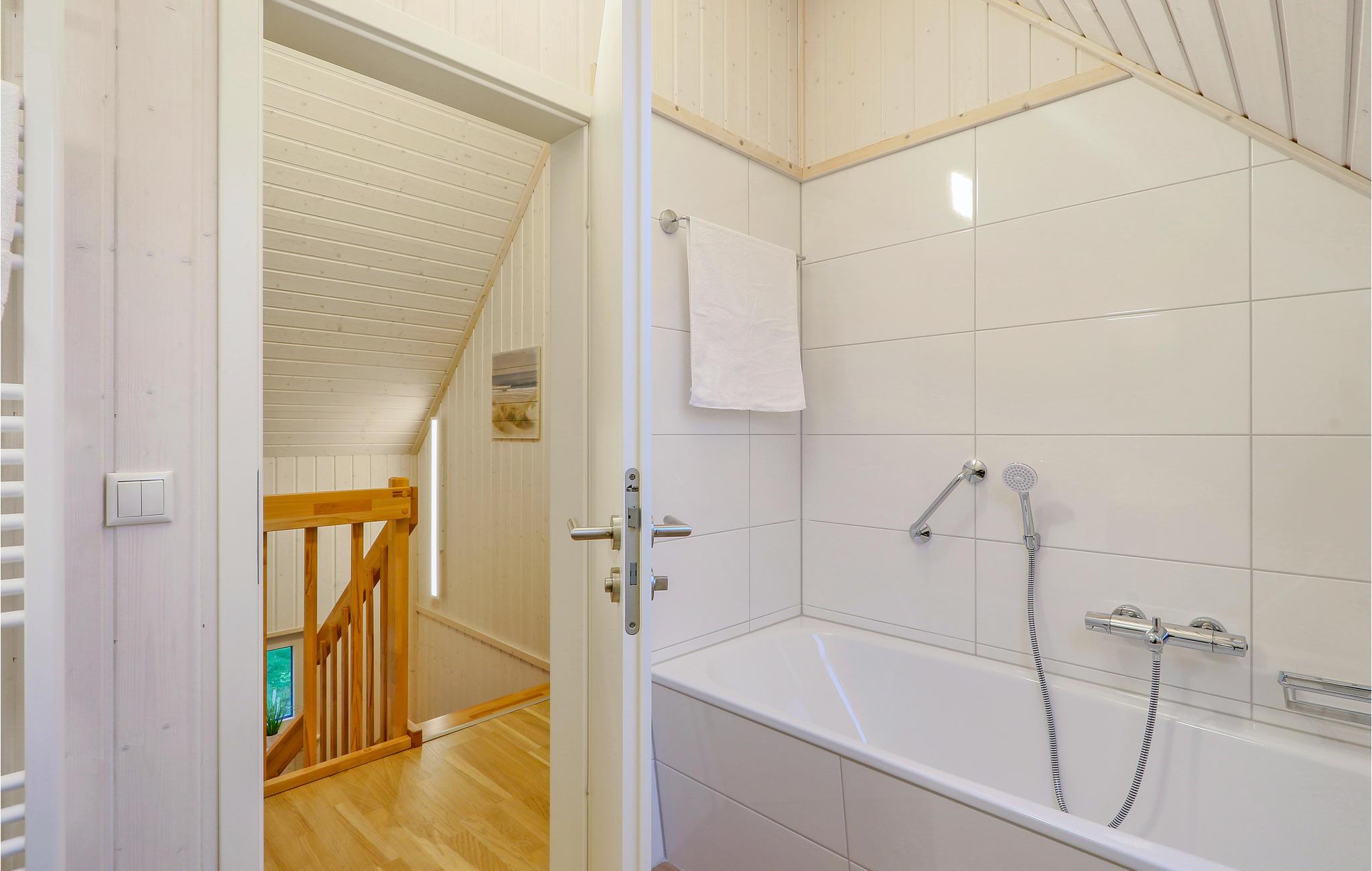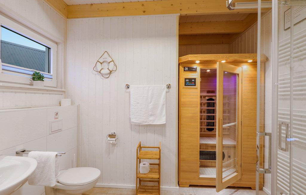 Im Obergeschoss des Hauses befindet sich ein Badezimmer sowie die beiden separaten Schlafzimmer. Im Wohnzimmer im Erdgeschoss bietet das Schlafsofa die Möglichkeit für zwei weitere Schlafplätze. Im Badezimmer im Erdgeschoss befindet sich Ihre private Infrarot-Wärmekabine des Ferienhauses, die für besonders wohlige Atmosphäre sorgt.