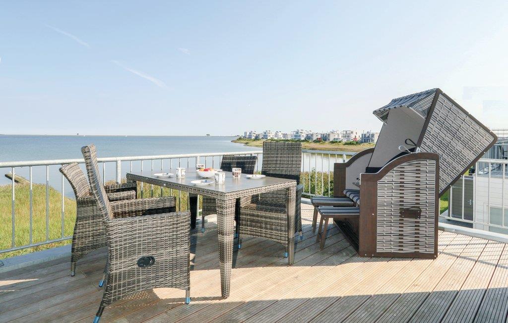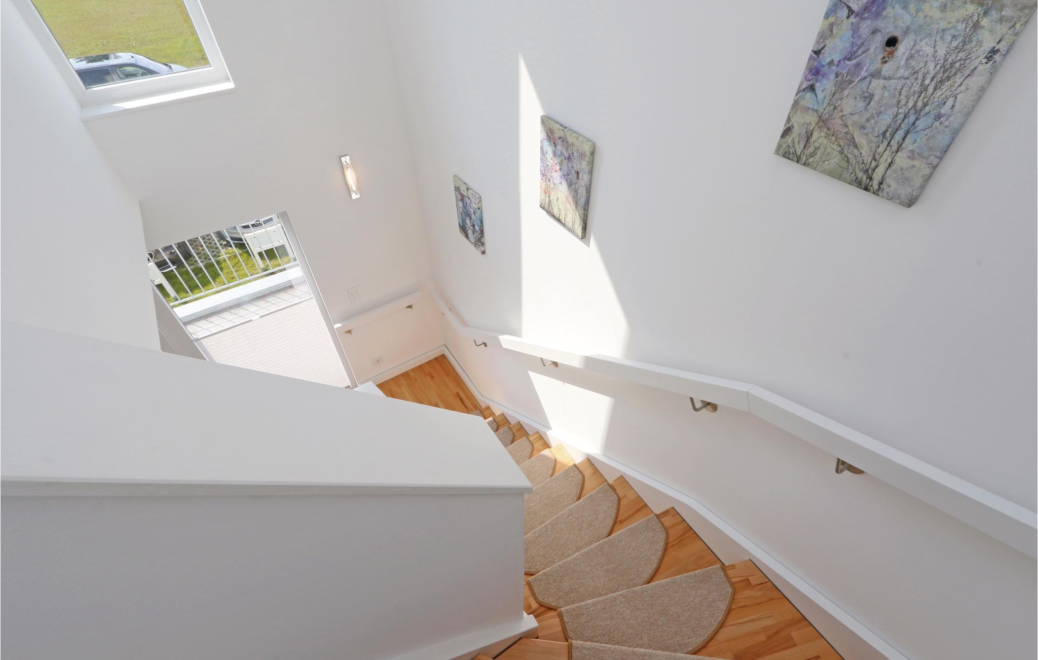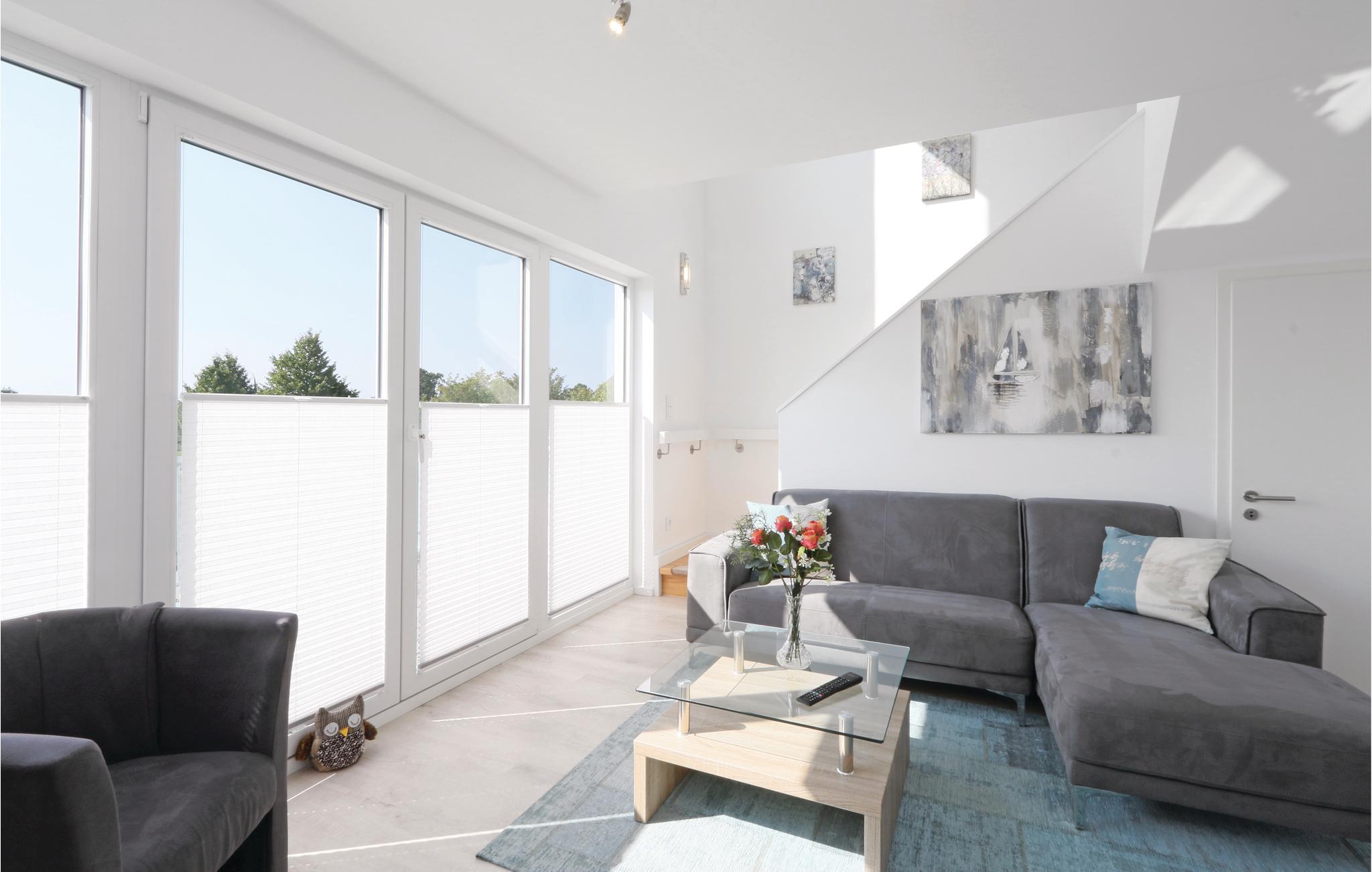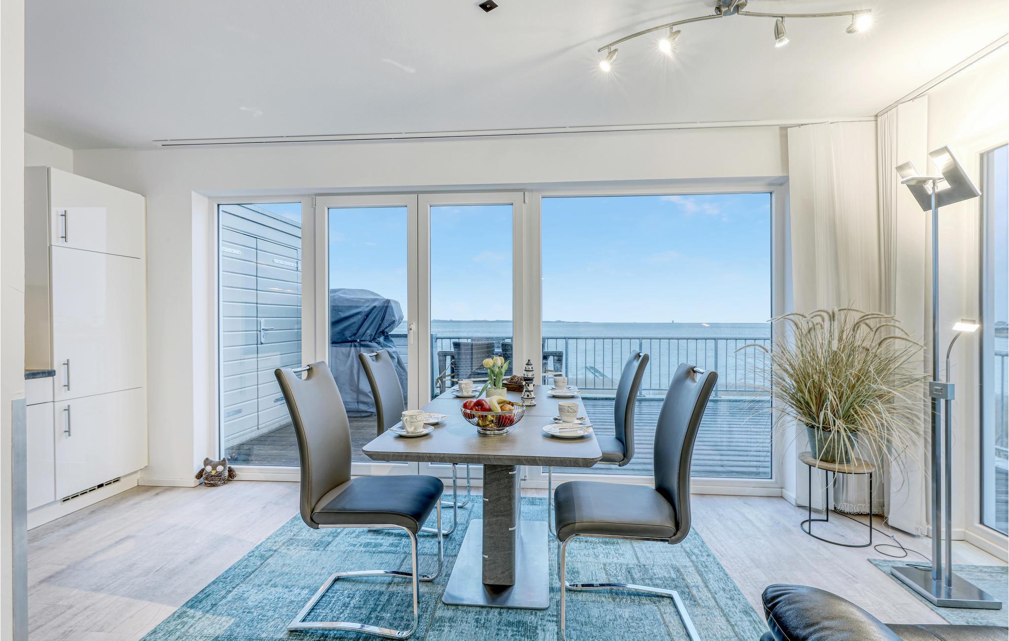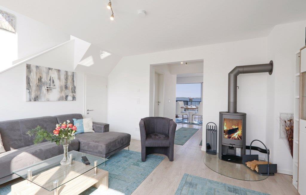 Von der Terrasse dieser luxuriösen Ferienwohnung im OstseeResort Olpenitz aus kann der Blick über die breite Schleimündung bis hin zur Ostsee schweifen. Die Wohnung erstreckt sich über zwei Etagen (1.+ 2.OG) und bietet von allen Räumen aus tolle Ausblicke. Vom Wohnzimmer aus schauen Sie ins Grüne, während Sie das gemütliche Prasseln des Feuers im skandinavischen Kaminofen genießen können. Auf der angrenzenden Südbalkon stehen für Sie Sonnenliegen bereit. Auf der anderen Seite des Hauses liegt die große Terrasse mit eigenem Strandkorb und atemberaubender Panoramaaussicht das Wasser.