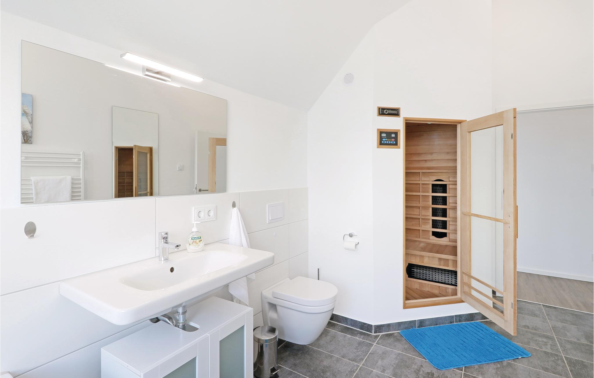 Dank der großen Badewanne mit Sprudelfunktion und Ihrer privaten Sauna ist das Haus auch in der kühleren Jahreszeit ein wahres Wohlfühlparadies. Das Wellnessbad liegt ebenso wie die zwei Schlafzimmer im Dachgeschoss. Auch von hier oben aus kann man durch die großen Fenster herrliche Ausblicke in die Natur genießen.