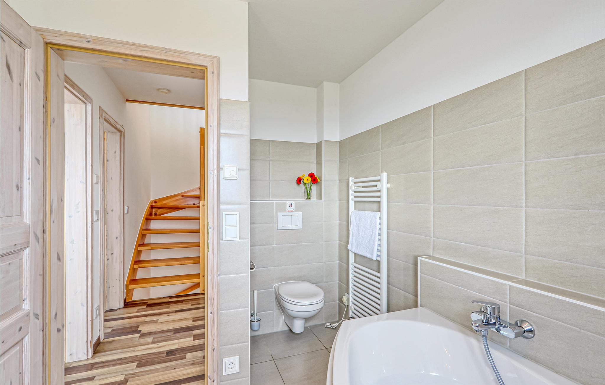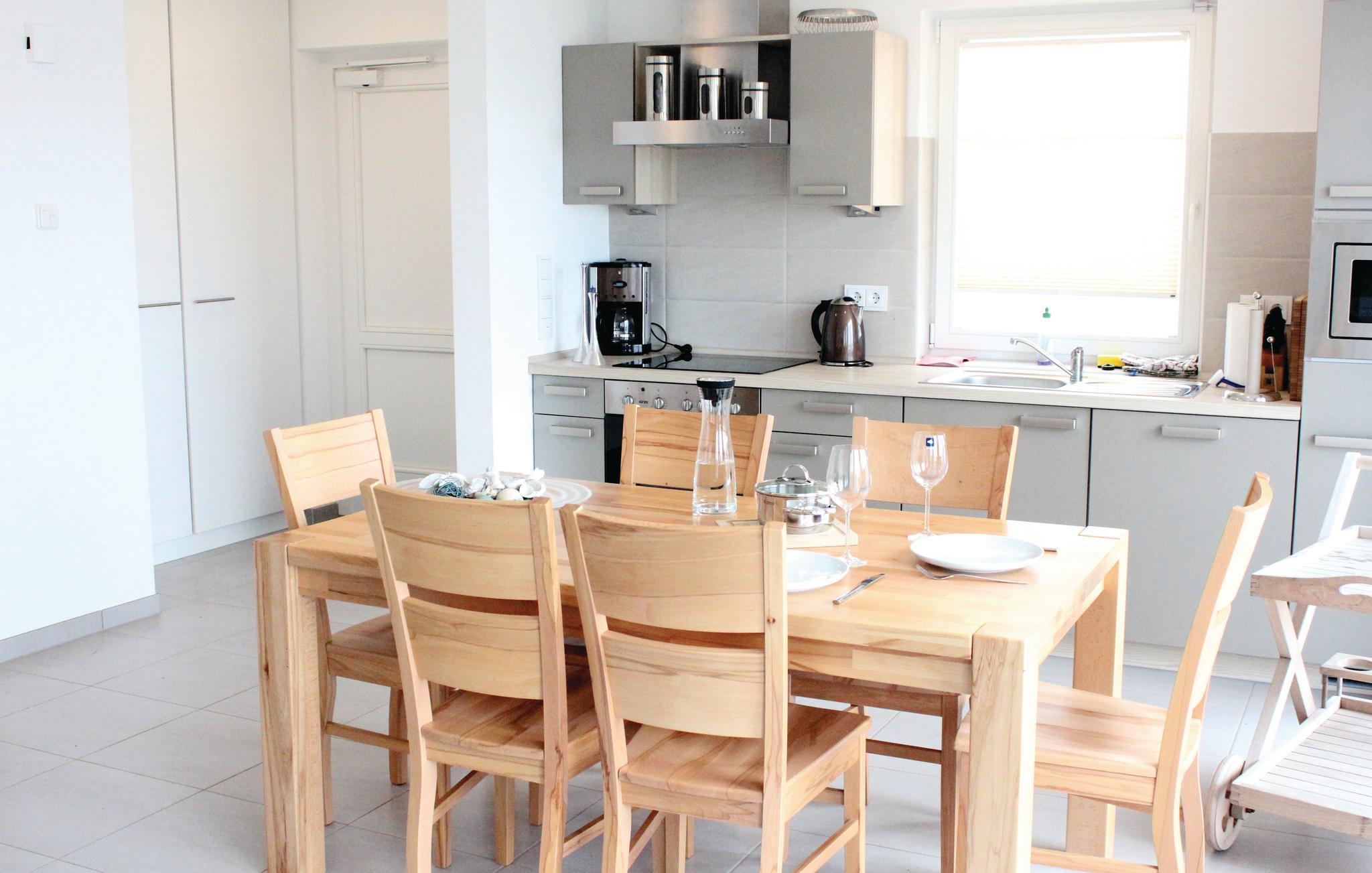 Jedes Haus verfügt über eine voll ausgestattete Küche mit allem Komfort (Geschirrspüler, Mikrowelle). Die Bäder sind mit Fußbodenheizung ausgestattet. Neben dem voll ausgestatteten Bad im 1. Stock stehen Ihnen ein Gäste-WC im Erdgeschoss sowie die separate Dusche im Saunabereich zur Verfügung.