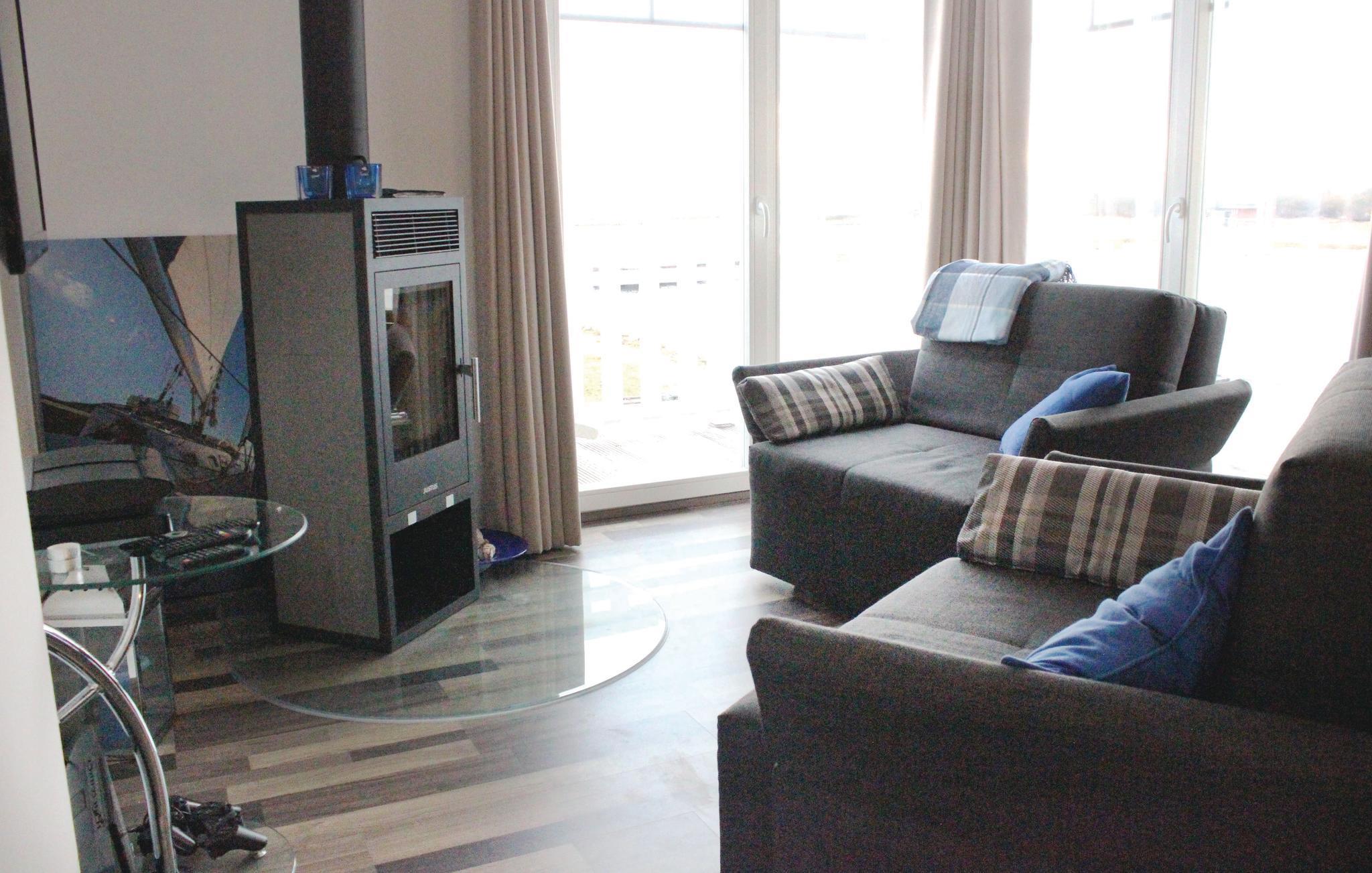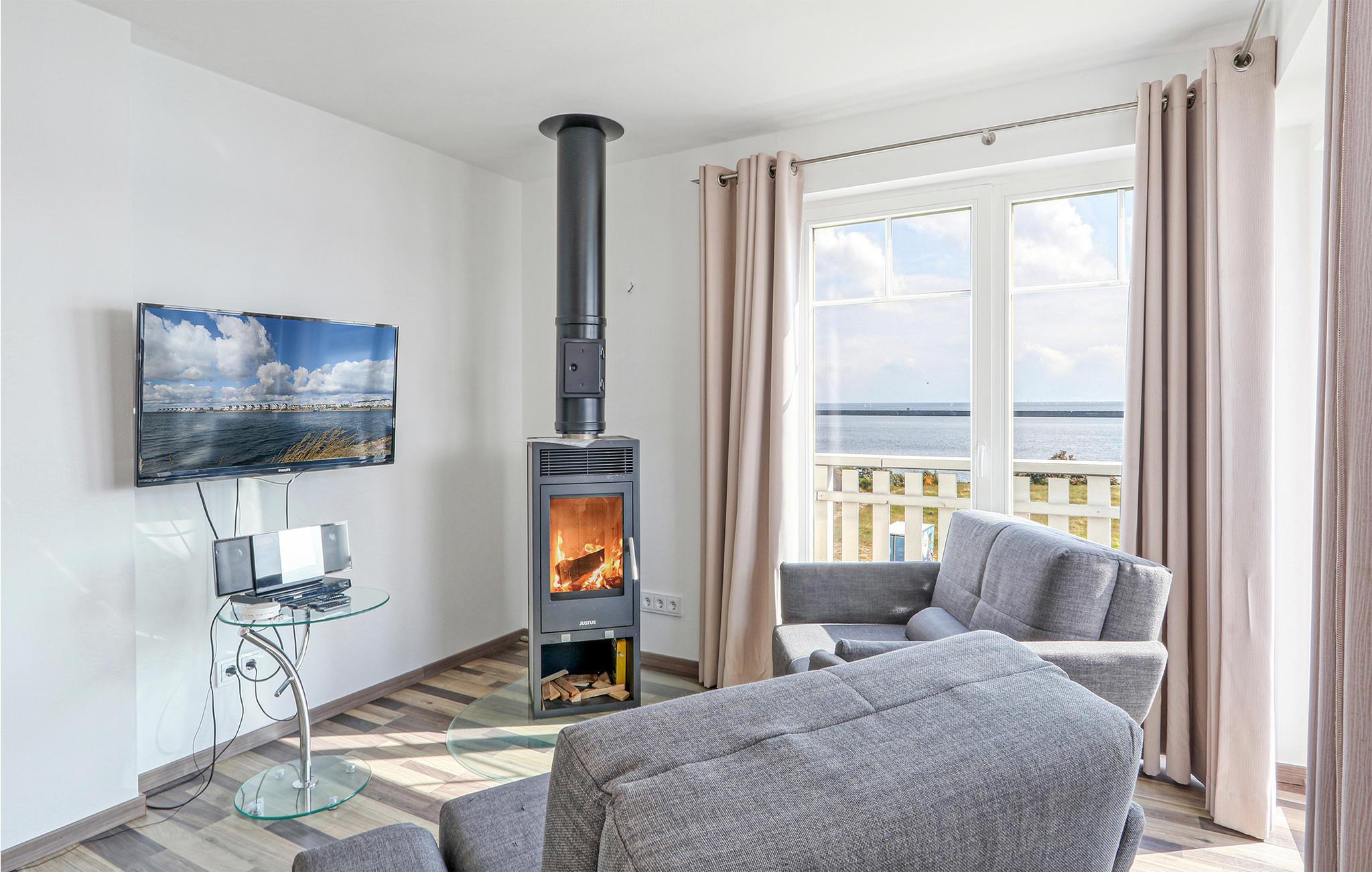 Im Obergeschoss befindet sich außerdem noch ein Wohnbereich - das so genannte Studio - mit großen Panoramafenstern. Hier steht auch der gemütliche, skandinavische Kaminofen, so dass Sie im Winter vor dem knisternden Kaminfeuer den Ausblick genießen können.