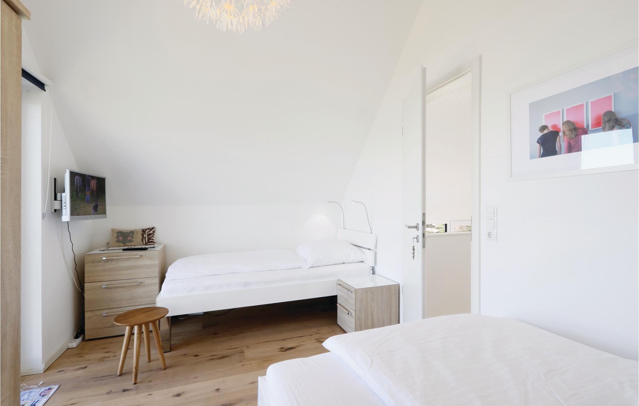 Die beiden Schlafzimmer sind mit eigenen Fernsehern ausgestattet. Das Sofa im Wohnzimmer kann in zwei komfortable Schlafplätze umgewandelt werden. An den Schlafzimmerfenstern, dem Fenster im Treppenaufgang und an der Terrassentür befinden sich Fliegengitter.