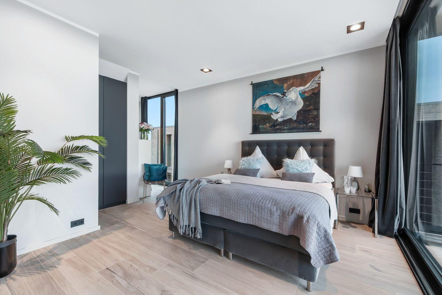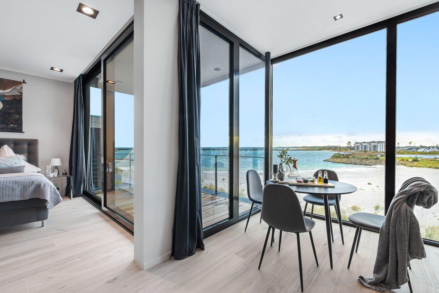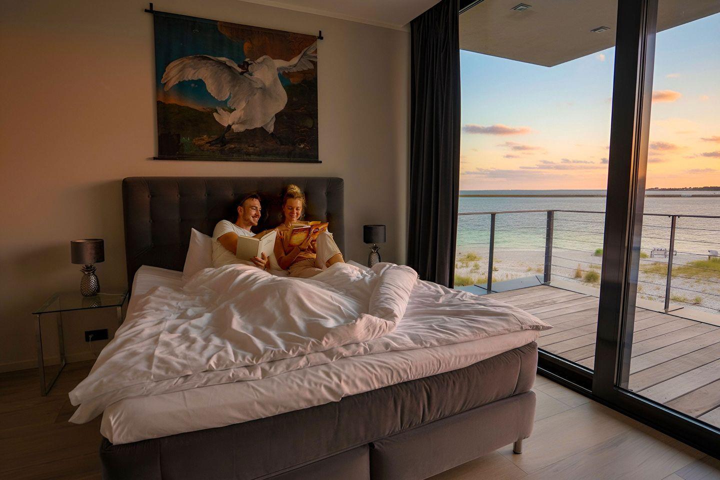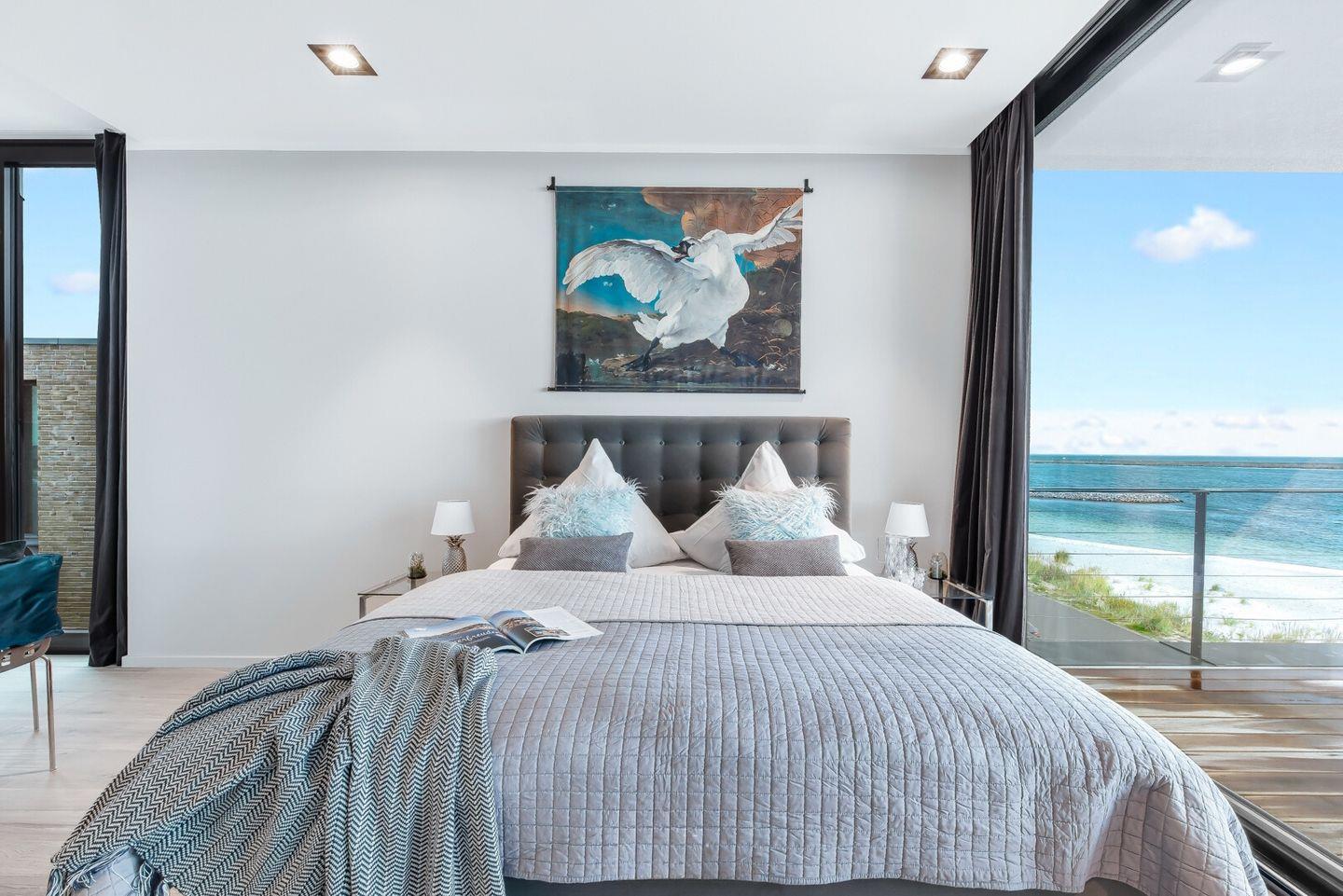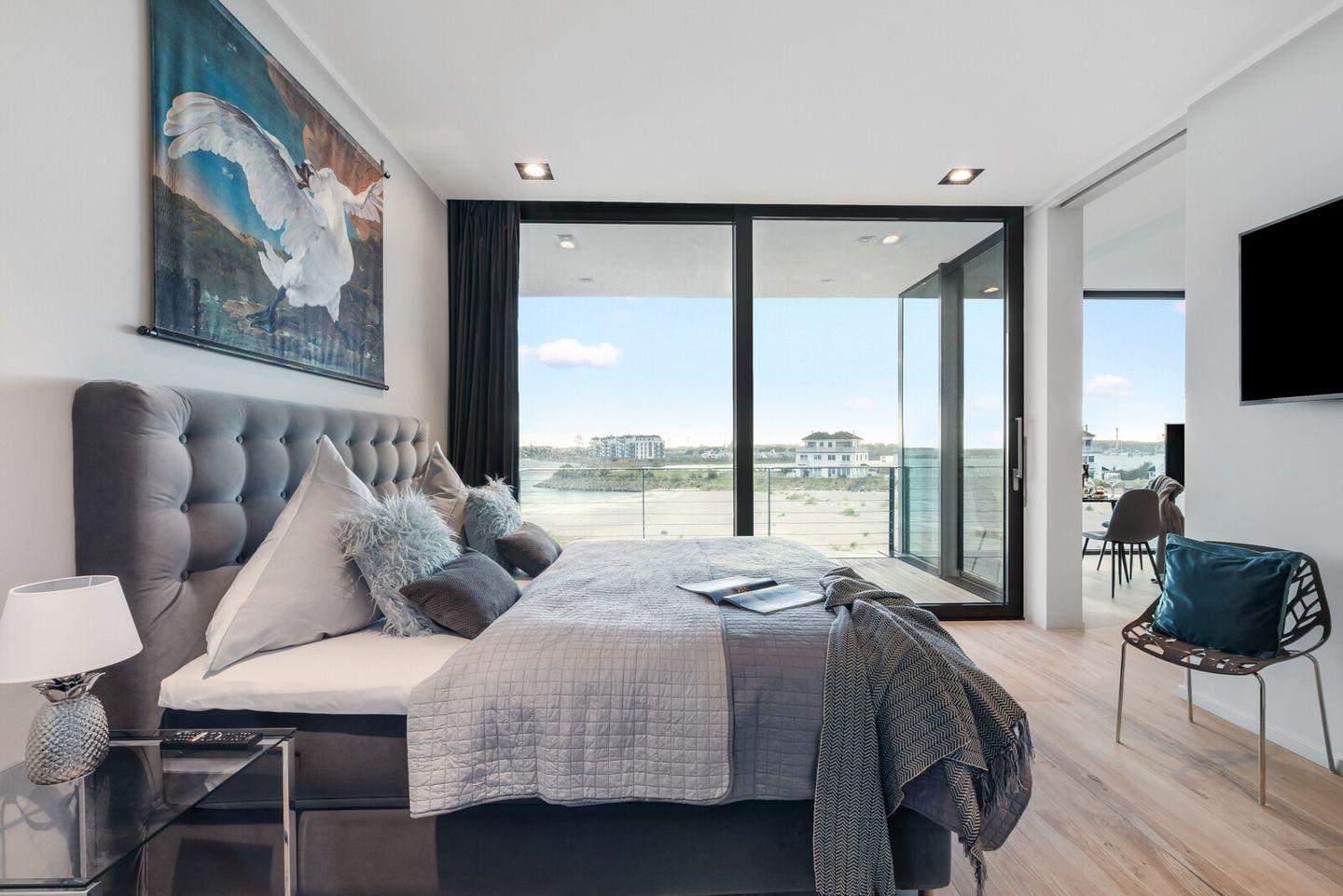 Im Schlafzimmer gibt es ein bequemes Doppelboxspringbett, einen Kleiderschrank und einen Smart-TV. Dazu gehört ein großer Sonnenbalkon mit Traumaussicht. Auch hier sorgen Panoramafenster für einen wunderbaren Meerblick. Genießen Sie erholsame Nächte und frische Meeresbrise.
