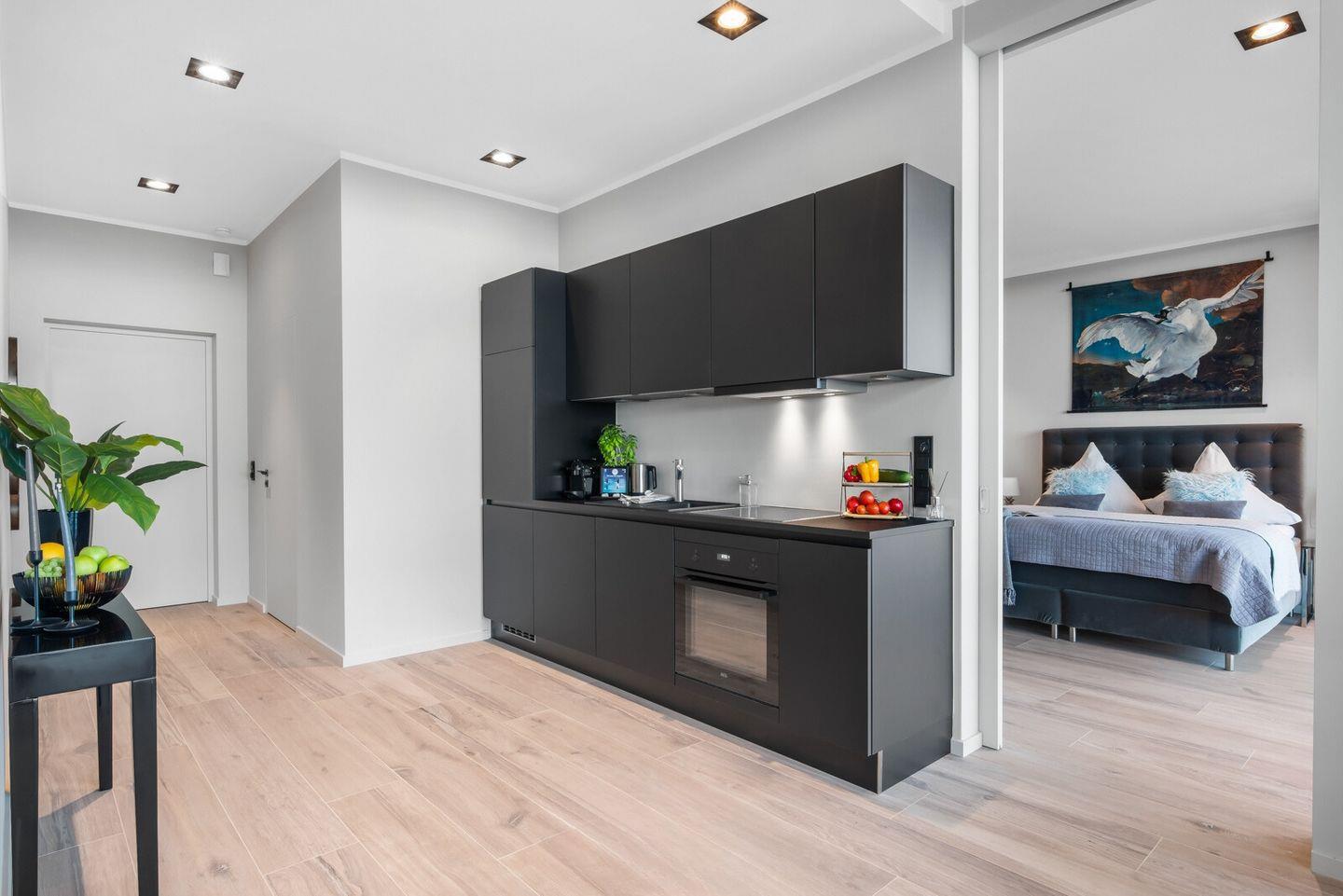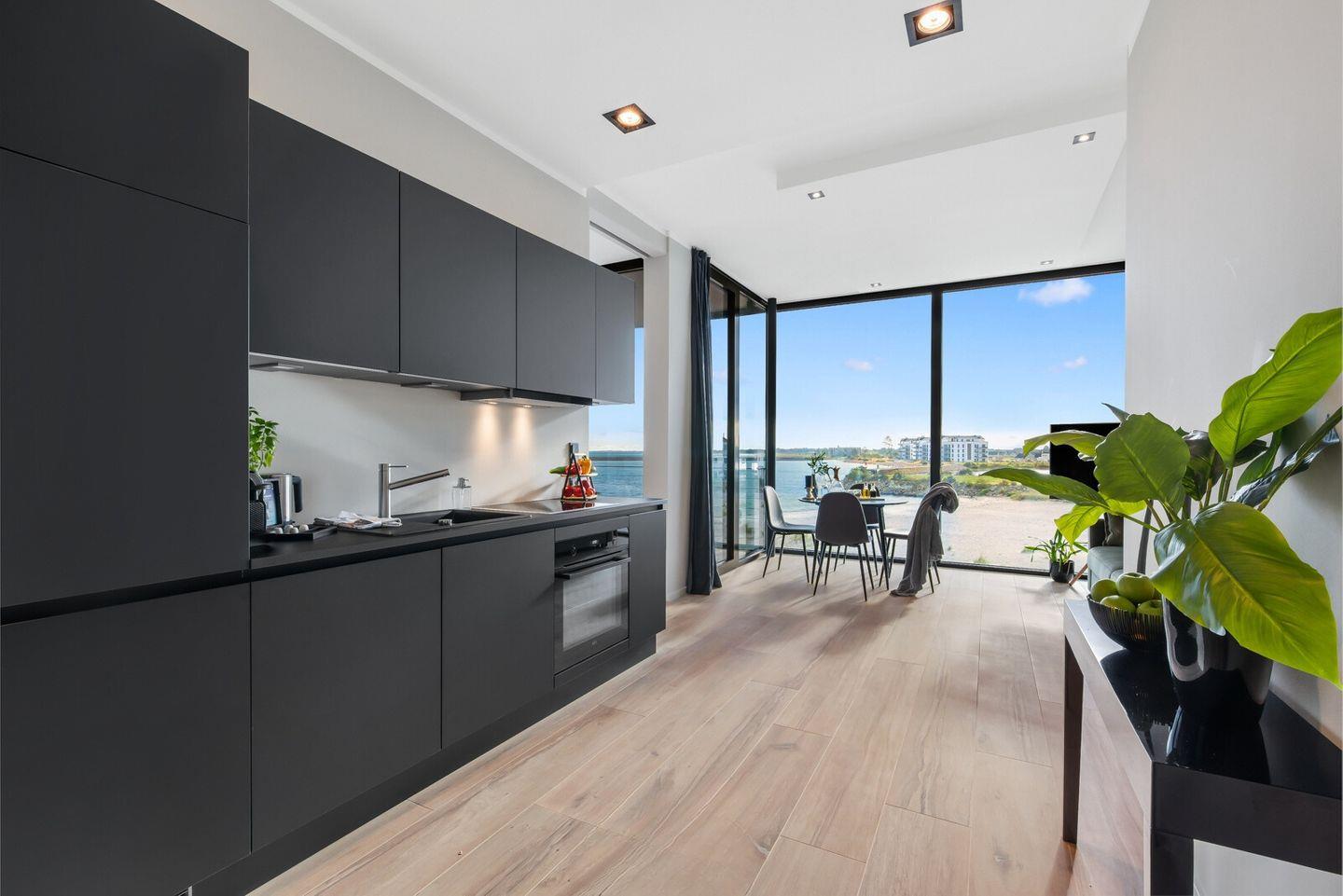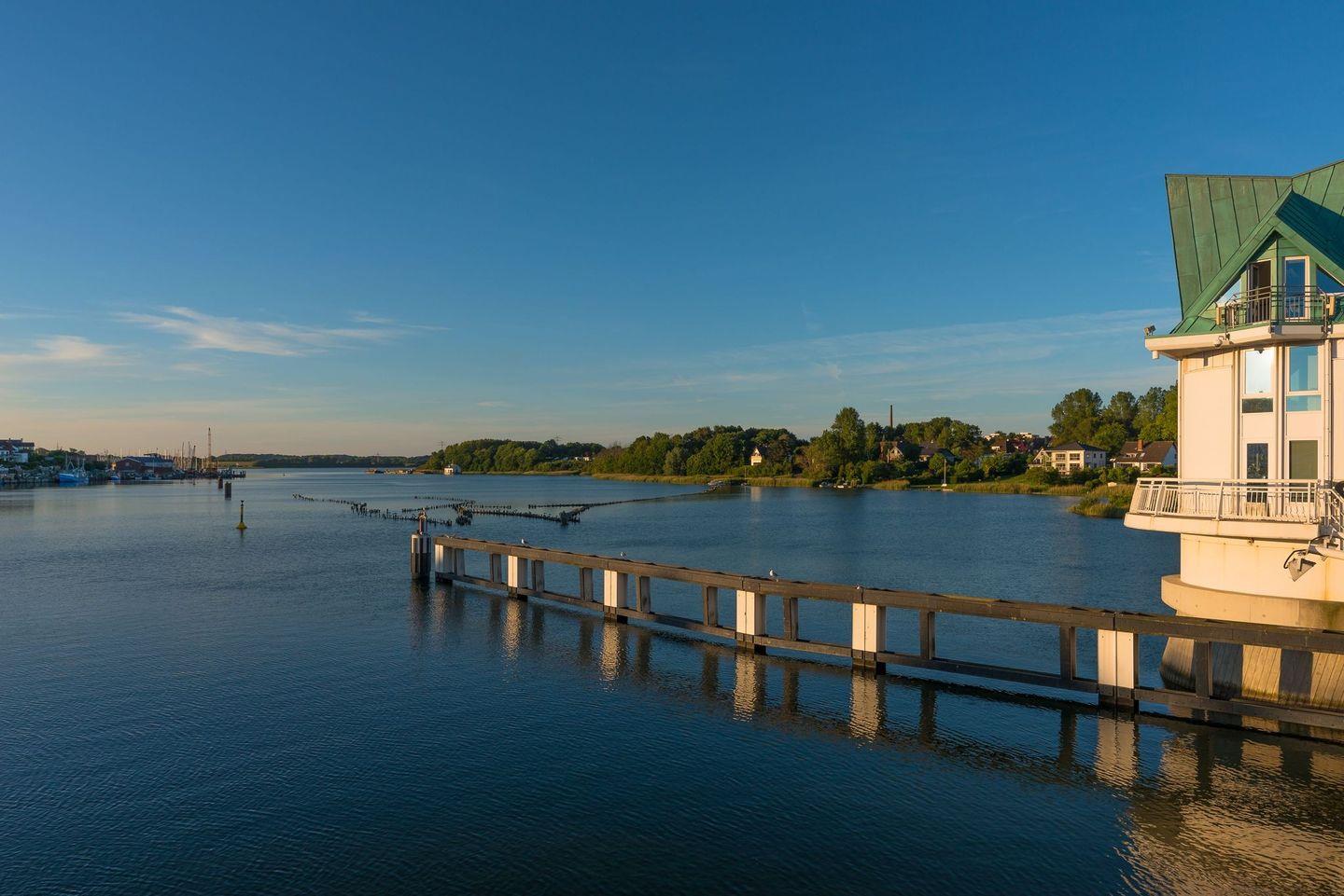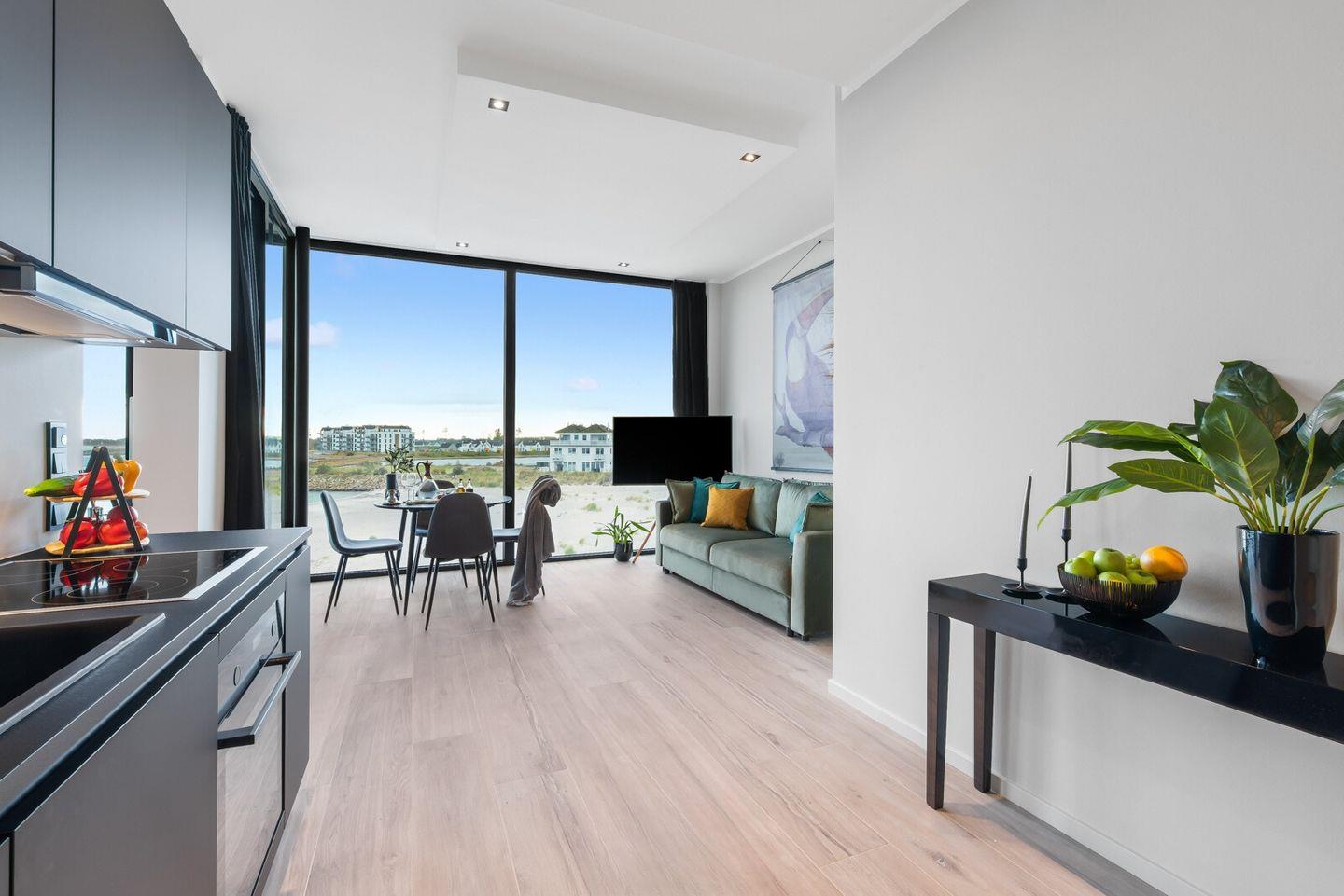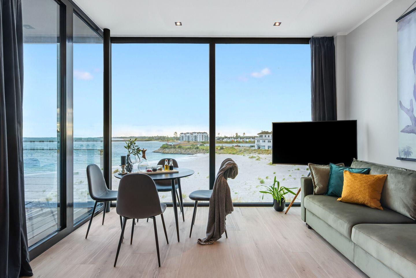 Der offene Wohn-Essbereich hat eine voll ausgestattete Küche. Große Panoramafenster bieten spektakulären Blick auf den Strand der Olpenitz Badebucht, das Hafenbecken und die weite Ostsee. Die Wohnung verbindet Eleganz und Komfort, das offene Raumkonzept ist perfekt für gemeinsame Stunden.