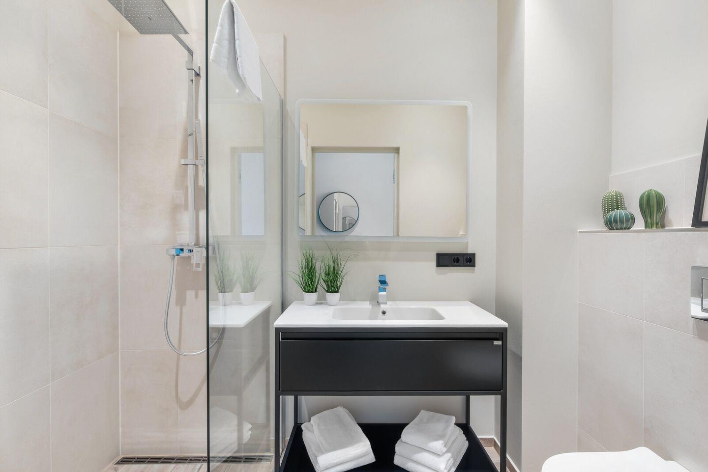 Das Badezimmer hat eine ebenerdige Dusche und passt perfekt zum stilvollen Ambiente der Wohnung.
