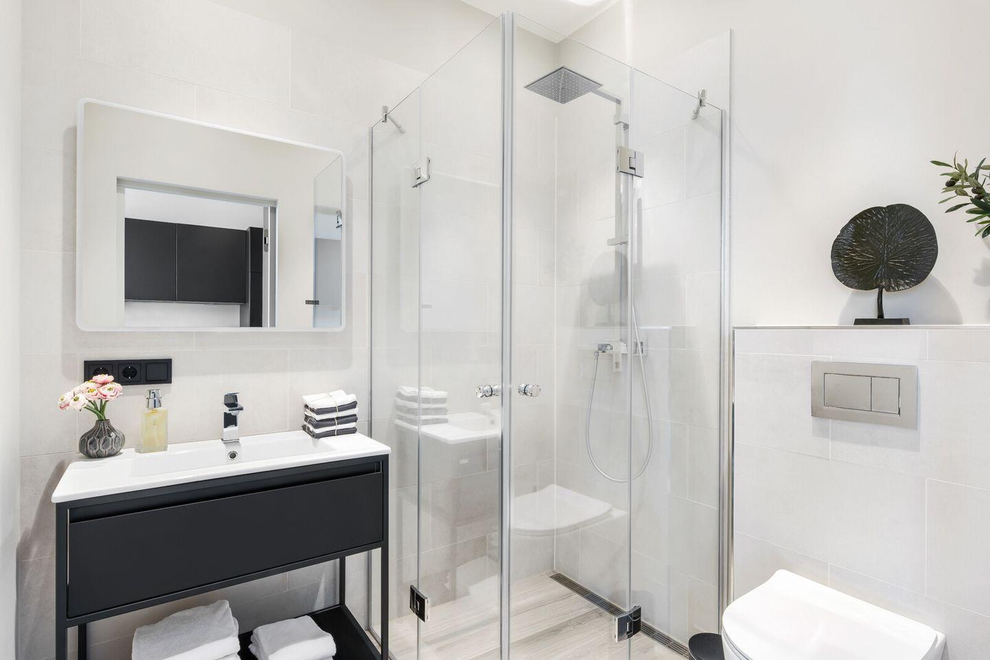 Das elegant gestaltete Badezimmer mit ebenerdiger Dusche fügt sich perfekt in das puristische Design der Wohnung ein und bietet alles, was man für einen Ostseeurlaub benötigt