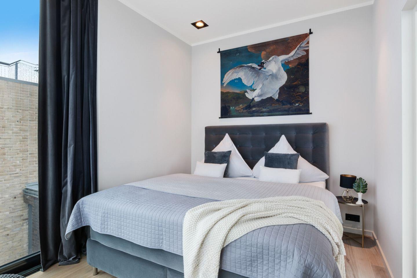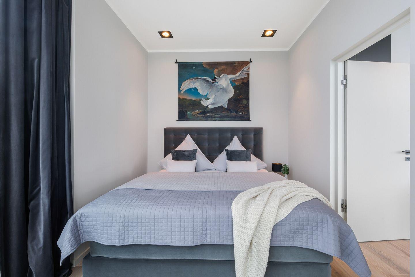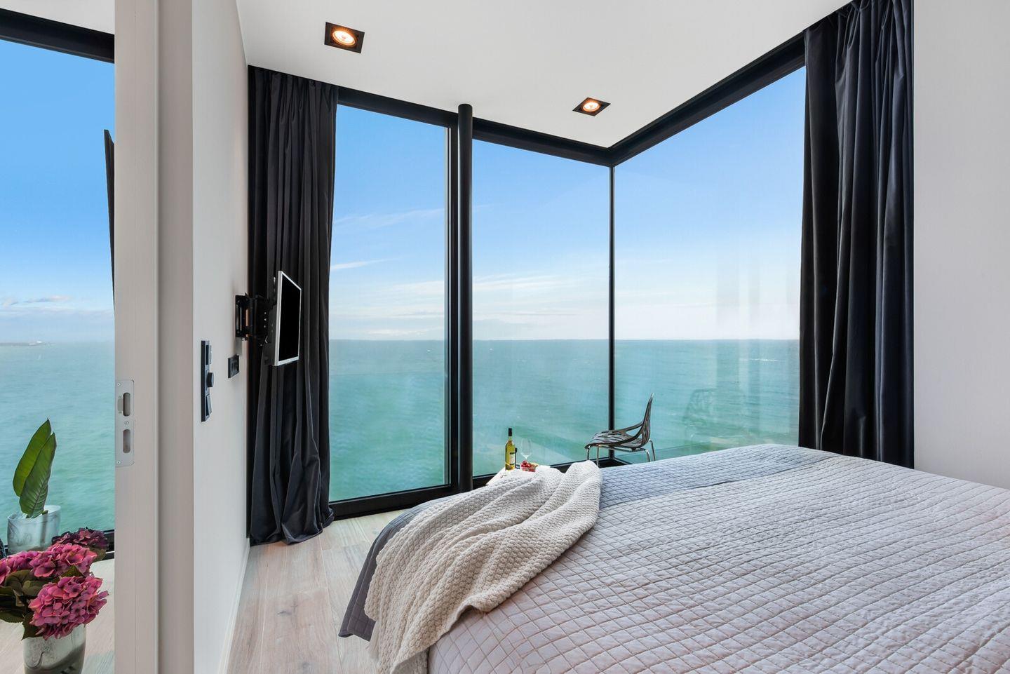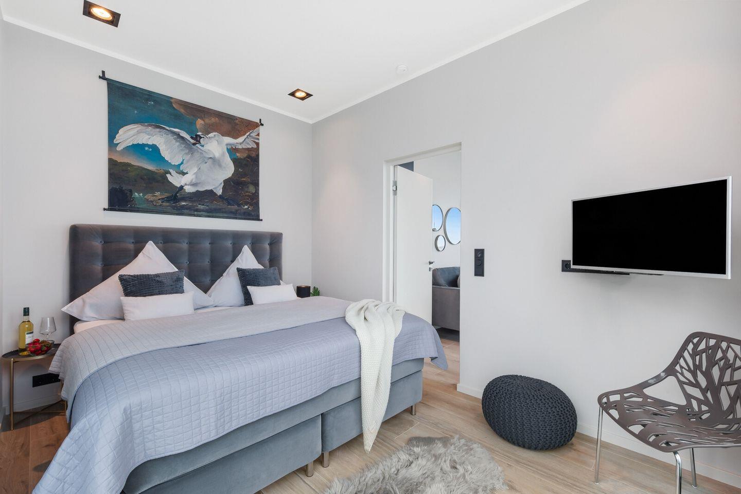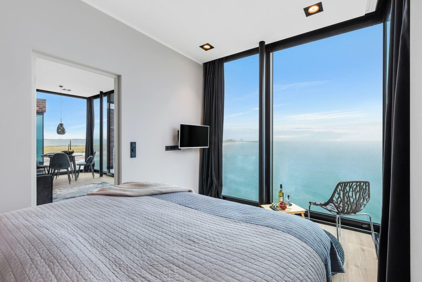 Das Schlafzimmer ist mit bodentiefen Panoramafenstern, einem komfortablen Doppelboxspringbett und einem Flatscreen-TV ausgestattet. Hier können Sie auch Nachts dem Rauschen des Meeres lauschen und die auf die freie Ostsee blicken.