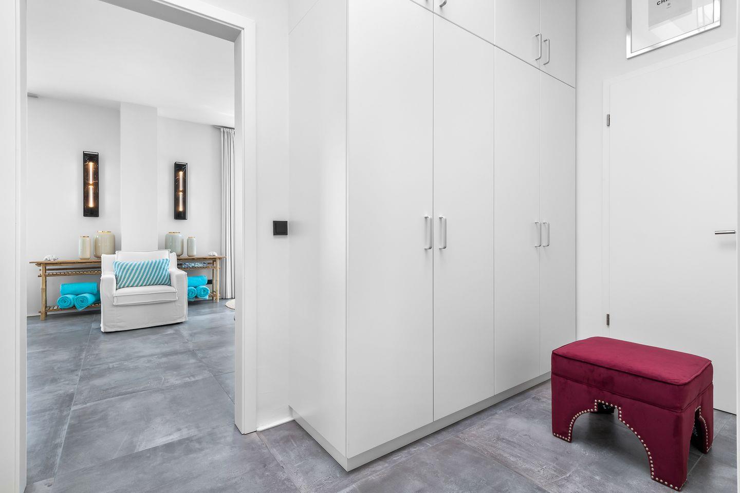 Im Obergeschoss finden Sie drei geräumige Schlafzimmer mit bodentiefen Fenstern, einem begehbaren Kleiderschrank und hochwertigen Boxspringbetten. Eine frei stehende Badewanne im Masterbedroom und eine große Sauna bieten puren Luxus zur Entspannung.