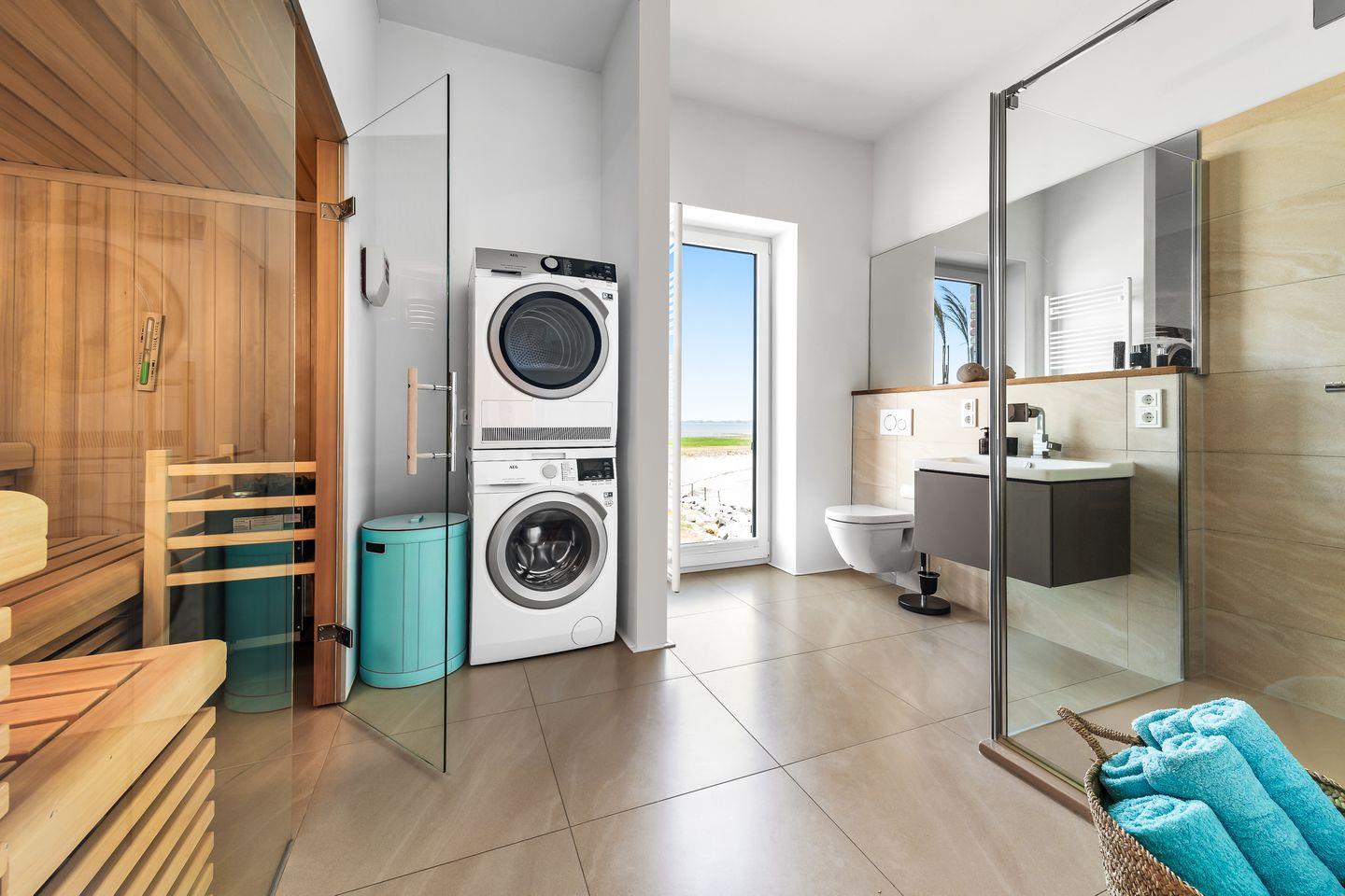Drei Badezimmer, inklusive Sauna, und ein gemütlicher Kamin schaffen wohlige Wärme und Entspannung zu jeder Jahreszeit. Fußbodenheizung trägt zum Komfort bei. Bodentiefe Panoramafenster tauchen die Räume in Licht und bieten spektakuläre Ausblicke auf die Ostsee.