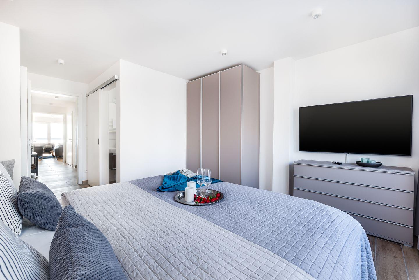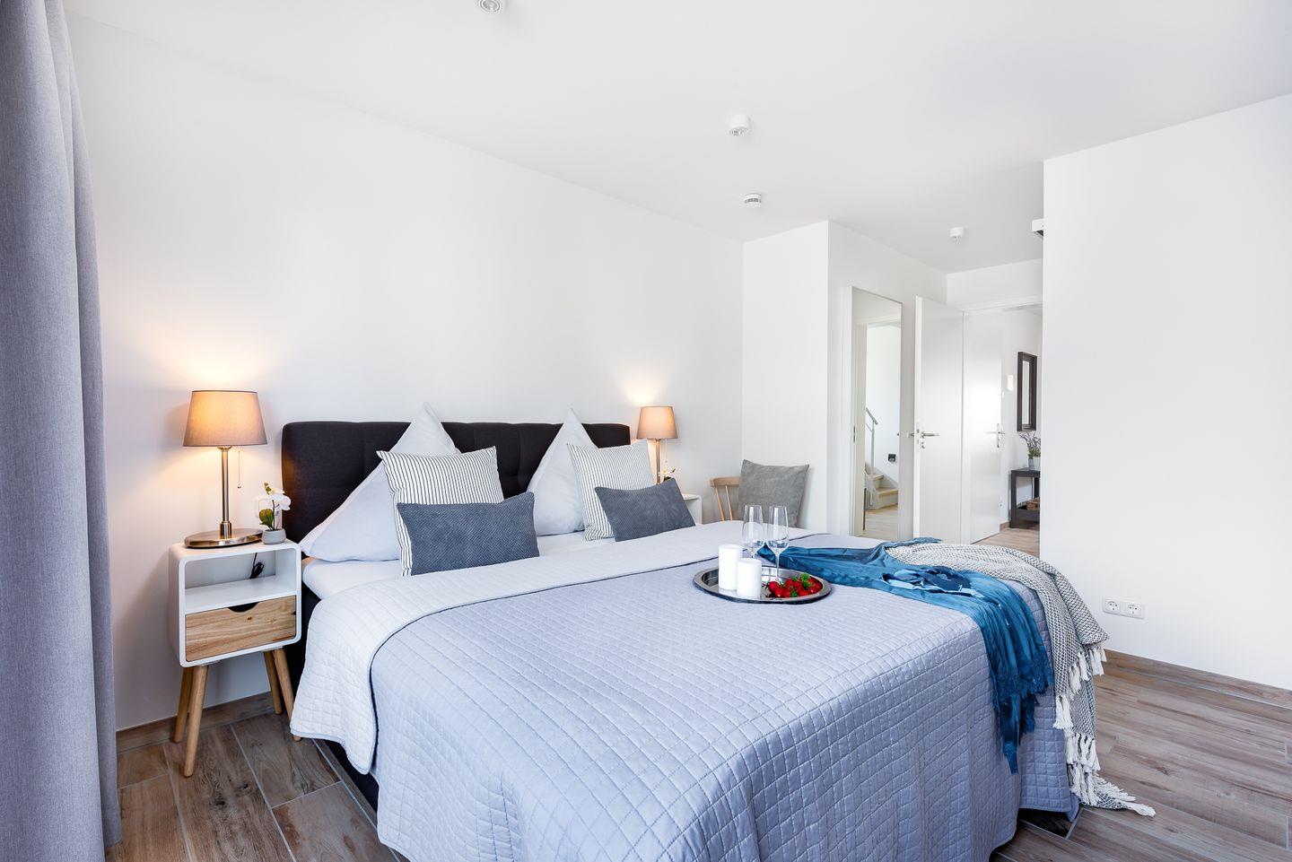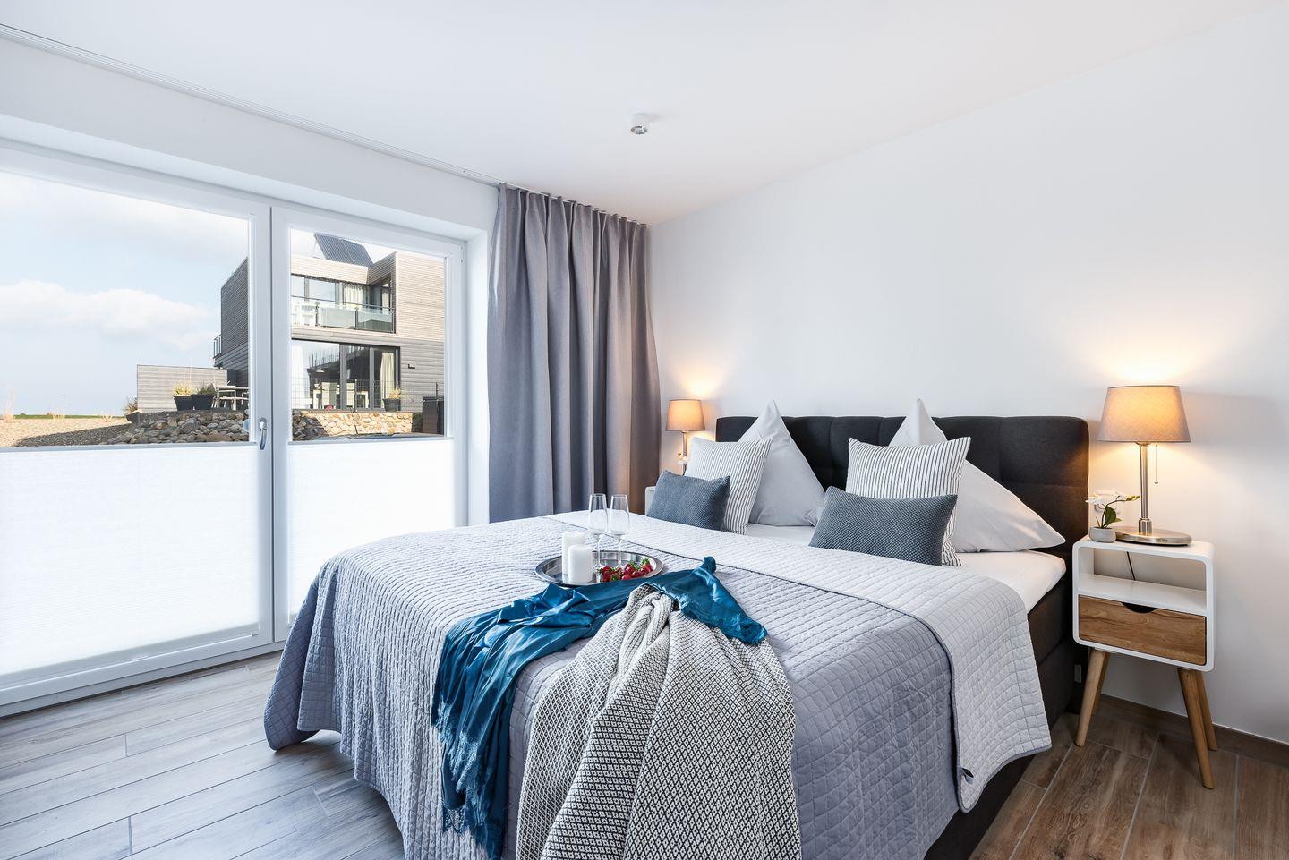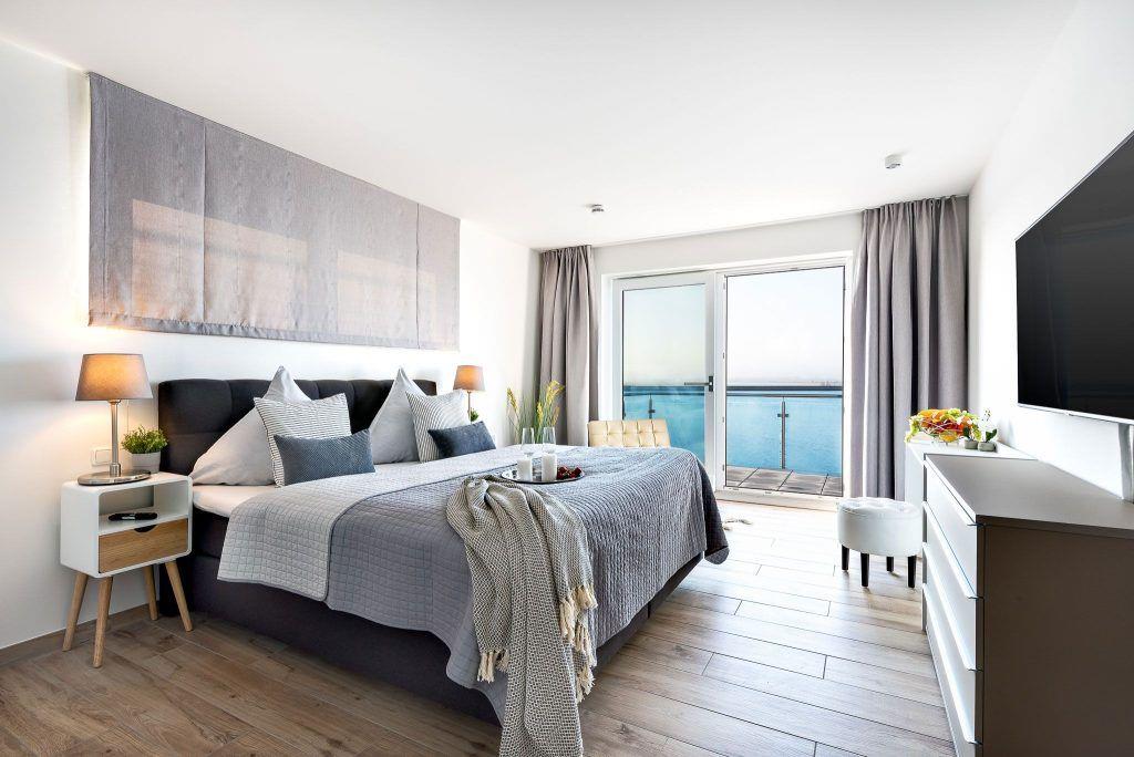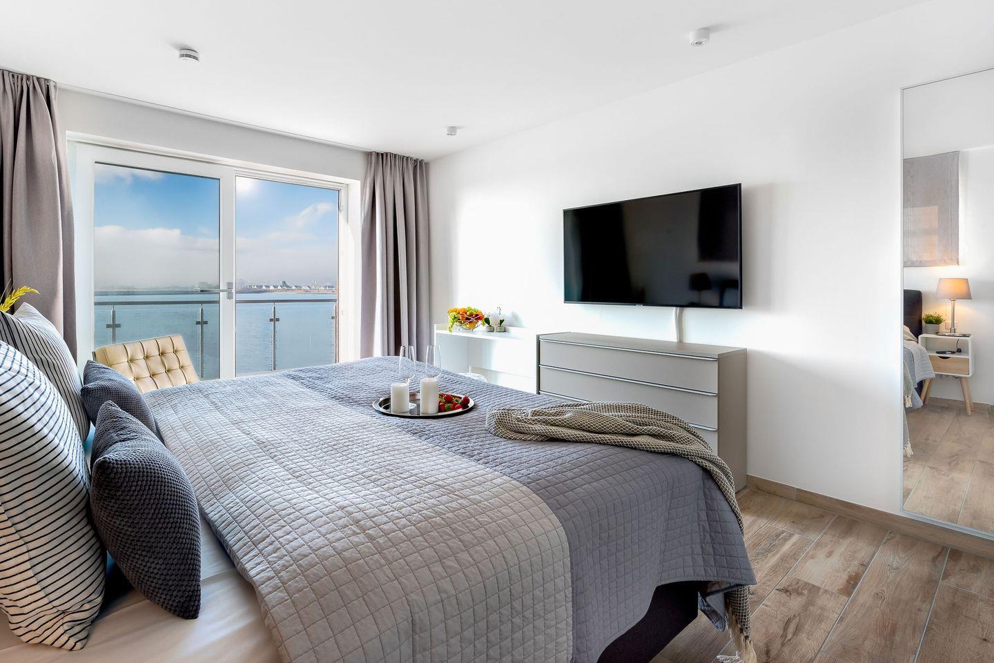 Die Ostsee-Ferienwohnung "Sea 65" beherbergt zwei stilvolle Schlafzimmer, wobei ein optionales drittes Zimmer unter "Sea 65 Plus" hinzugebucht werden kann, perfekt für größere Familien oder Gruppen bis zu 6 Personen. Jedes Schlafzimmer verfügt über ein eigenes Badezimmer. Eine frei stehenden Whirlwanne mit einzigartigem Wasserblick finden Sie im Badezimmer im Obergeschoss. Die finnische Sauna lädt zum Entspannen ein.