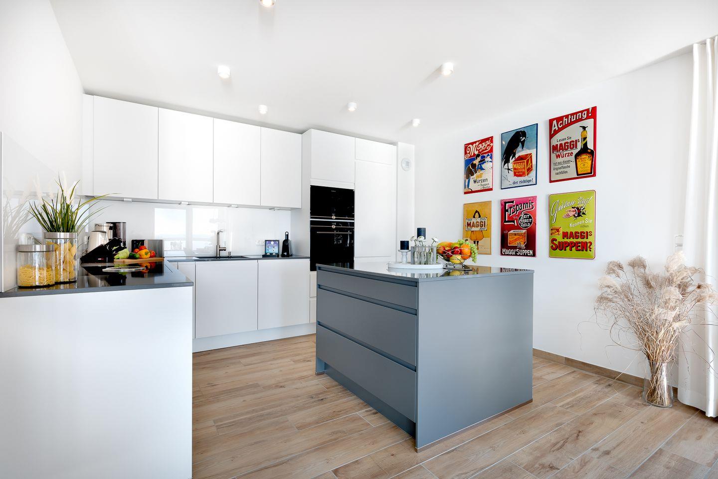 Die offene Küche ist voll ausgestattet und perfekt integriert in den Wohnbereich, sodass Sie beim Kochen stets in guter Gesellschaft sind und alles im Blick haben. Ein gemütlicher Wohn- und Essbereich mit einem großen Ecksofa, einem Sessel und einem Kaminofen lädt zu entspannten Abenden ein. Draußen erweitert eine direkt am Wasser gelegene Terrasse mit komfortablen Gartenmöbeln und Grill die Wohnfläche ins Freie.