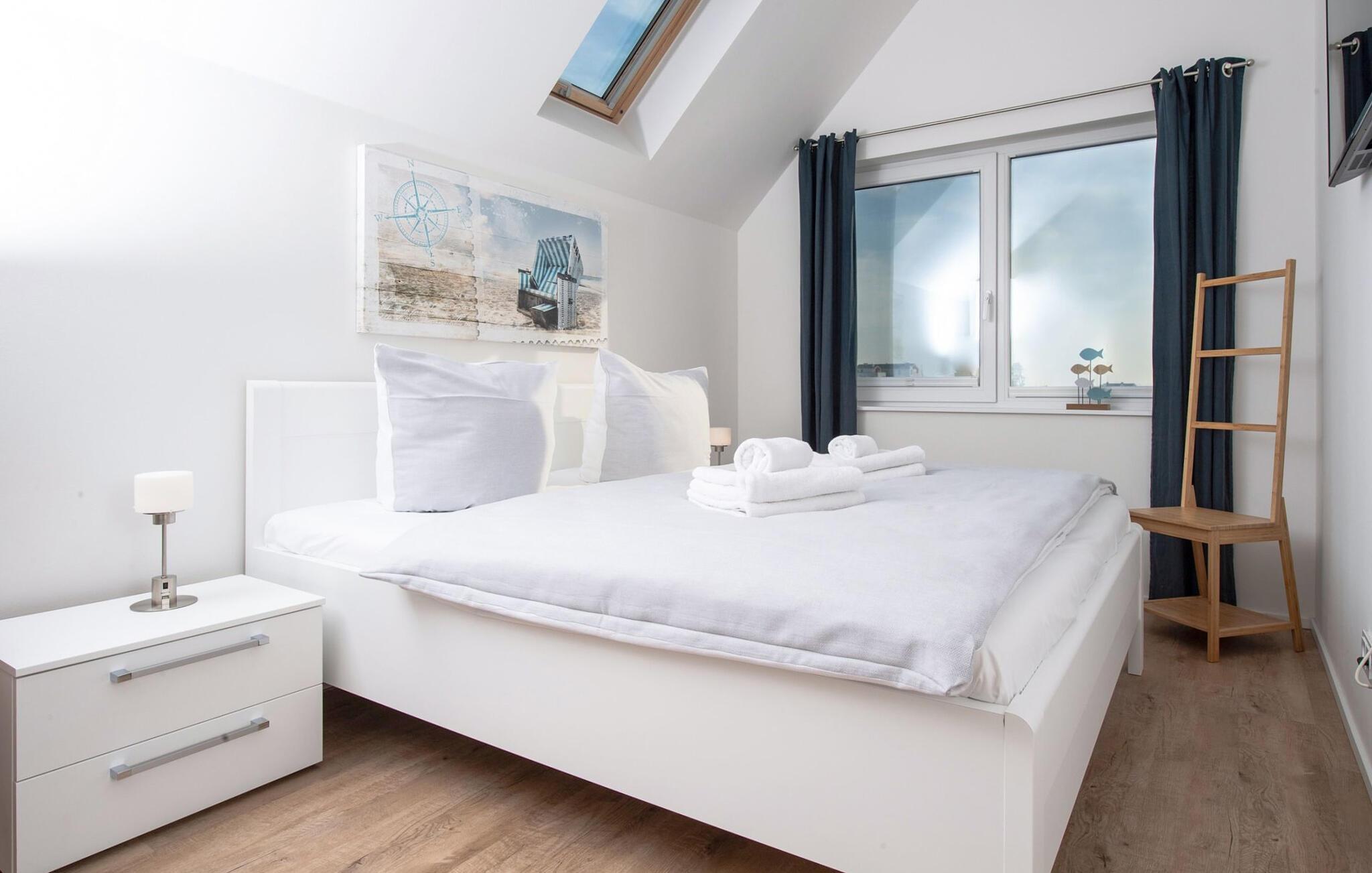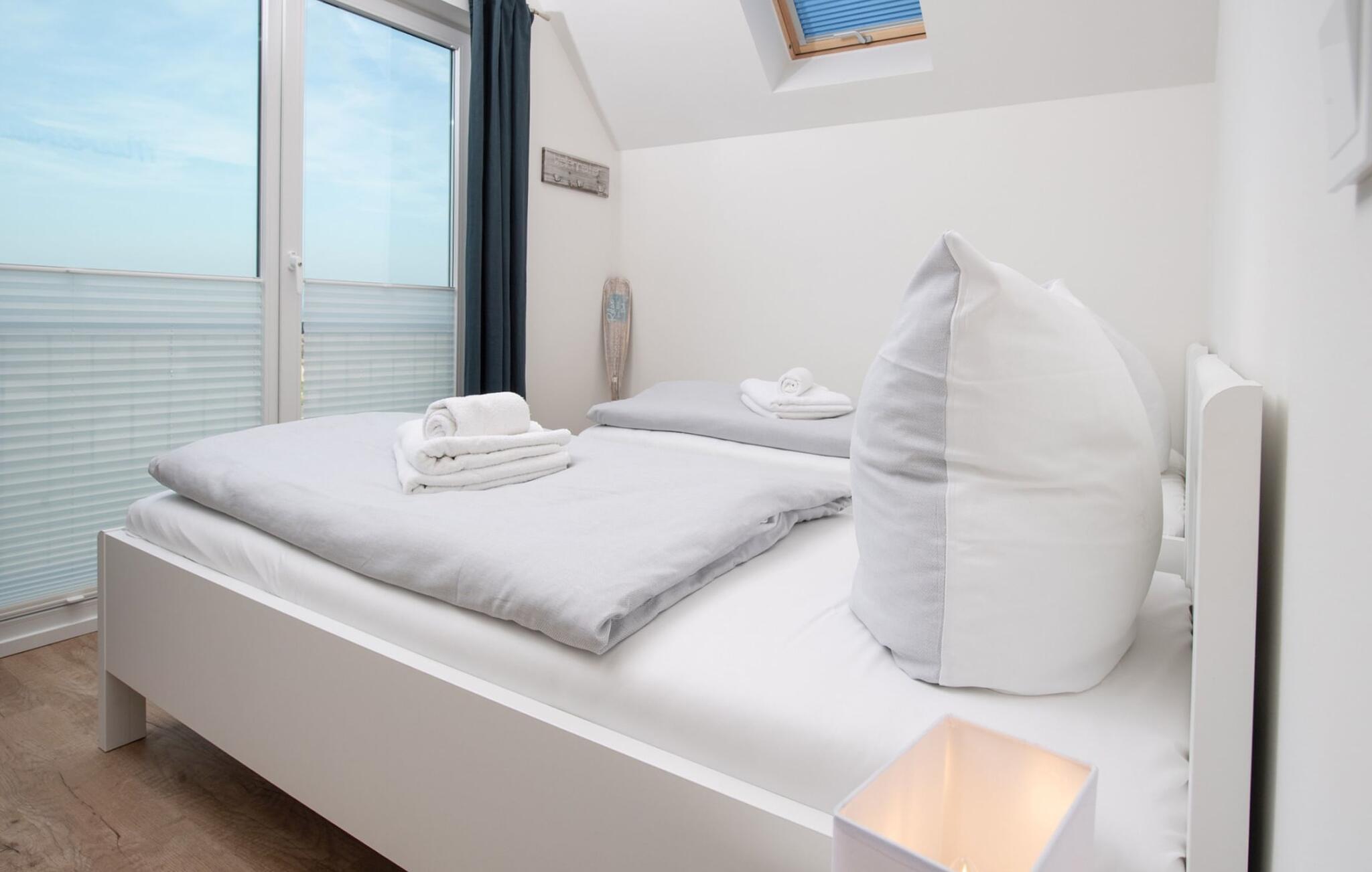 Auf der zweiten Ebene befindet sich der Ruhebereich des Ferienobjekts. Das Hauptschlafzimmer verfügt über einen traumhaften Hafenblick aus dem kuscheligen Doppelbett. Einschlafen unter Sternen, ein Dachfenster erlaubt nicht nur den Blick in den Sternenhimmel, sondern auch in traumhafte Wolkenformationen, die so charakteristisch sind für den Norden. Das zweite Schlafzimmer bietet zwei flexibel zusammenschiebbare Einzelbetten mit Blick über die Schleimündung. Im Wohnbereich steht ein komfortables Schlafsofa mit echter Federkernmatratze für zwei Personen zur Verfügung.