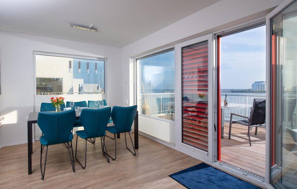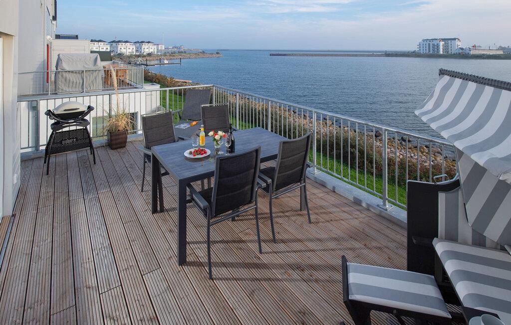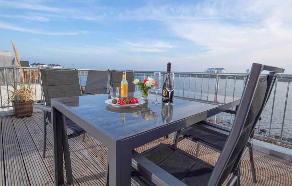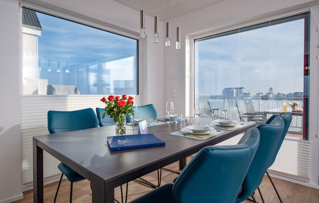 Lichtdurchflutet gestaltet sich der Wohn- und Essbereich des Ferienobjekts mit bodentiefen Panorama-Fensterfronten zu der anliegenden Dachterrasse auf der einen und dem Balkon auf der anderen Seite. Traumhafte Aussichten eröffnen sich auf der an den Essbereich angrenzenden Terrasse mit Blick über den Segel- und Sportboothafen des OstseeResort Olpenitz. Ob romantisches Candle-Light-Dinner, gesellige Grillrunde oder Entspannung im Strandkorb, Hafenkino und traumhafte Sonnenansichten sind garantiert.