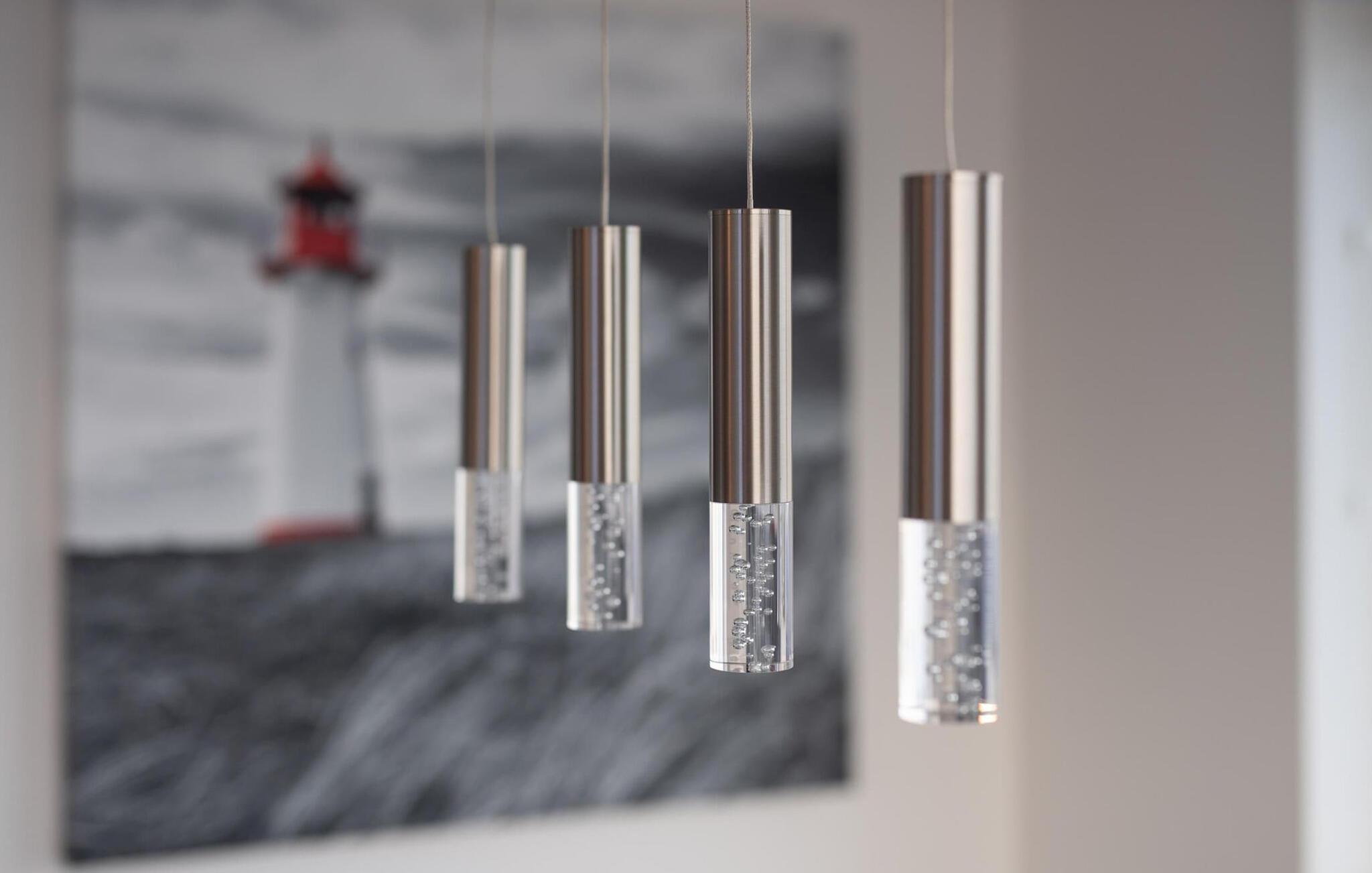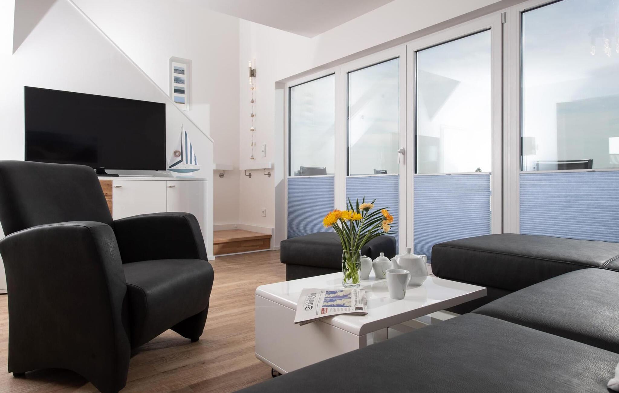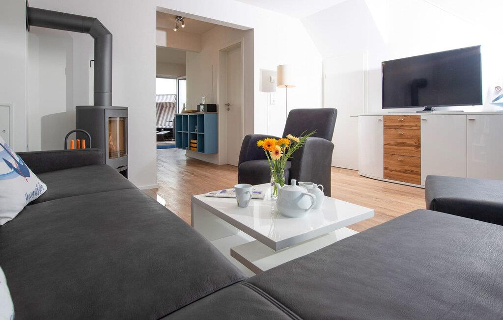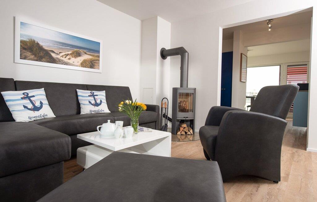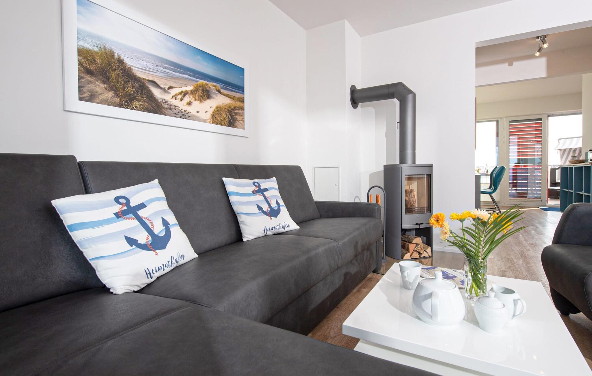 Kuschelig wird es im Wohnzimmer, denn hier lädt eine gemütliche Sitzlandschaft an Schietwettertagen zu einem Kaminabend ein. Für Indoor Entertainment sorgt außerdem der Smart TV. Die Fußbodenheizung im ganzen Objekt sorgt außerdem für wohligen Komfort.
