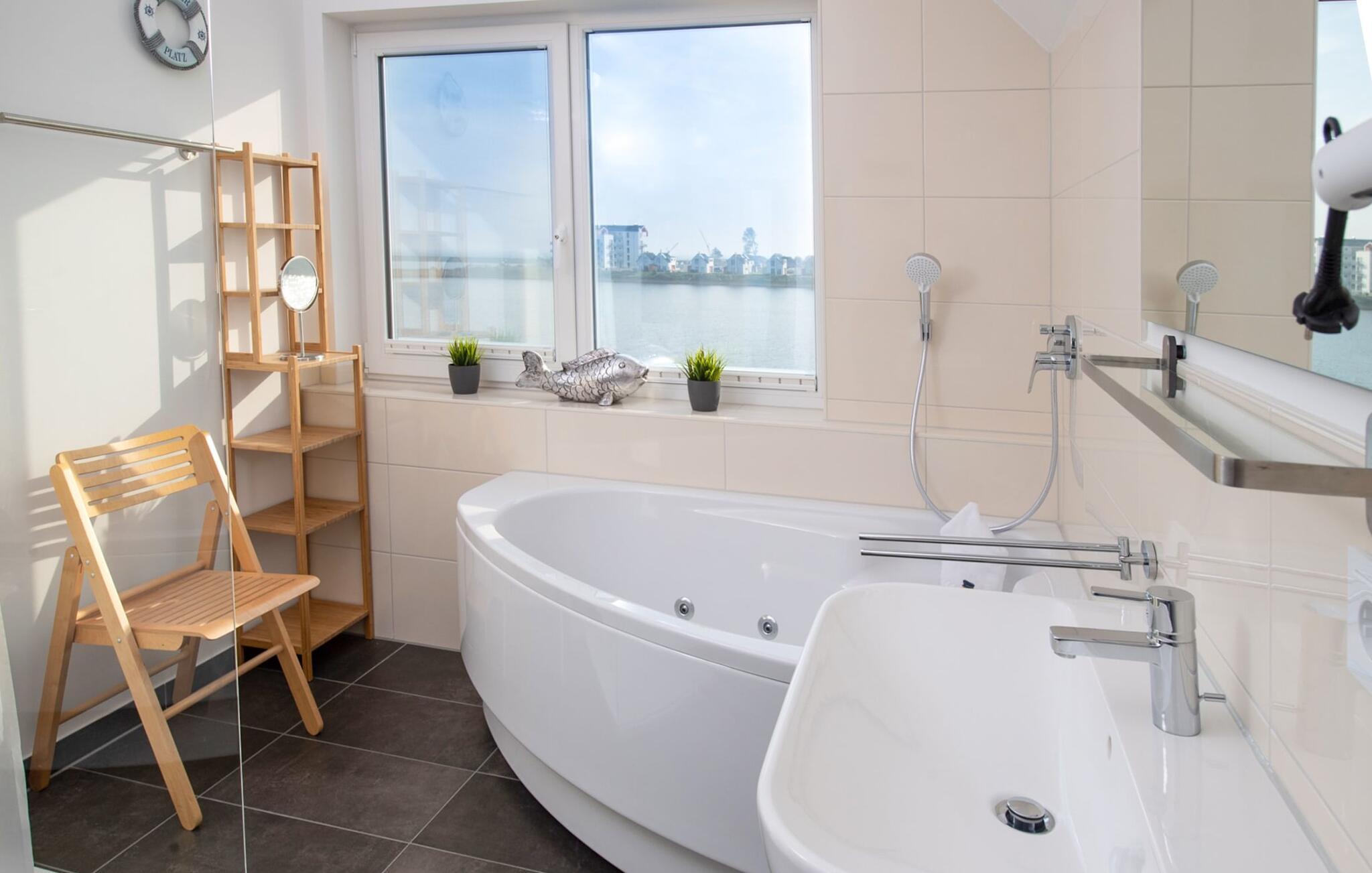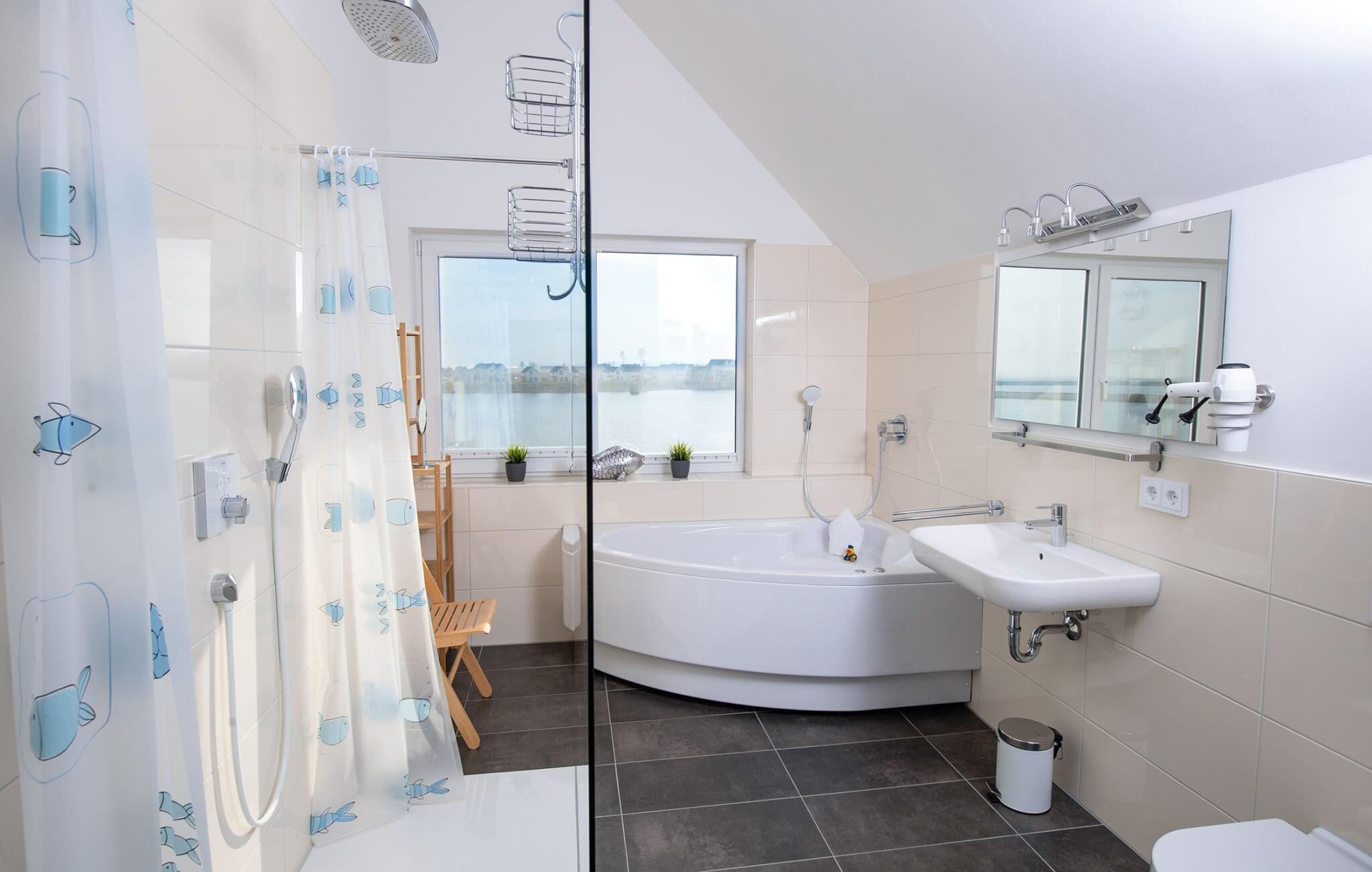 Ein privater Wellnessbereich mit Sauna und Whirlwanne lädt zum Entspannen ein: Eine Infrarot-Sauna Wärmekabine mit Hifi-Sound-System und LED-Farblichttherapie sowie eine große Relax-Whirlpool-Badewanne mit Meerblick (Ostsee/Schlei) stehen nach dem Strandspaziergang zum Entspannen bereit. Auch aus der Walk-In Dusche genießt man einen wundervollen Hafenblick.