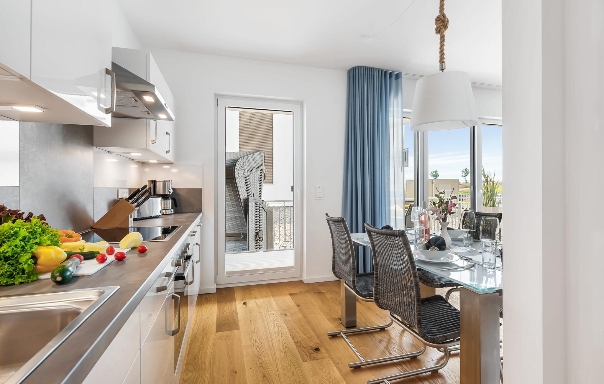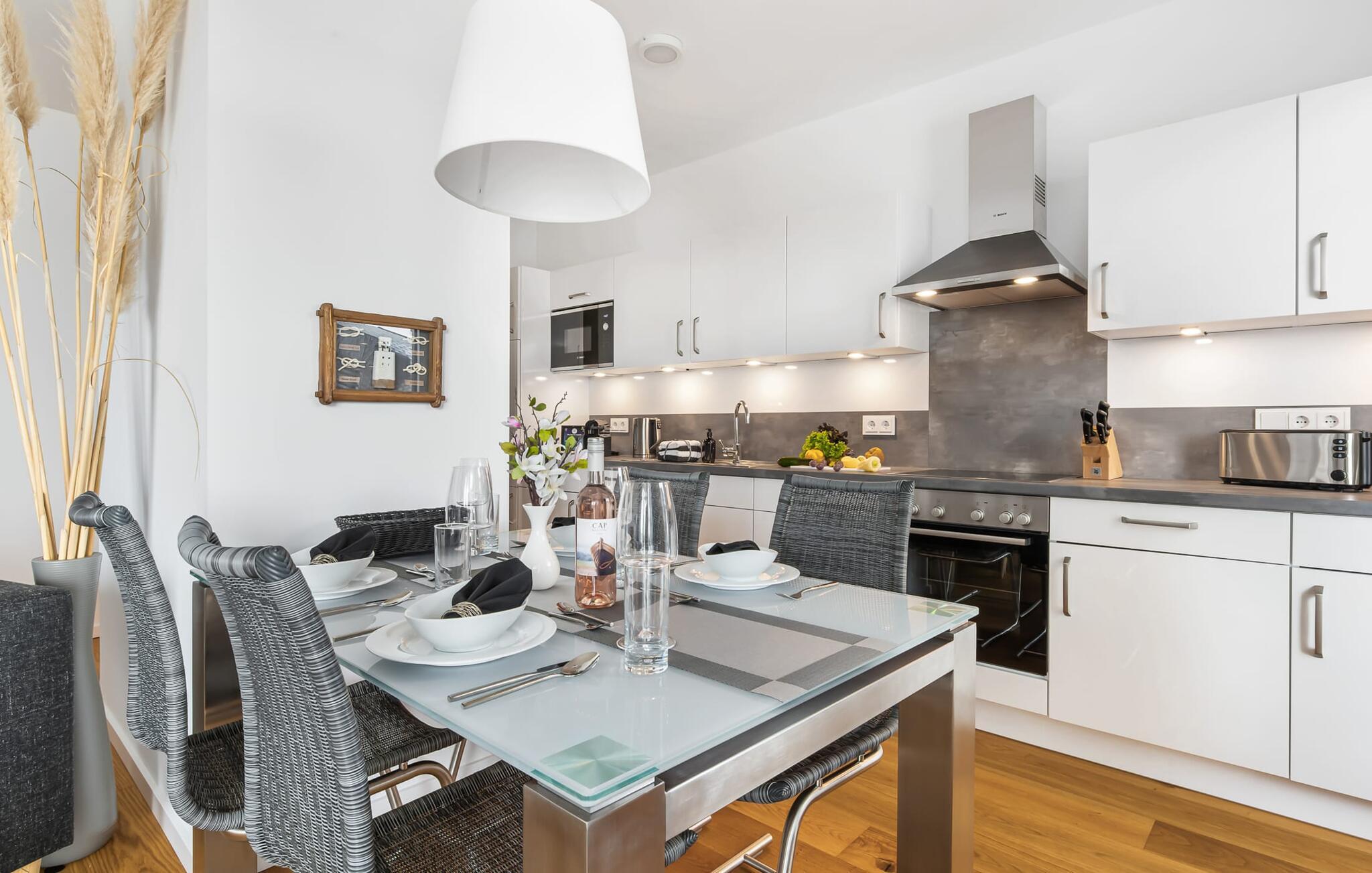Die integrierte Küche mit ihrer perfekten Ausstattung weckt selbst bei einem bekennenden Nicht-Koch Interesse. Ihr habt die Möglichkeit am Esstisch die leckeren Mahlzeiten bei seitlichem Meerblick zu genießen, oder ihr wählt den direkten Meerblick am großen Tisch auf dem überdachten Balkon. Bei der Kulisse schmeckt einfach alles!