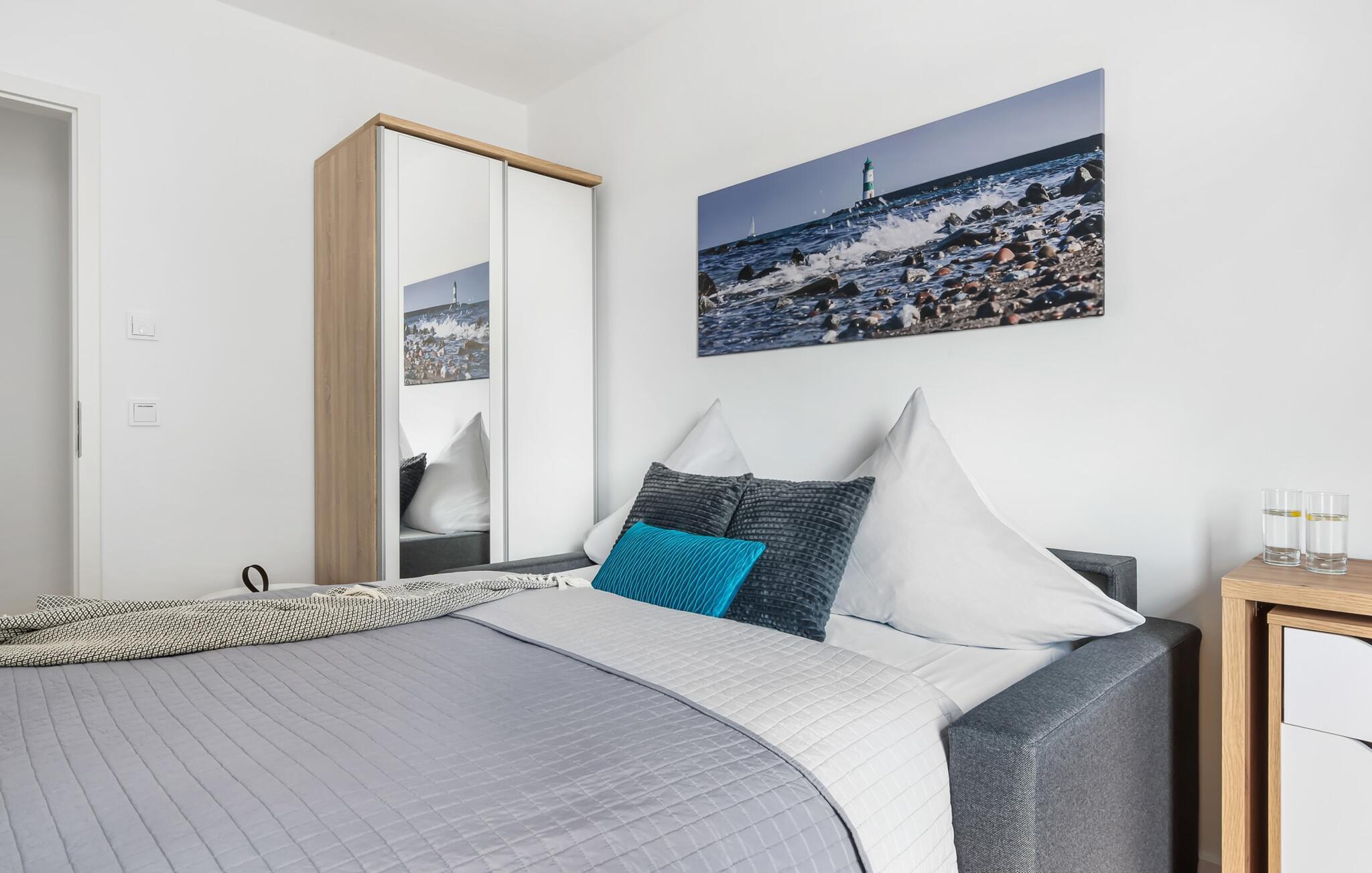 In beiden Schlafzimmern mit ihren ebenfalls bodentiefen Fenstern setzt sich die stilvolle und gemütliche Einrichtung fort. Im ersten Schlafzimmer könnt ihr in einem Doppelboxspringbett eure OSTSEETRÄUMCHEN wahr werden lassen. Das zweite Schlafzimmer ist multifunktional nutzbar. Für erholsame Nächte steht ein großes Schlafsofa bereit. Zwei Kommoden sind in vollwertige Arbeitsplätze verwandelbar um hier produktive oder kreative Stunden zu verbringen. Oder ihr nutzt die Kommoden als Stauraum und genießt einfach den Urlaub! Zur Unterhaltung steht euch hier ein weiterer Fernseher zur Verfügung.