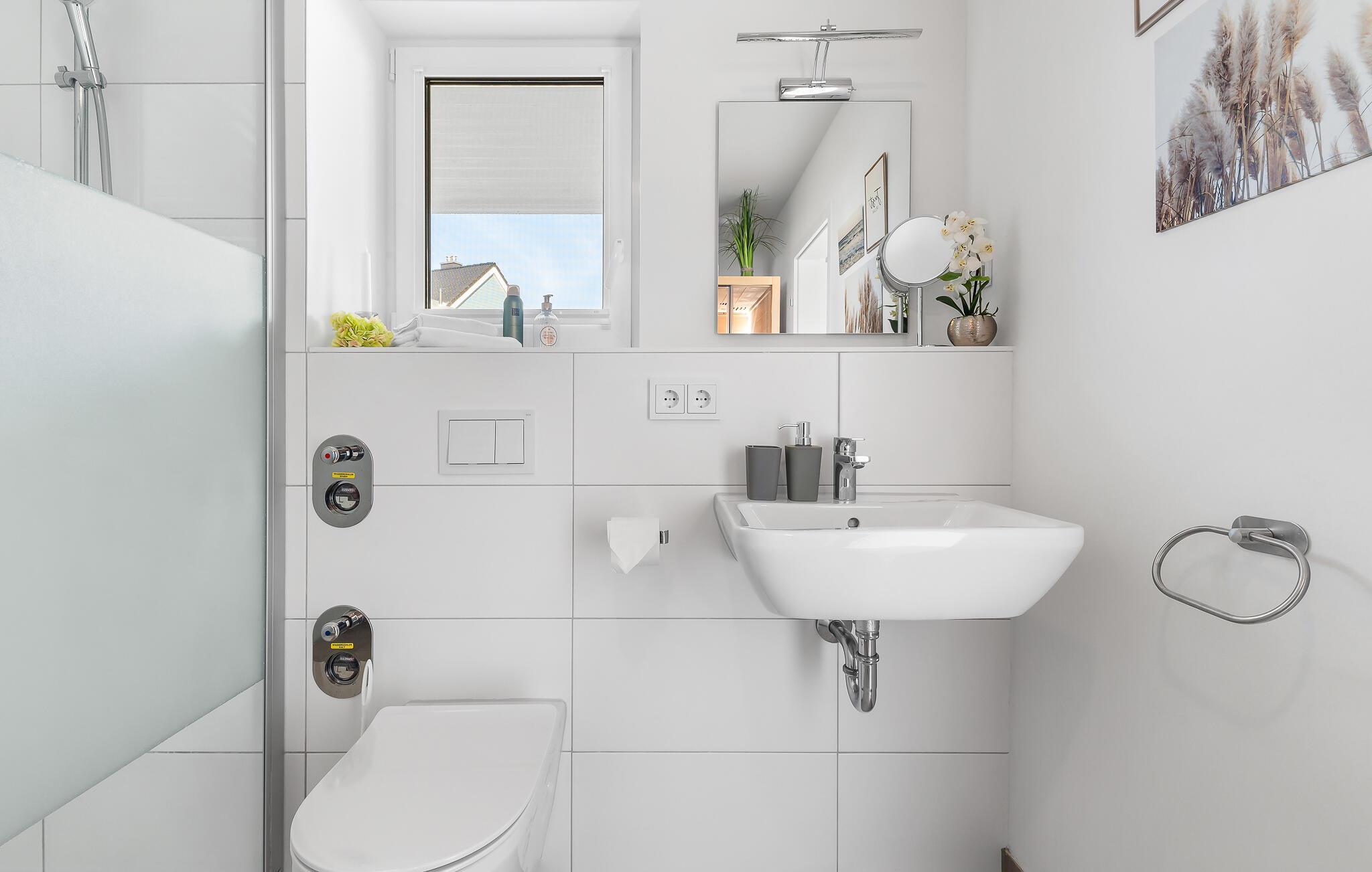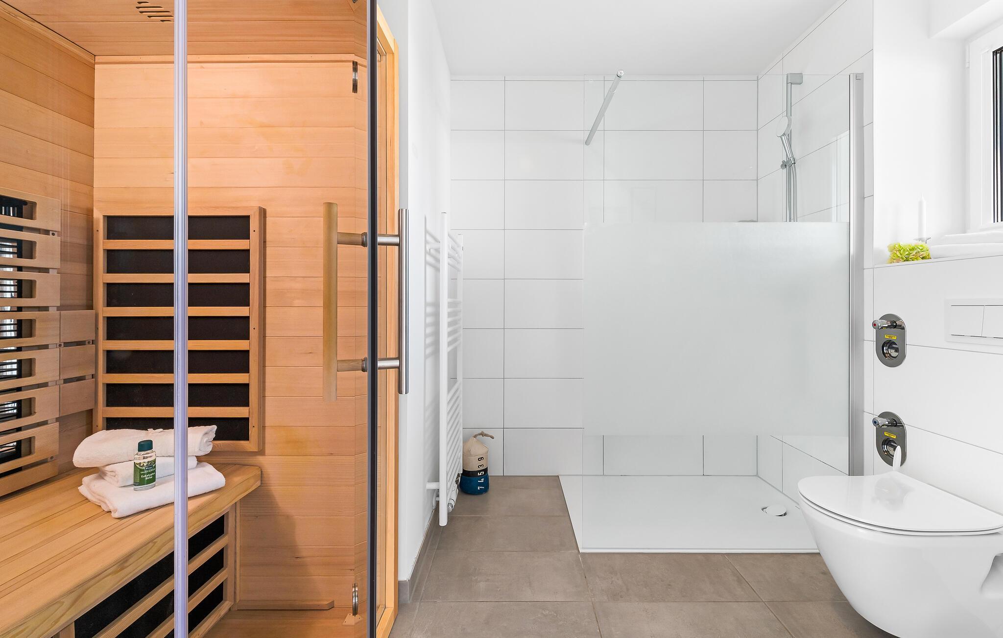 Für den perfekten Abschluss eines erlebnisreichen Urlaubstages sorgt das Bad. Eure ganz eigenen kleine Wellnessoase mit bodengleicher Dusche und einer Infrarot-Sauna.