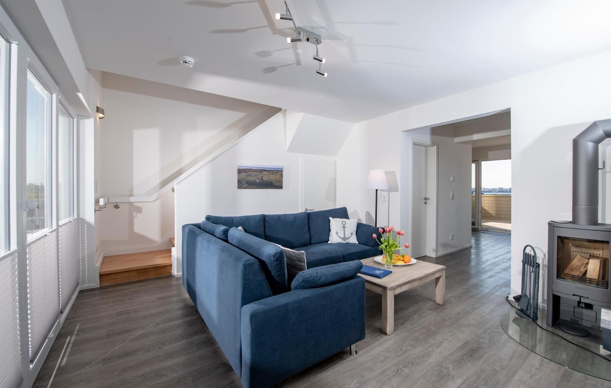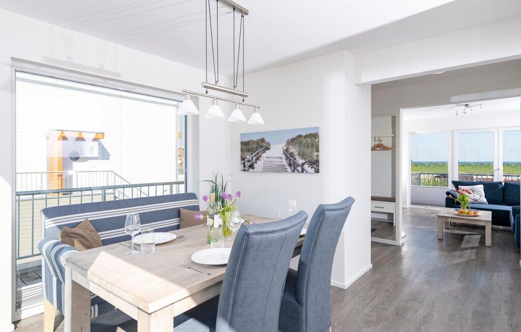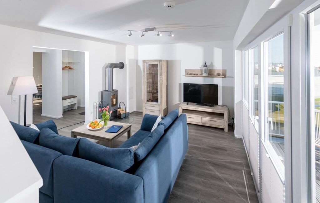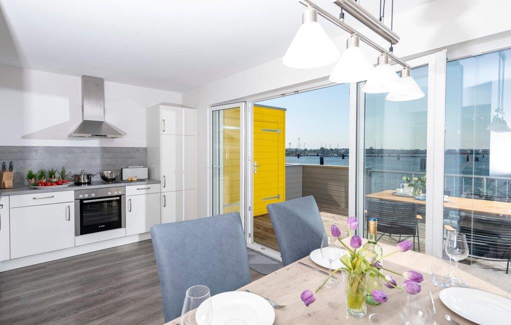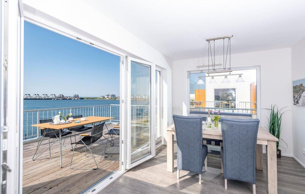 Bodentiefe Fensterfronten machen das Wasser zum Greifen nah und schaffen einen lichtdurchfluteten Wohnraum. Frische Energie tanken lässt es sich bei einem Frühstück auf der gen Osten ausgerichteten Terrasse. Wer früh genug ausgeschlafen hat, kann hier traumhafte Sonnenaufgänge beobachten. Nach einem ausgiebigen Strandtag lädt die gen Westen ausgerichtete Terrasse mit Sonnenuntergangsgarantie zum romantischen Candle-Light-Dinner oder einem geselligen Grillabend ein. Hafenkino ist hierbei garantiert.