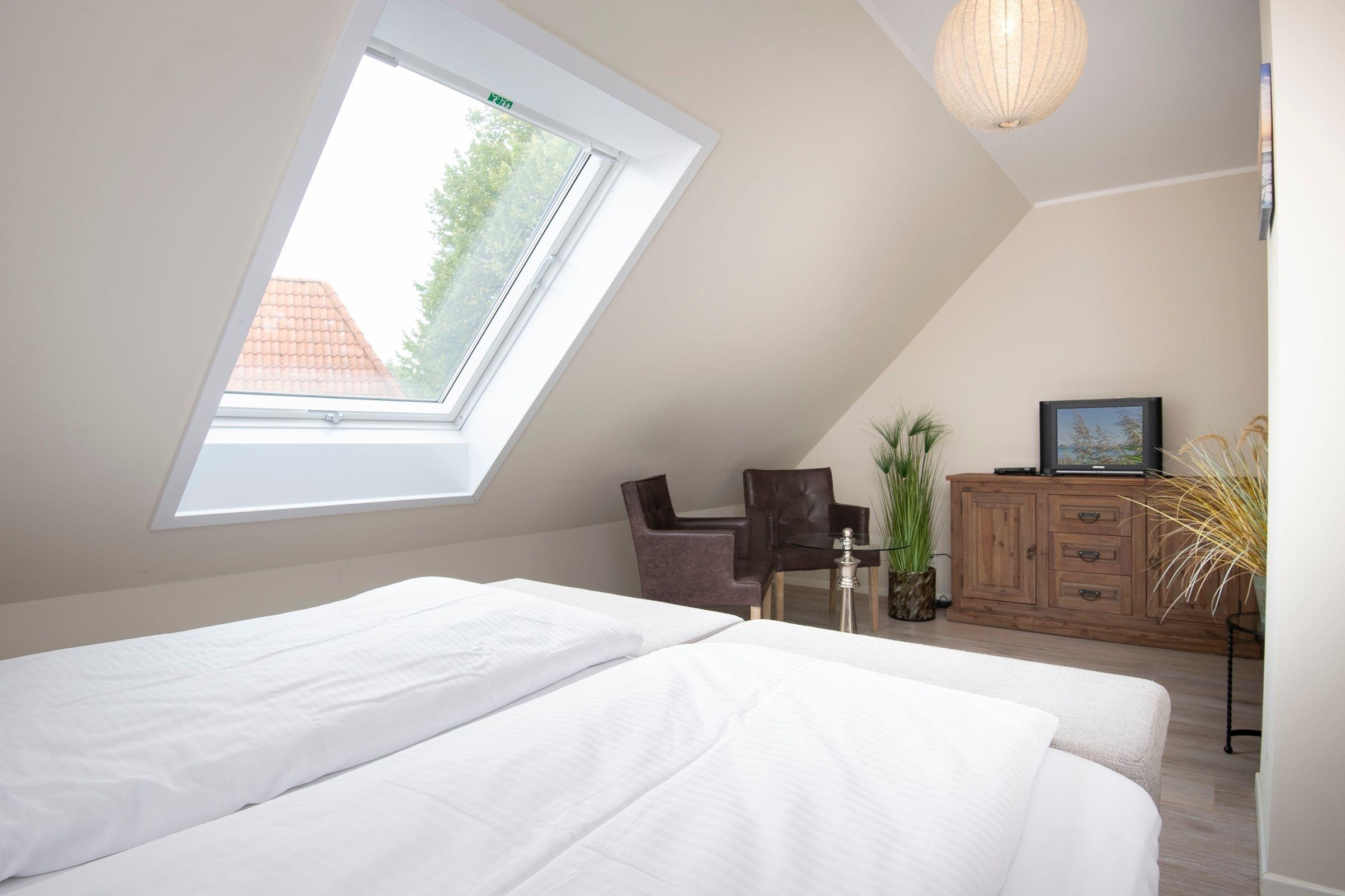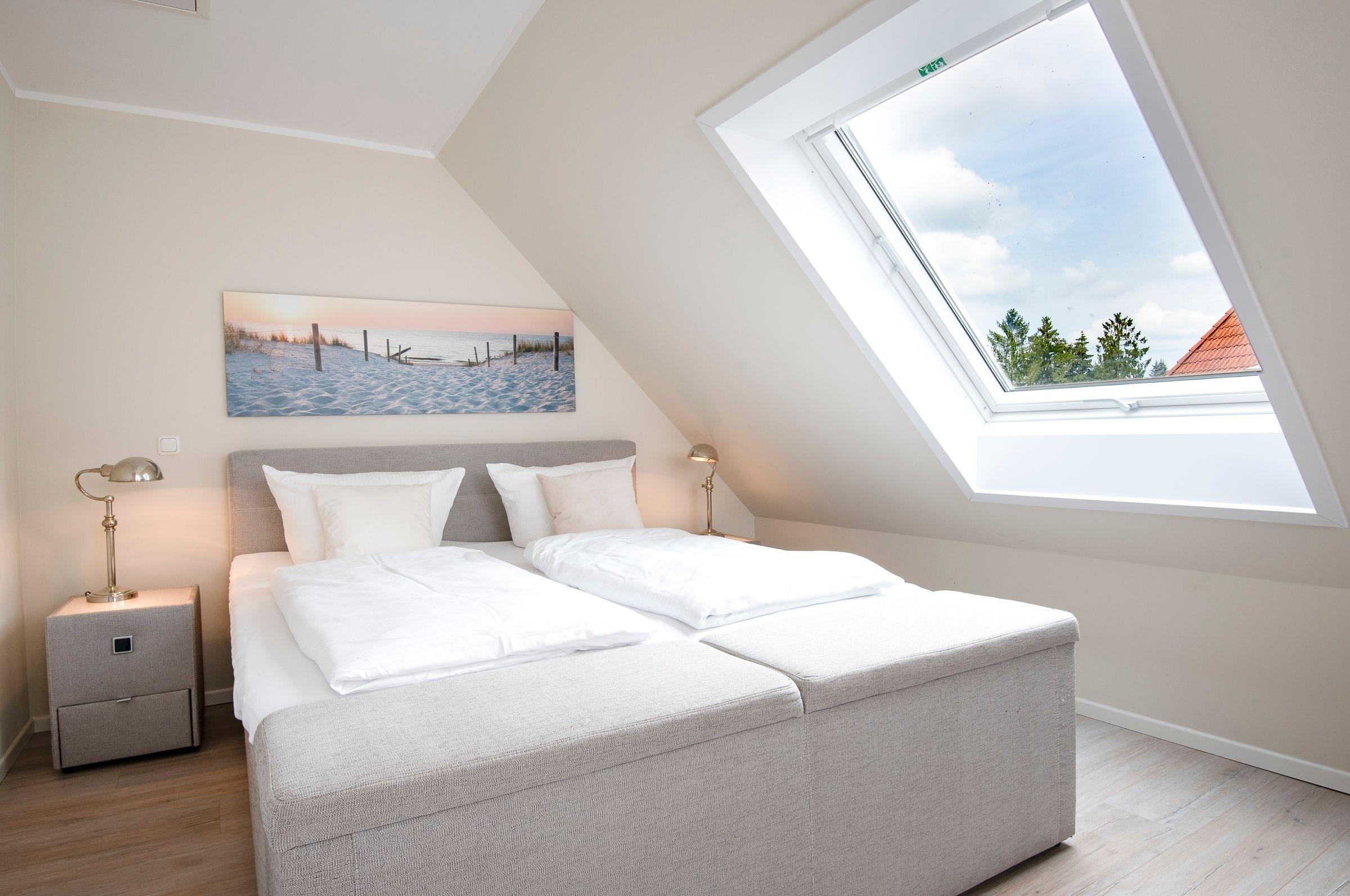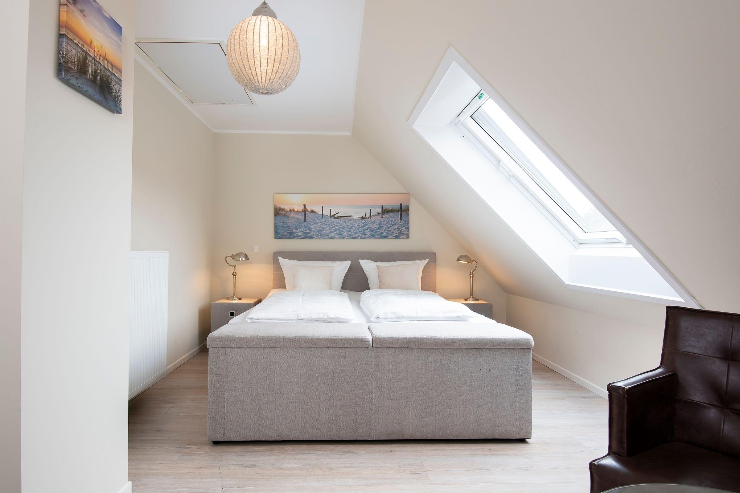 Schlafzimmer 1: 1 Boxspring-Doppelbett (180x200 cm), elektrische Verdunklungsrollos, Dachgeschoss.