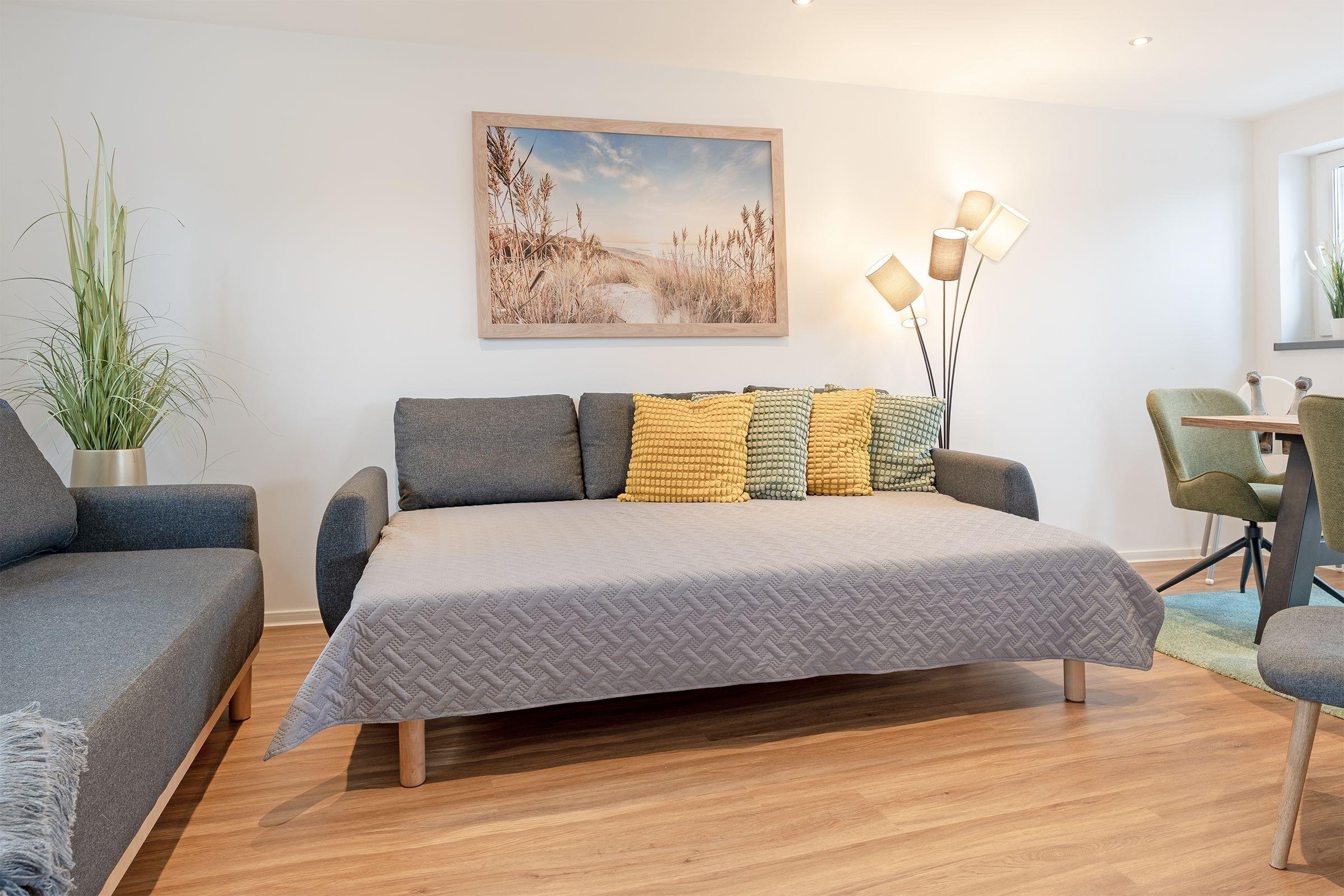 Wohnzimmer: Schlafsofa (ca. 140x200cm), Verdunkelung: Plissees und Jalousien, Platz für Kinderreisebett vorhanden