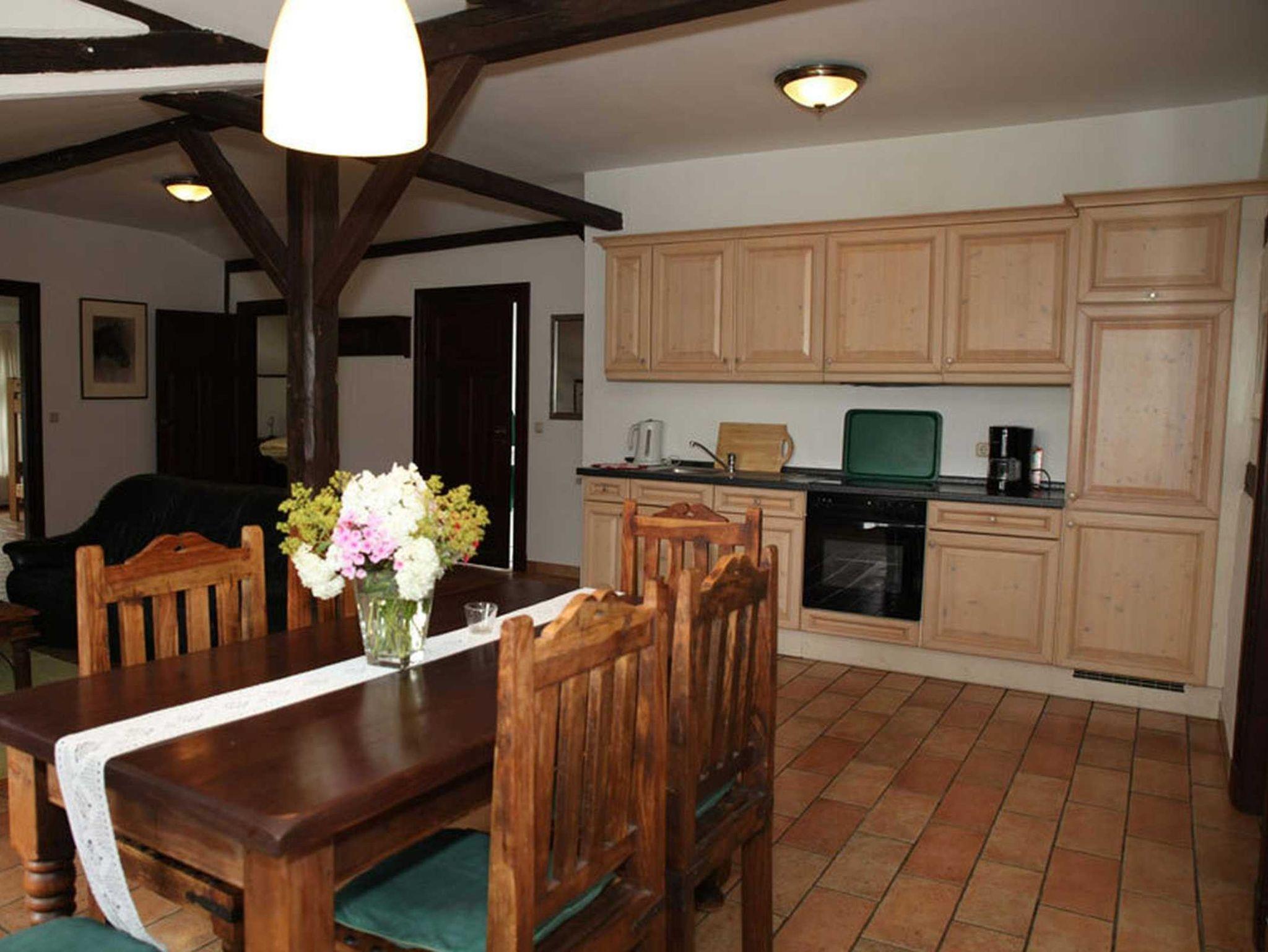 Mit mehr als 100 m² ist diese unsere größte Wohnung in der oberen Etage des Bauernhauses. In dem schönen über 40 m² großen Wohnzimmer sind eine voll ausgestattete Küche und ein großer Essplatz integriert und durch Fachwerk optisch von der gemütlichen Sitzgruppe getrennt. Die Leder-und Vollholzmöbel passen wunderbar zum Stil des Hauses.