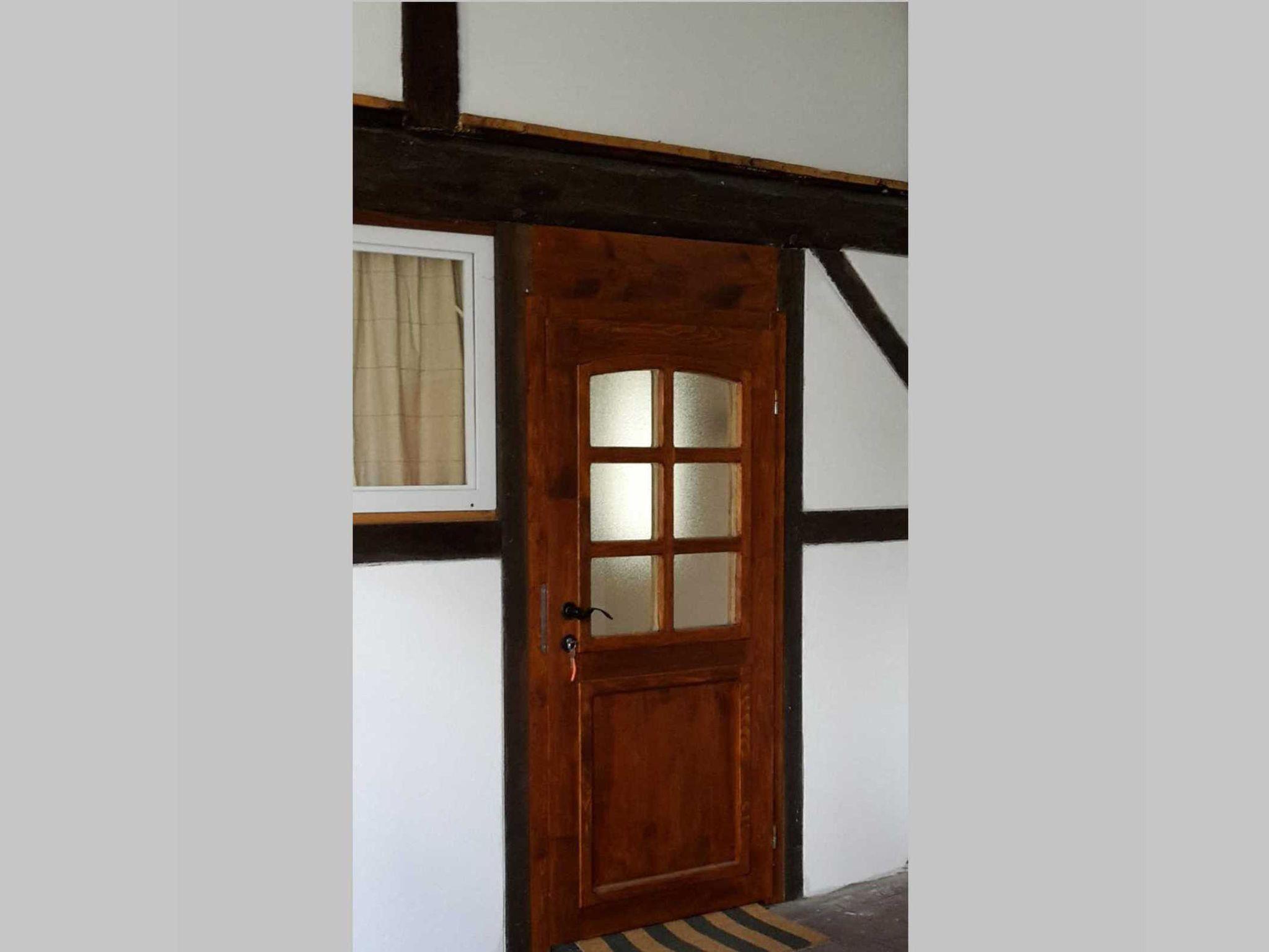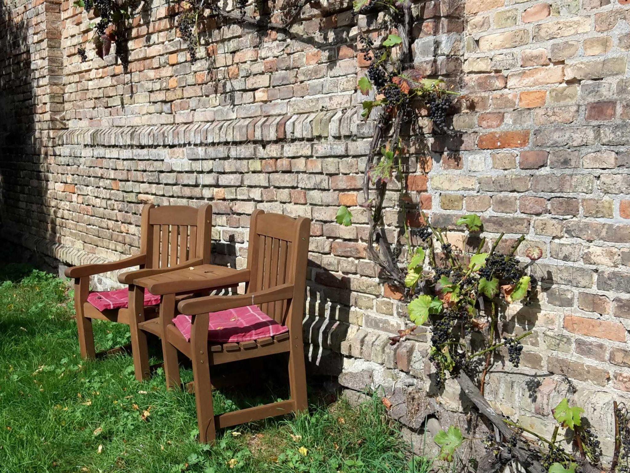 In dem Wohnraum sind Küche, Essplatz, Schlafzimmer und Sitzecke integriert. Die Wohnung ist mit schönem, massivem Holz- und Ledermobiliar eingerichtet. Sie schlafen in Einzelbetten, die bei Bedarf zusammenschiebbar sind. Aus der Terrassentür hat man einen direkten Zugang in den Garten, der direkt an den Feldrand grenzt.