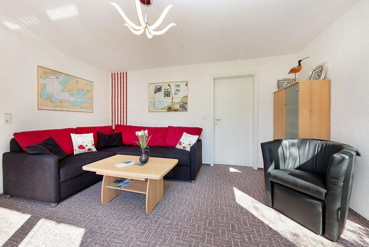 •Wohnzimmer mit Flachbild-TV, DVD-/CD-Player, Radio, Tisch, Stühle, Eckcouch mit Boxspringbett für die Aufbettungen