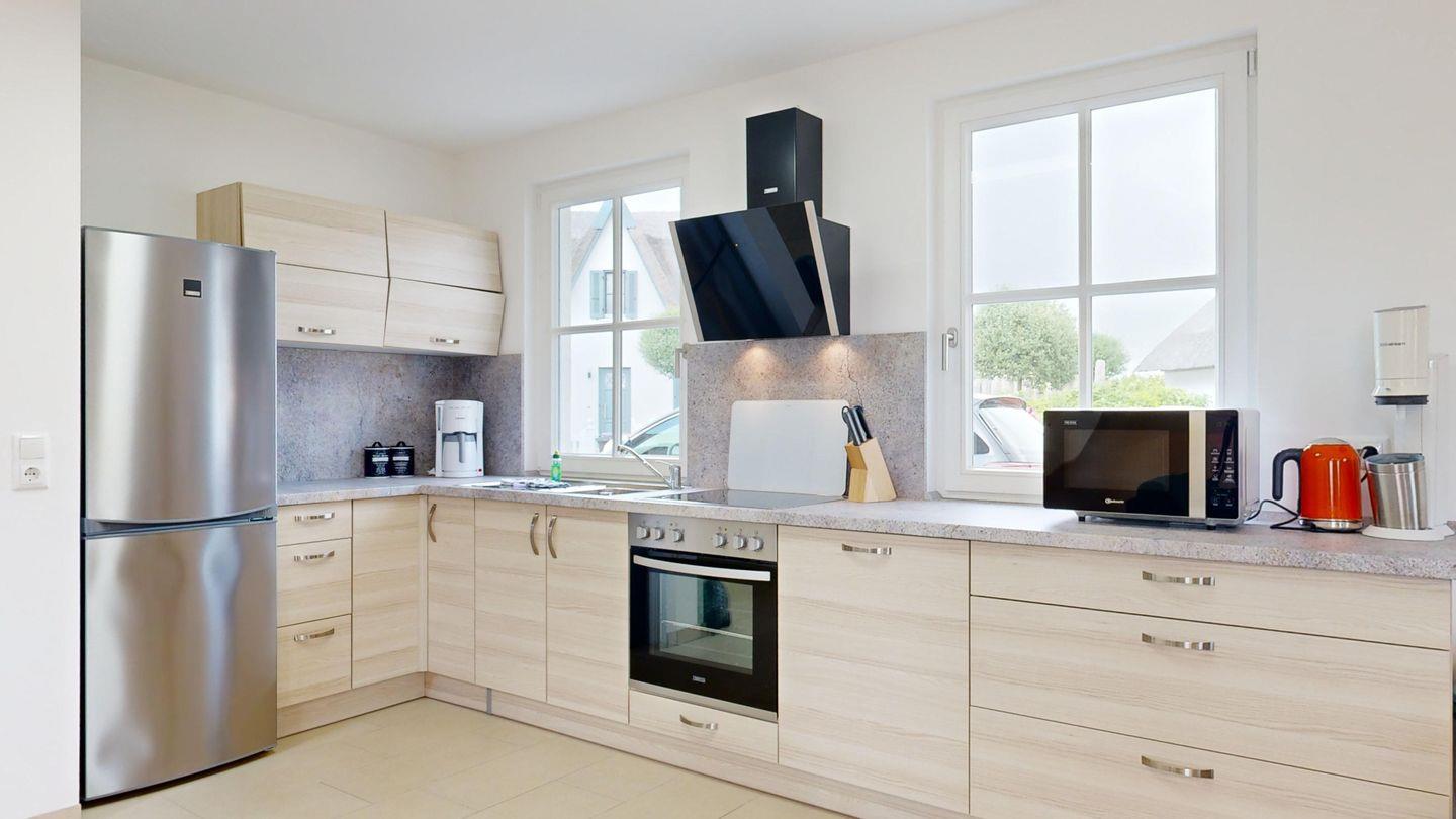 * Moderne und große Einbauküche mit Backofen, Spülmaschine, Mikrowelle, Kaffeemaschine, Toaster und Wasserkocher