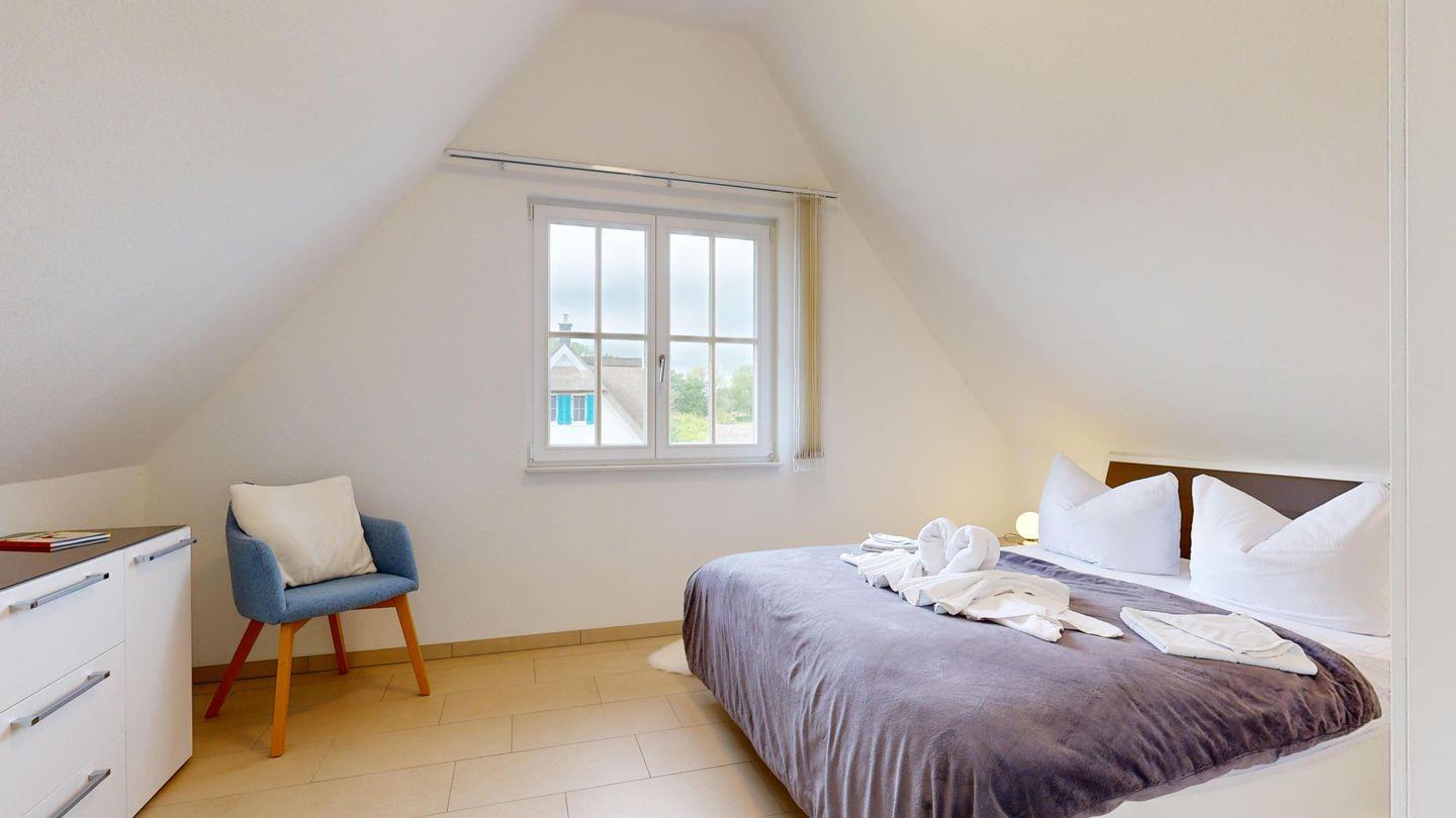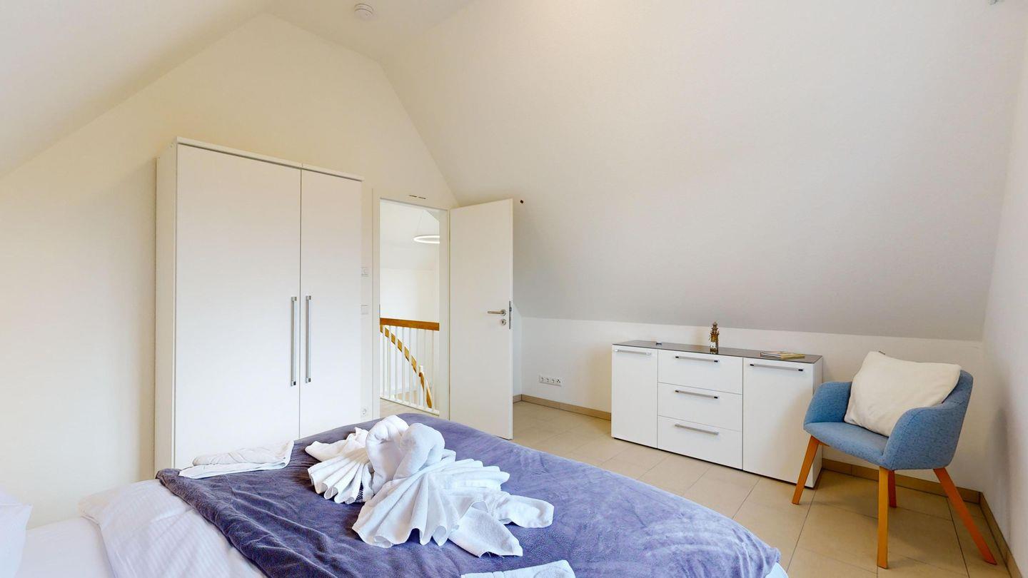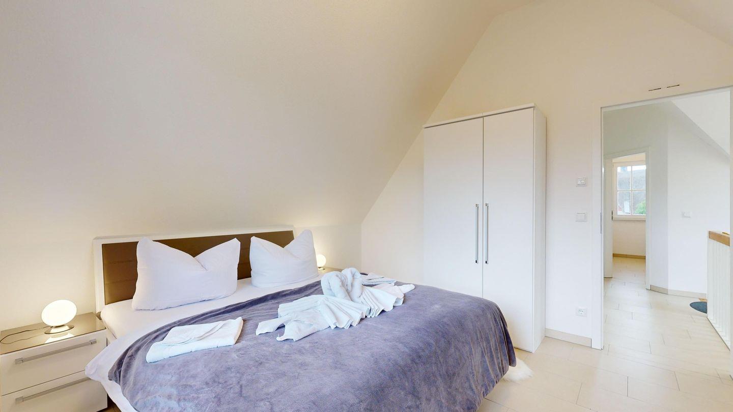 * Schlafzimmer mit Doppelbett und Kleiderschrank