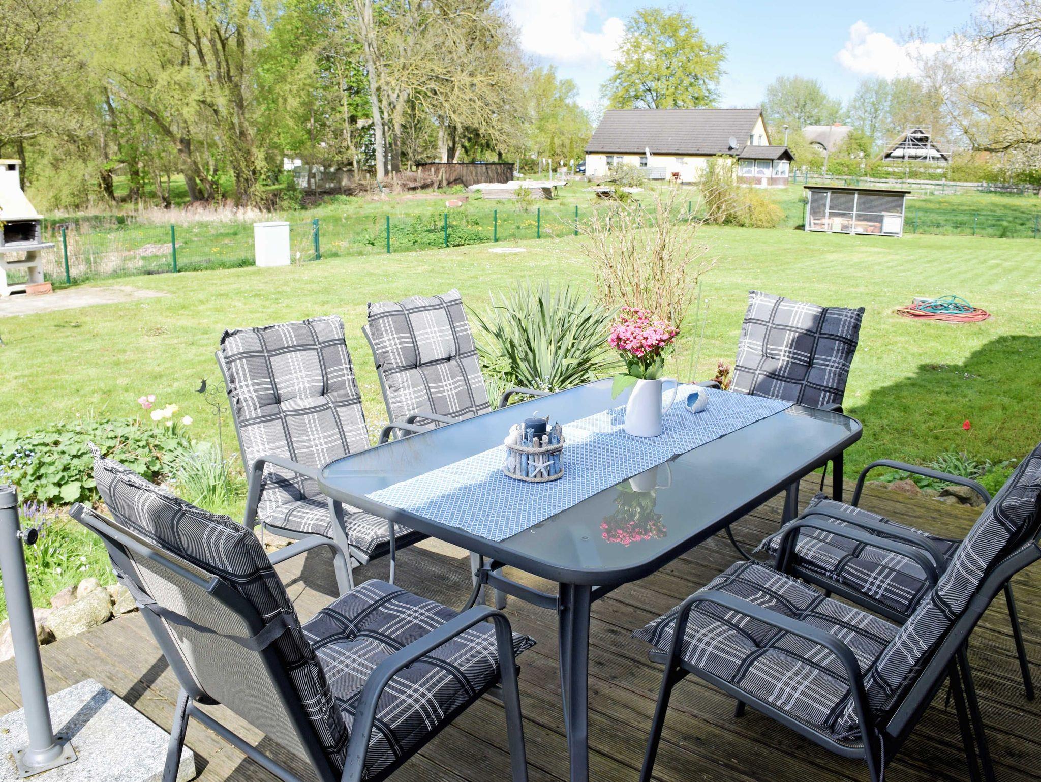 Zum diesem Ferienhaus gehört auch eine schöne Terrasse mit Gartenmöbeln und Ausblick auf das Woorker Moor, auf das Storchennest und die Hügelgräber.