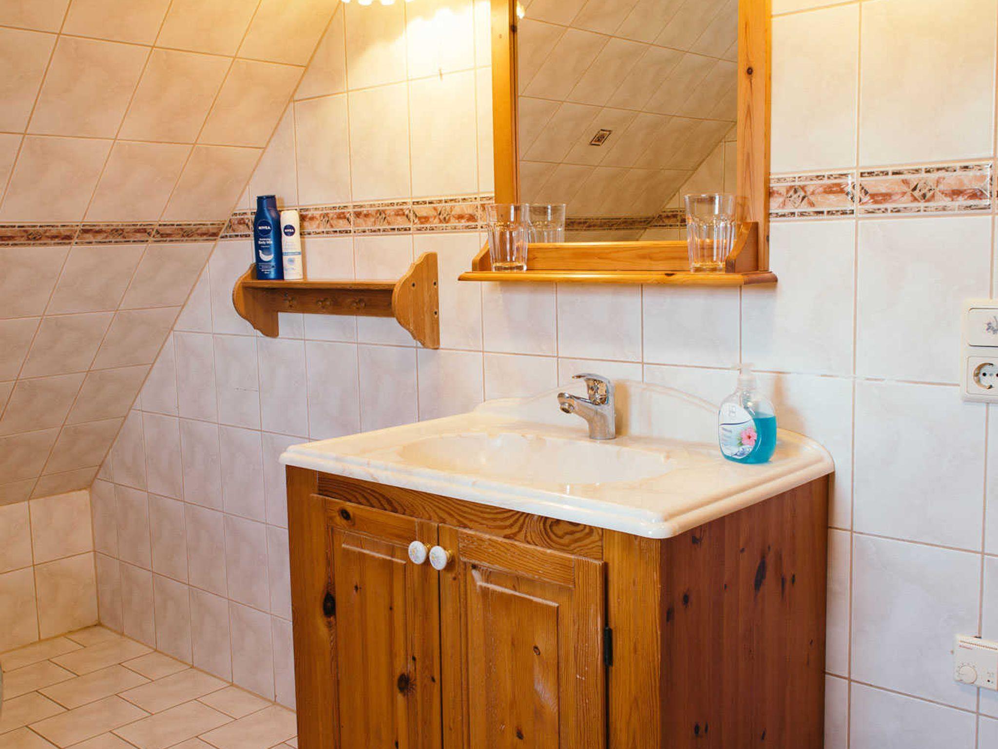 Das Bad ist mit Dusche, WC und Waschtisch ausgestattet. Es gibt weiterhin ein Gäste-WC.
