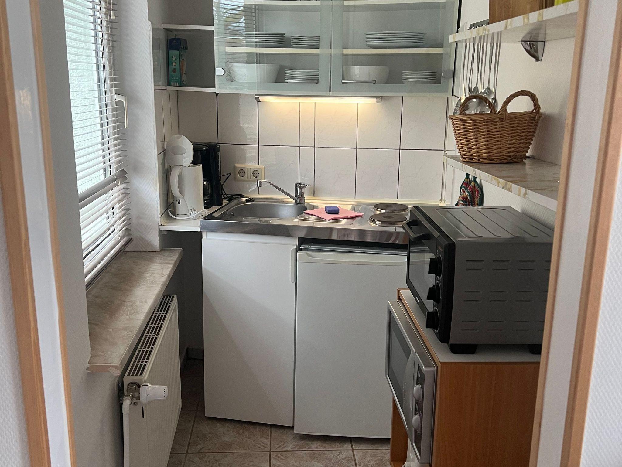 Im Wohnraum befinden sich eine bequeme Sitzcouch mit Tisch und ein modernes Flachbild-TV-Gerät. Hier steht auch ein Esstisch mit Stühlen. Die kleine Pantryküche ist mit einem Herd, Wasserkocher, Kaffeemaschine, Toaster, Mikrowelle, Grill und Kühlschrank komplett ausgestattet. Das Schlafzimmer ist mit einem bequemen Doppelbett mit Nachttischen und Leselampen sowie einem Kleiderschrank ausgestattet. Bei Ihrer Anreise sind die Betten bereits mit Bettwäsche bezogen. Das moderne Bad ist mit Dusche, WC und Waschbecken ausgestattet.