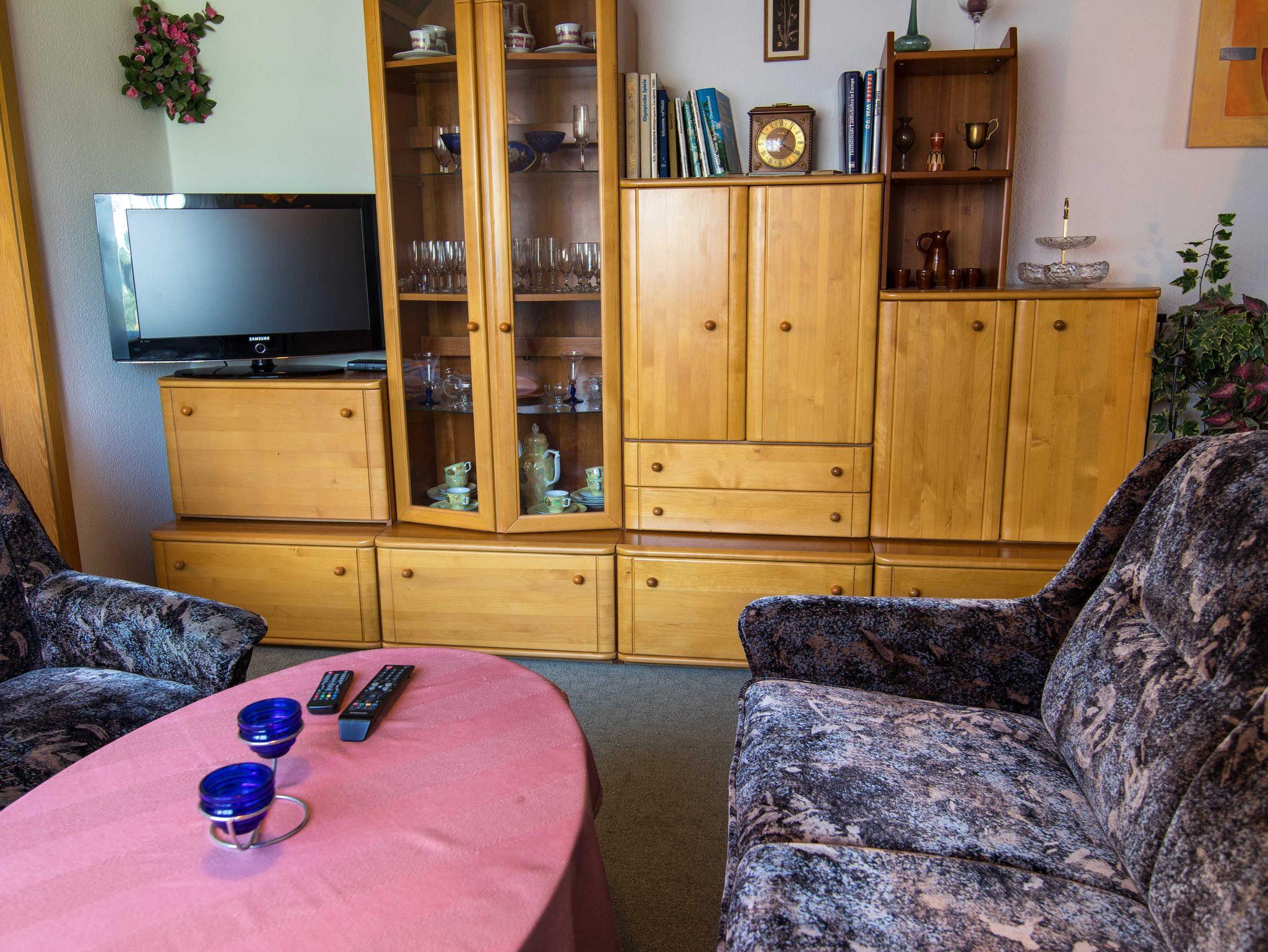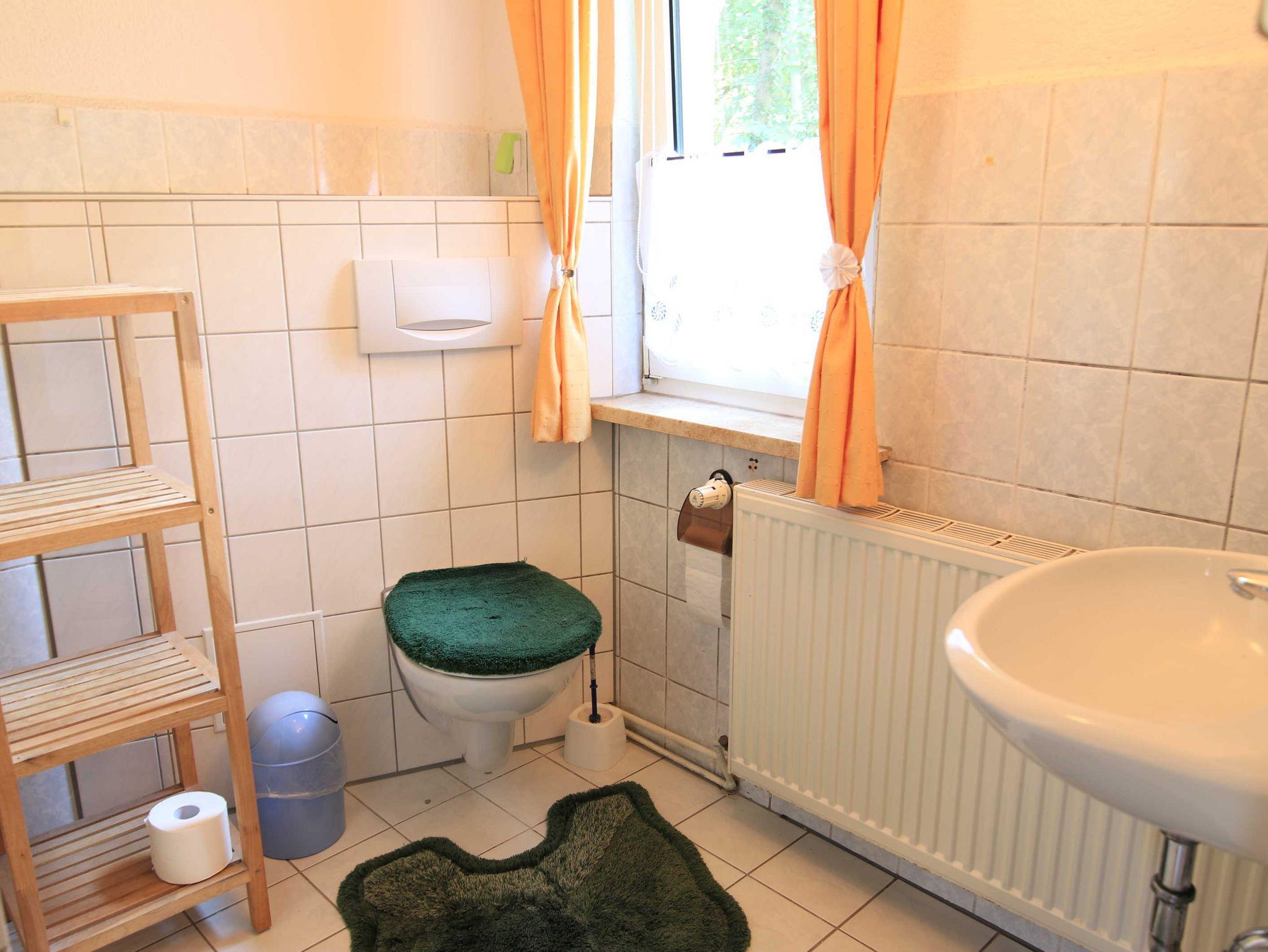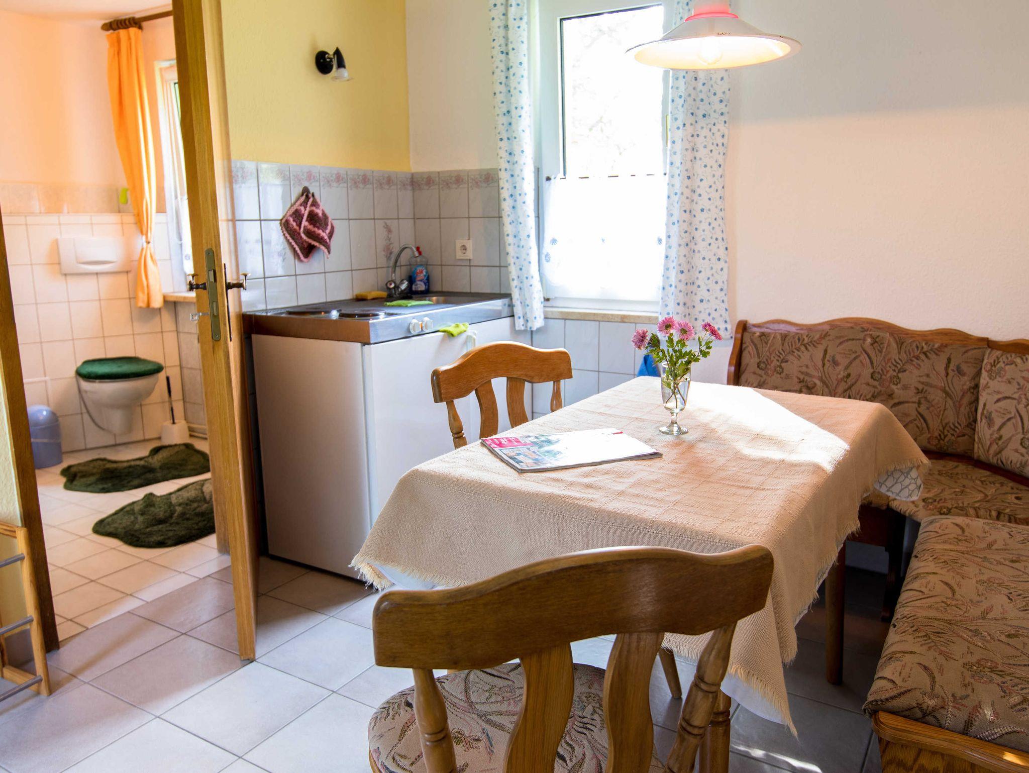 Die 70m² Ferienwohnung mit eigener Terrasse befindet sich auf dem Grundstück der Vermieter und erstreckt sich über zwei Etagen. Im Untergeschoss gibt es einen Raum, welcher zum Flur hin geöffnet ist und in dem sich die Pantryküche und die Essecke integrieren sowie das Badezimmer. Die Küche ist mit 2-Platten-Herd, Kühlschrank, Kaffeemaschine, Wasserkocher und Toaster und das Badezimmer mit einem WC und einer Dusche ausgestattet.