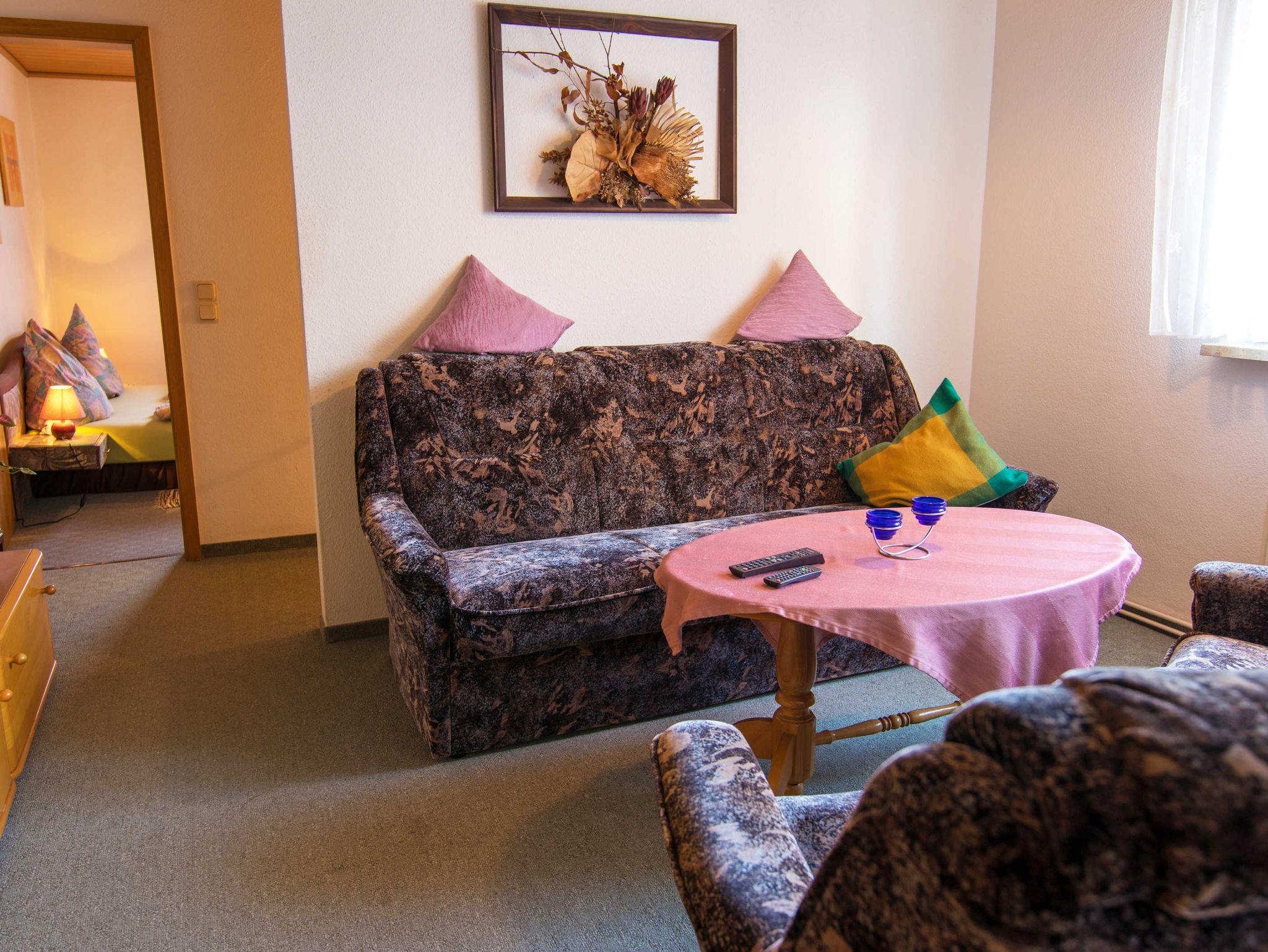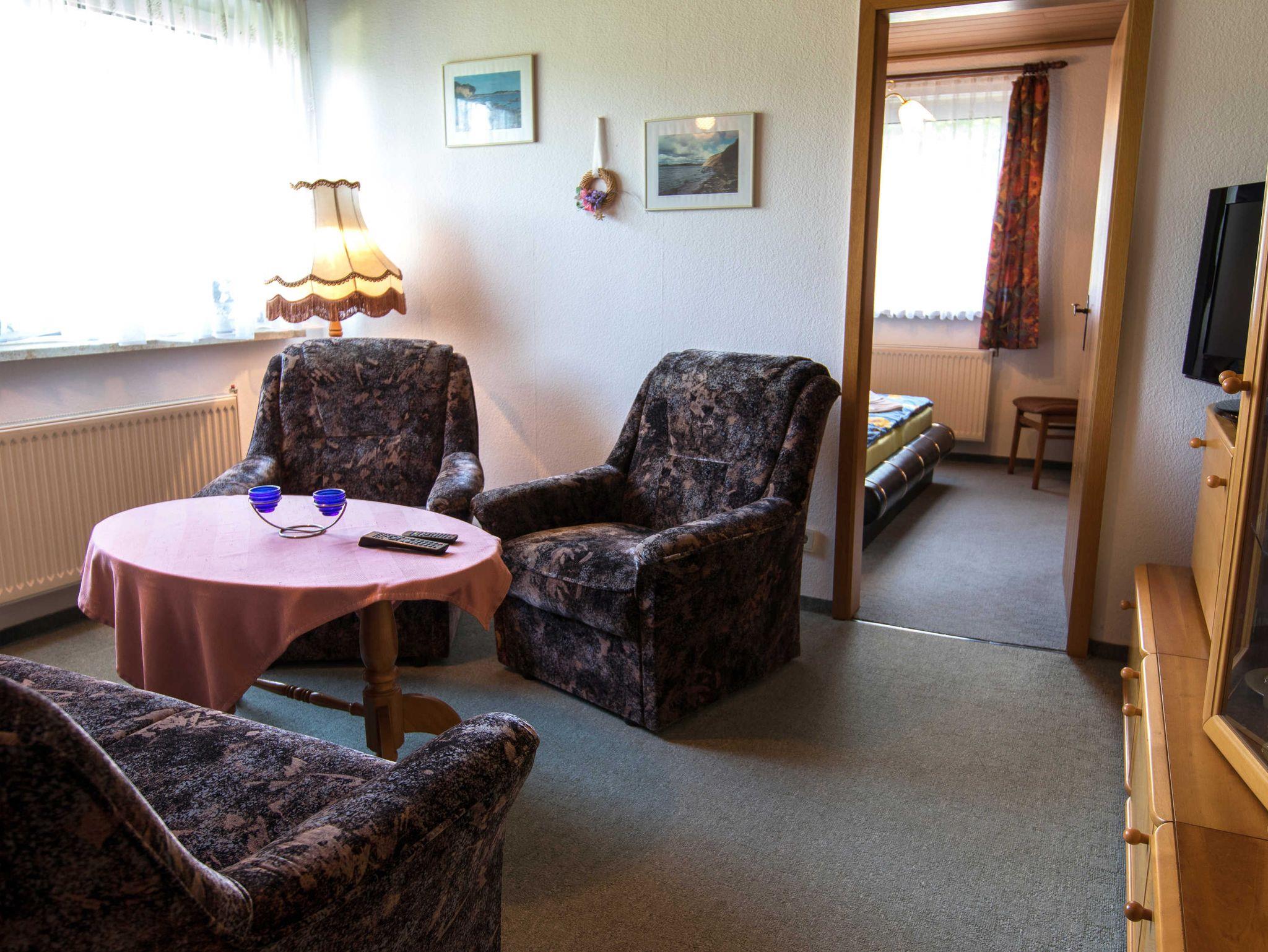 Die Dachgeschoss-Ferienwohnung befindet sich im Haupthaus und verfügt über Wohnzimmer, Doppelbett-Schlafzimmer, komplett ausgestatteter Küche und ein Bad mit Dusche und Badewanne.