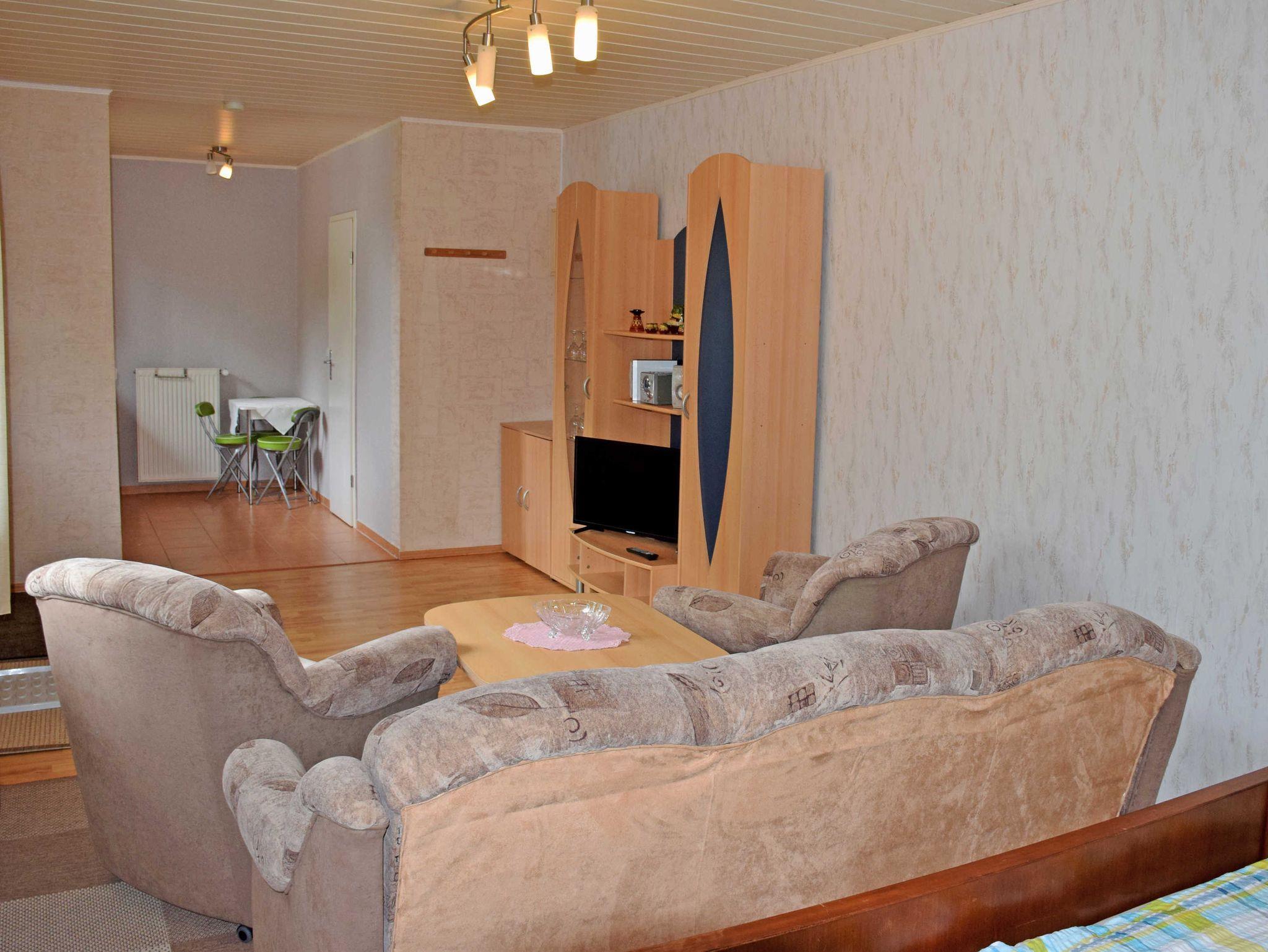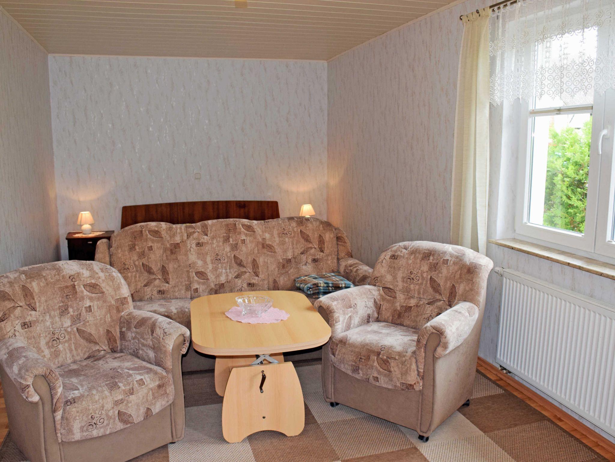 Unsere Ferienwohnung im Erdgeschoss ist ca. 30 qm groß, hat Platz für maximal 3 Gäste und wurde liebevoll und modern eingerichtet. Sie verfügt über einen separaten Eingang. In dem Wohnbereich befinden sich eine Sitzcouch mit Tisch und Sessel, Leselampe, TV-Gerät und eine Musikanlage. Die Küchenzeile im Wohnbereich ist mit einem Herd, Wasserkocher, Kaffeemaschine, Toaster und Kühlschrank ausgestattet. Dazu gehört auch ein kleiner Esstisch mit Stühlen.