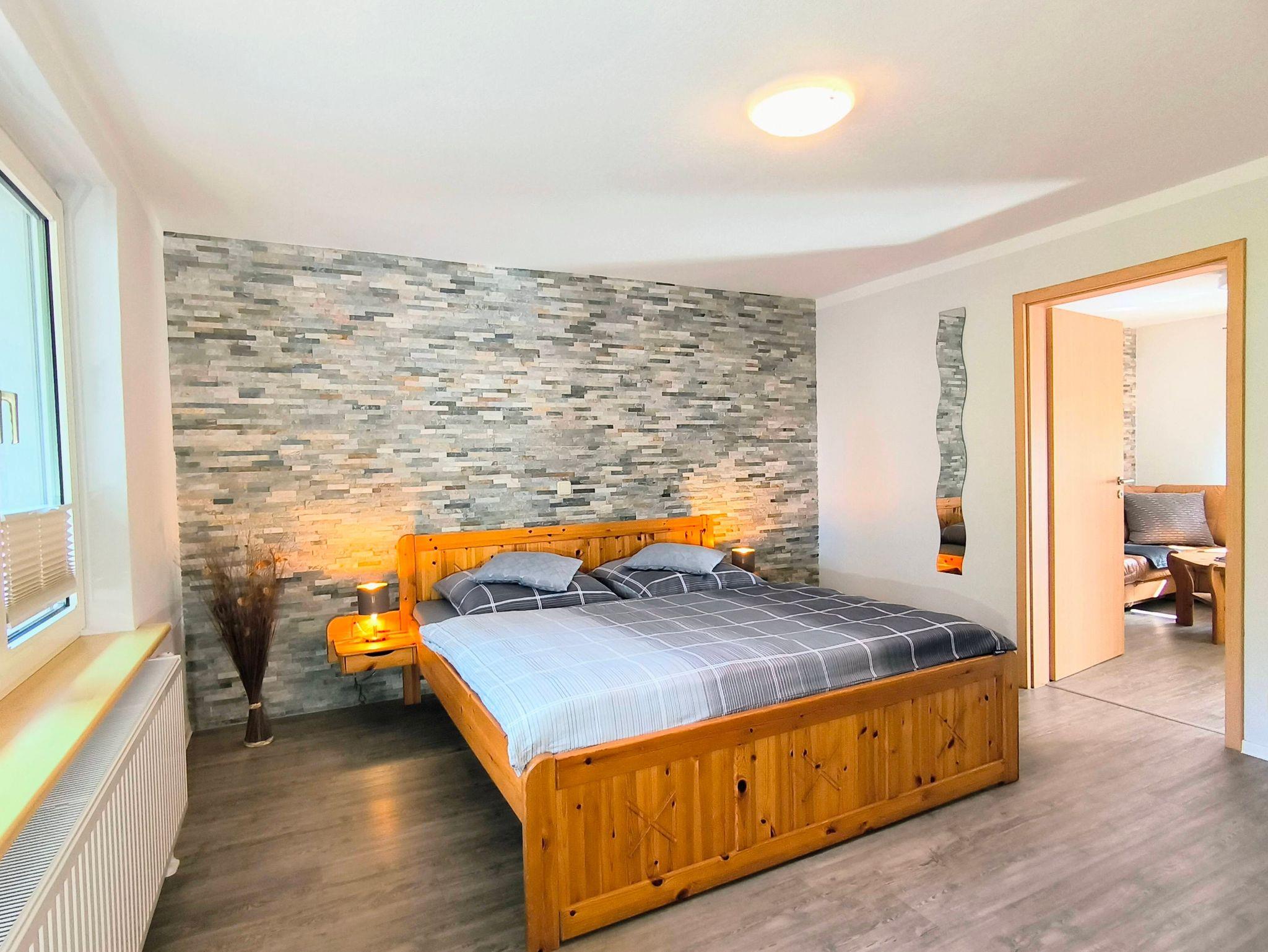 Sowie einem separatem Schlafzimmer mit Doppelbett und großem Kleiderschrank, ebenfalls aus Holz. Ein Einzelbett bzw. Liege ist bei Bedarf zustellbar.