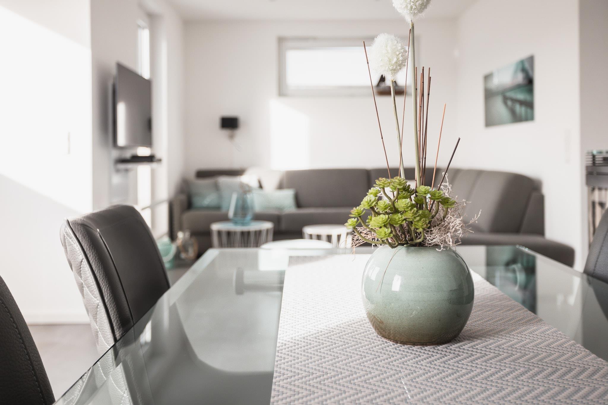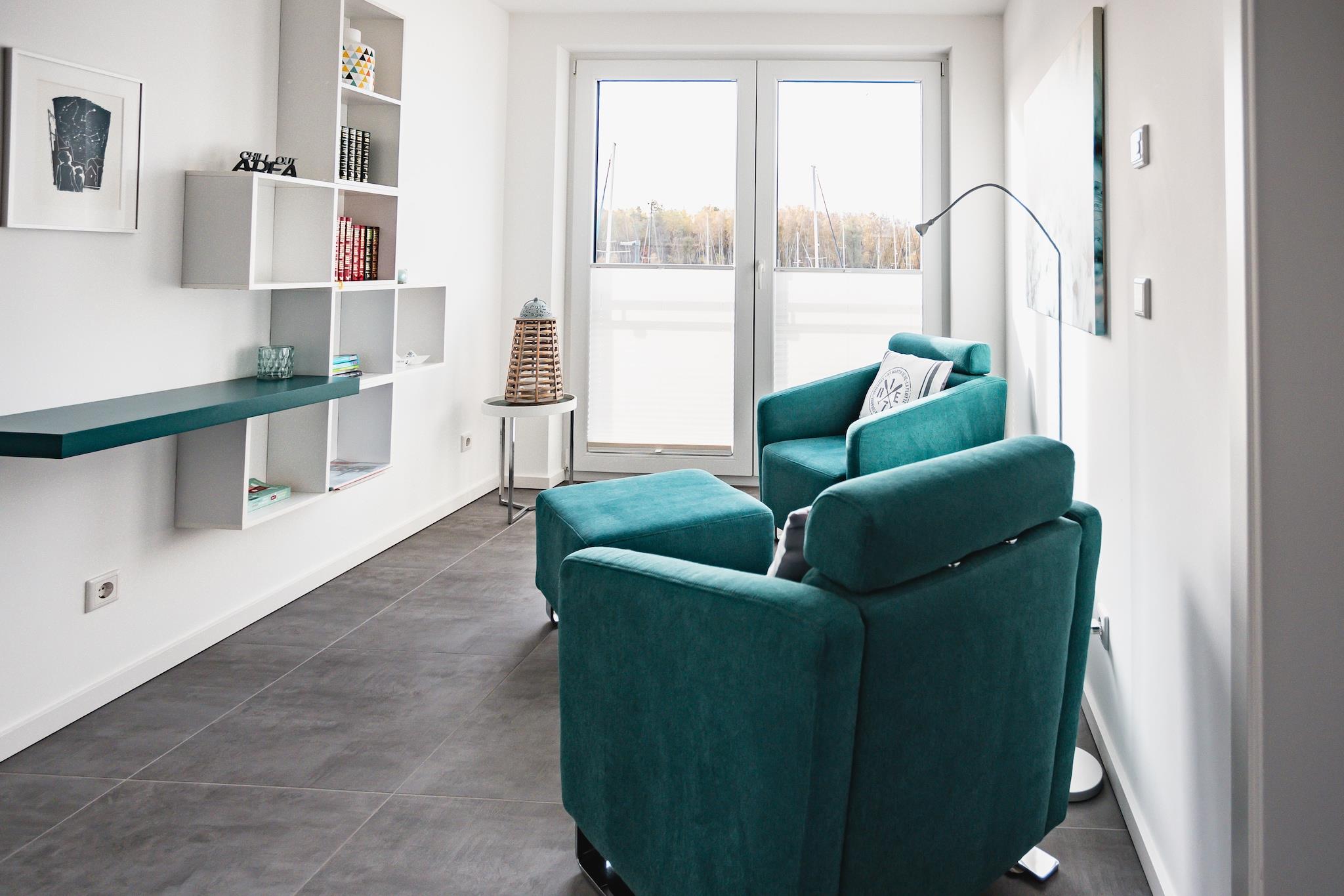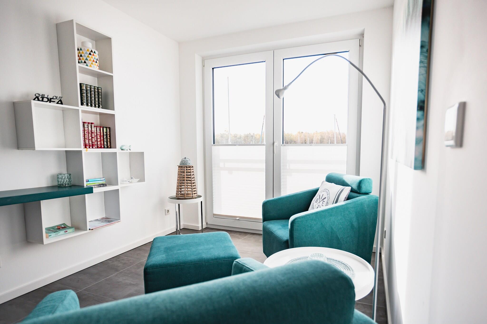 Modernes Ferienhaus mit Kamin und Hafenblick auf Usedom, ideal für erholsame Tage am Wasser.