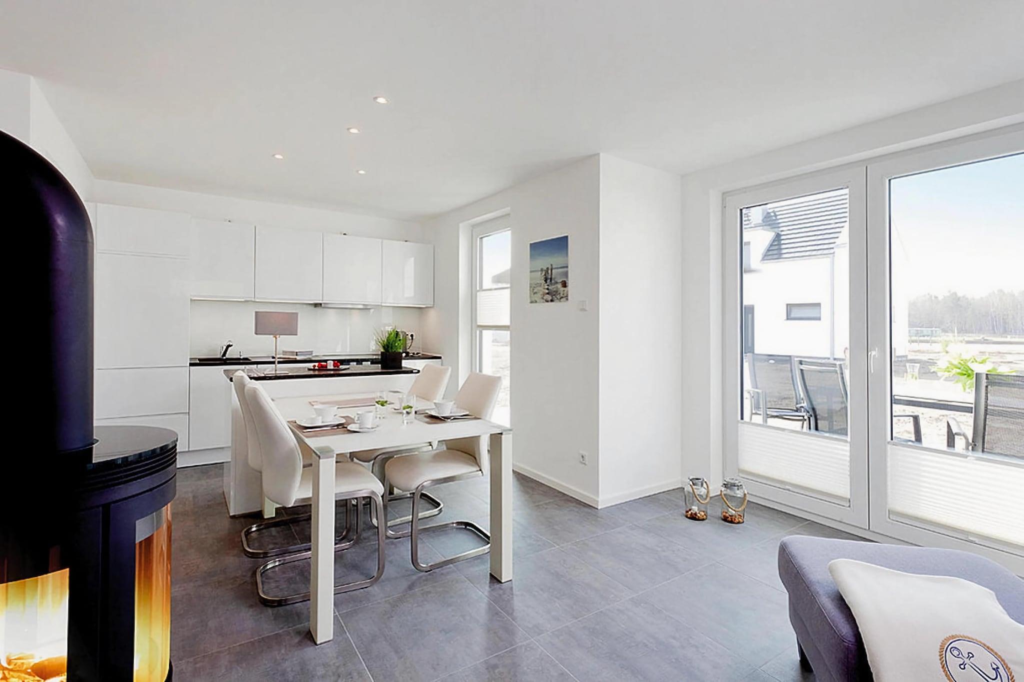 Modernes Ferienhaus in Peenemünde mit Kamin und Hafenblick direkt am Wasser für erholsamen Urlaub.