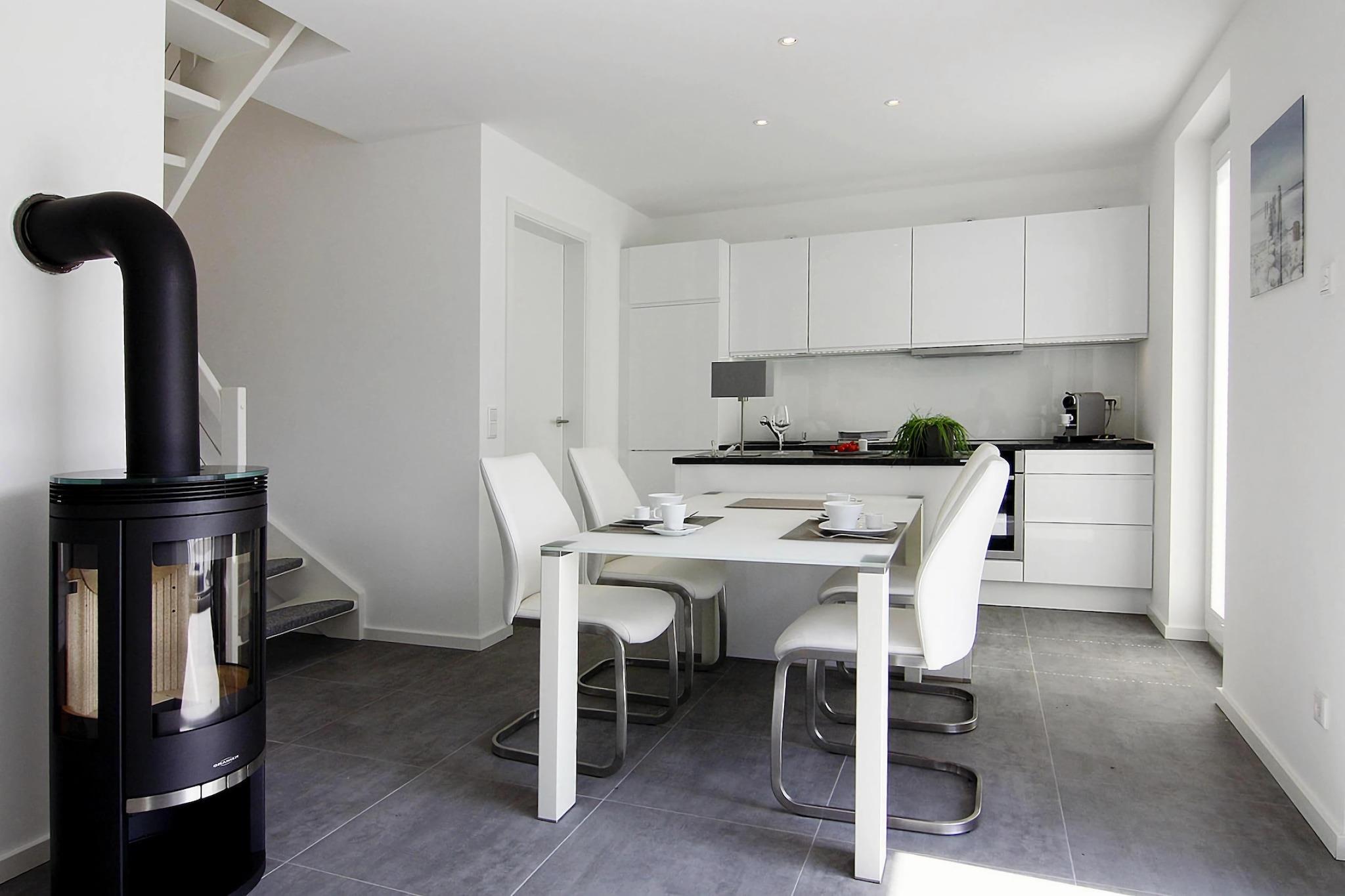 Modernes Ferienhaus mit Kamin und Hafenblick auf Usedom, ideal für entspannte Tage am Wasser.